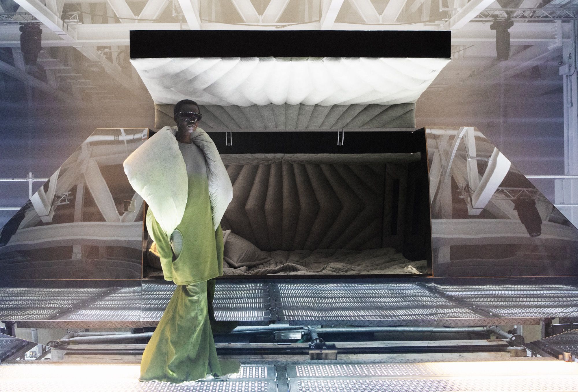 The collection features elongated silhouettes and radial-patterned padding, in a palette centered around black and dark colors, tinted cotton denim, organic cotton jersey, nylon, and cashmere, fading from blue to acid yellow. The pieces include flight jackets, puffer jackets, down jackets, and extra-long coats, as well as skirts, shorts, and tops. Buttons on the shoulders and extra openings allow for adapting long sweaters and brushed cotton tops, while denim is cut to create tunics, dresses, and skirts. Ring scarves, shaggy boots, and a quilted blanket enhance a look designed to be experienced both inside and outside the sleep pod.