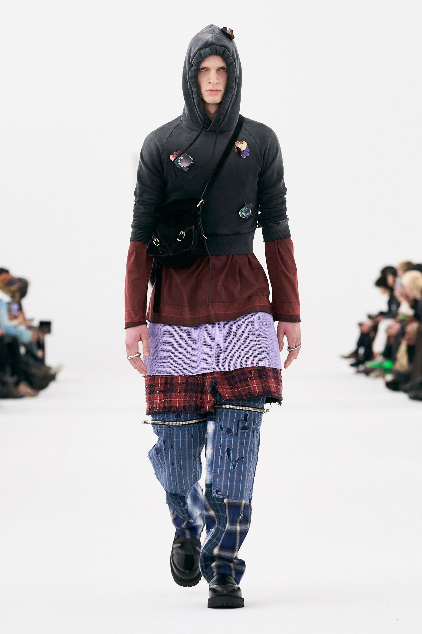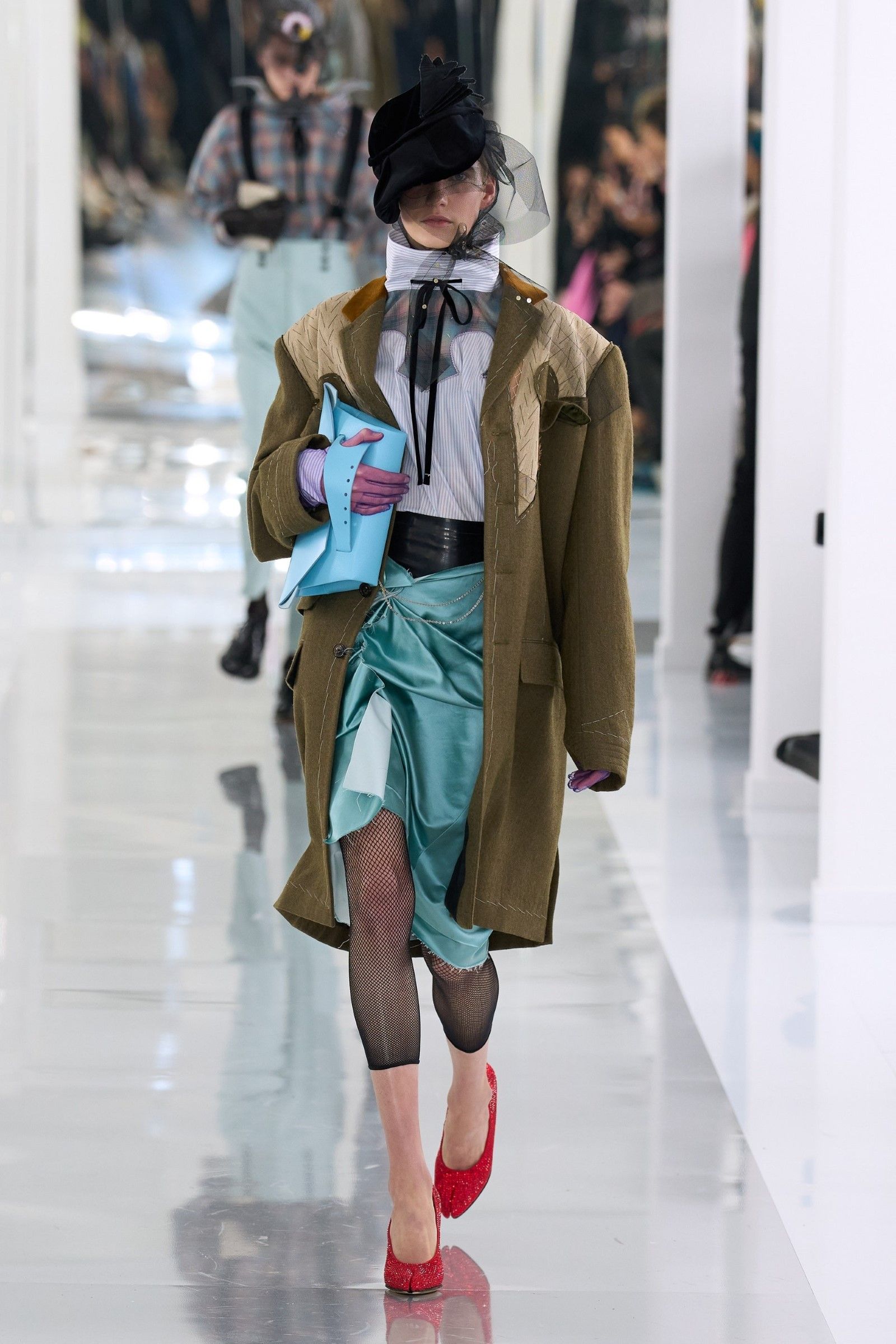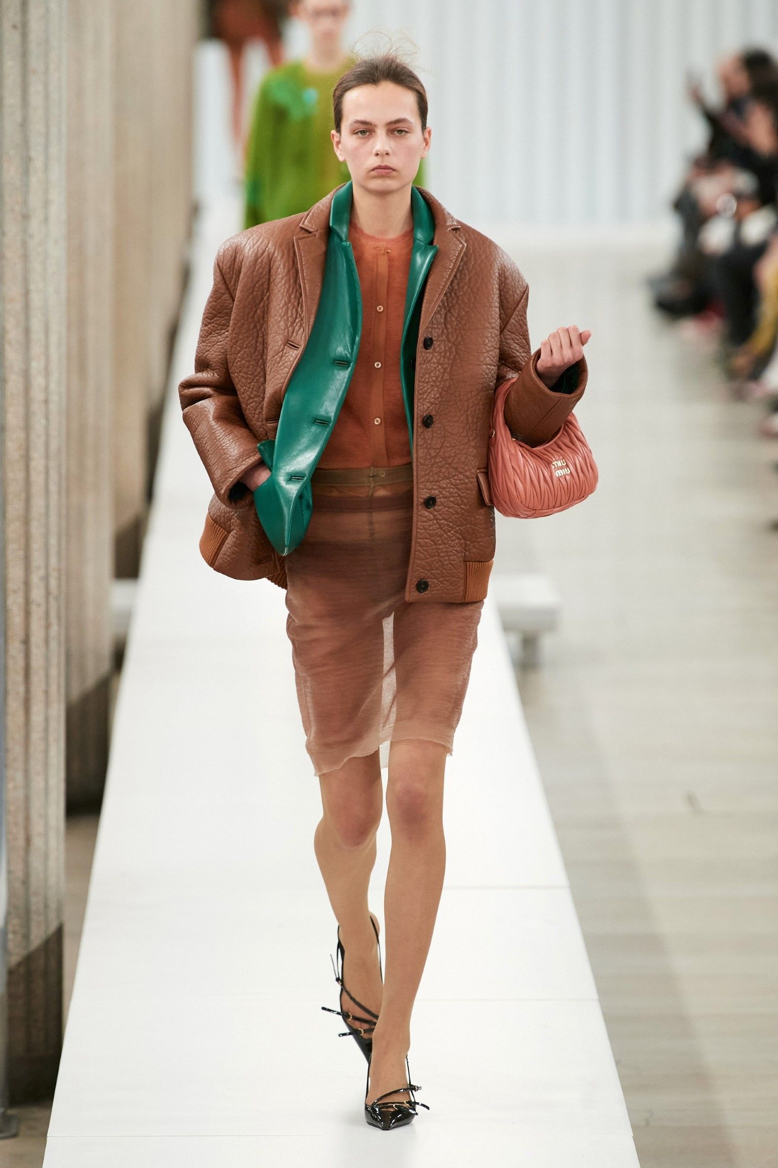 In this paragraph, we would like to talk about a more three-dimensional layering than commonly understood. That is, layering that not only involves the layering of the garments worn but also layering that takes into account deliberate transparency effects and what has seen the layers accumulate horizontally, like blocks of color, for example, in the blokecore trend that saw football jerseys with their colors and synthetic feel pairing with denim or even wool pants. In particular, this year layering has moved through textures, with combinations of thick and heavy materials and others light - elsewhere, there has been an exaltation of layering, with looks that pile up and mix numerous visible layers, highlighted by rich and opulent drapes or an emphasis on open buttons and cut-outs revealing the underlying clothes. The prize goes to Miu Miu with its wild mix of transparent skirts and blouses topped with huge textured leather blazers.