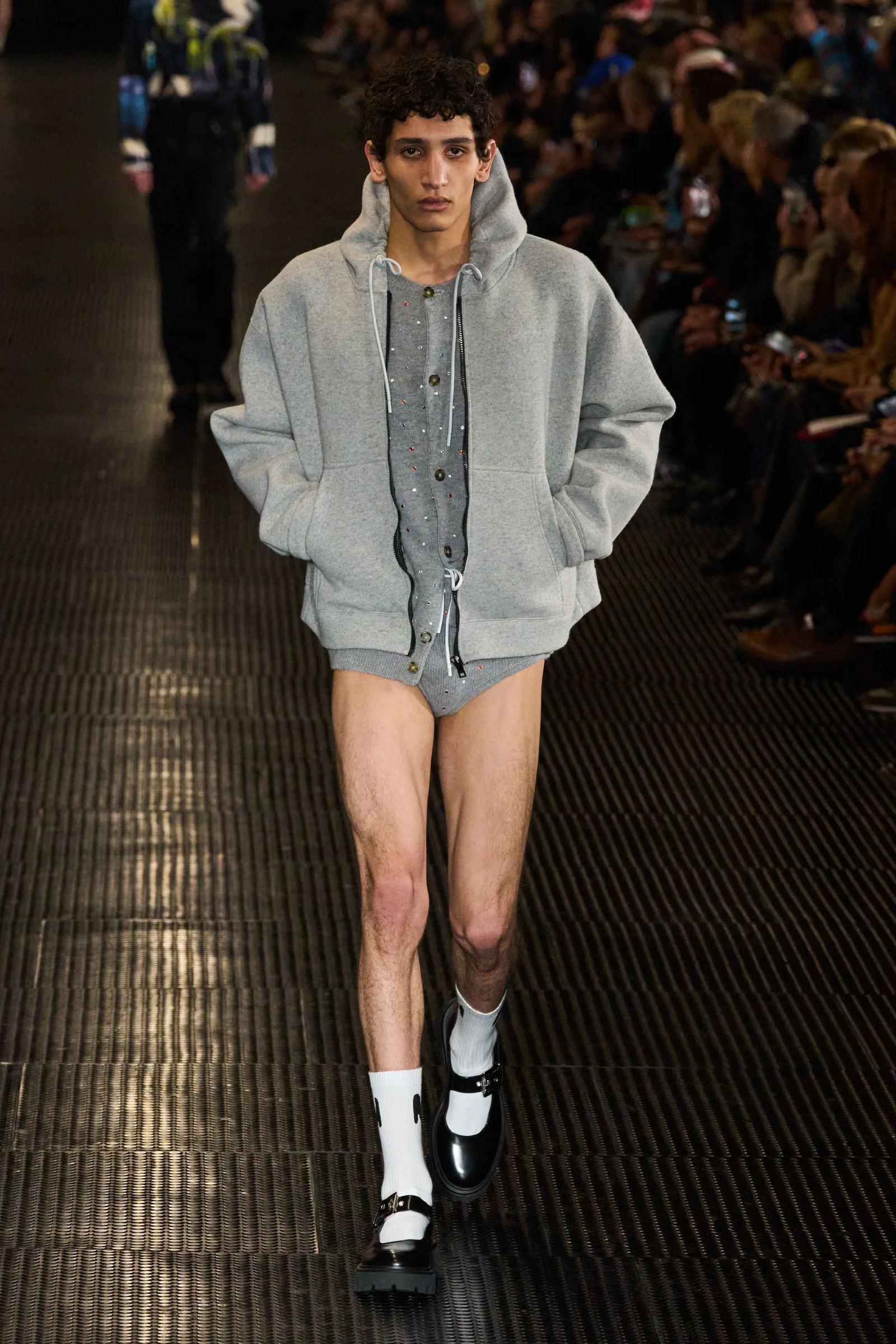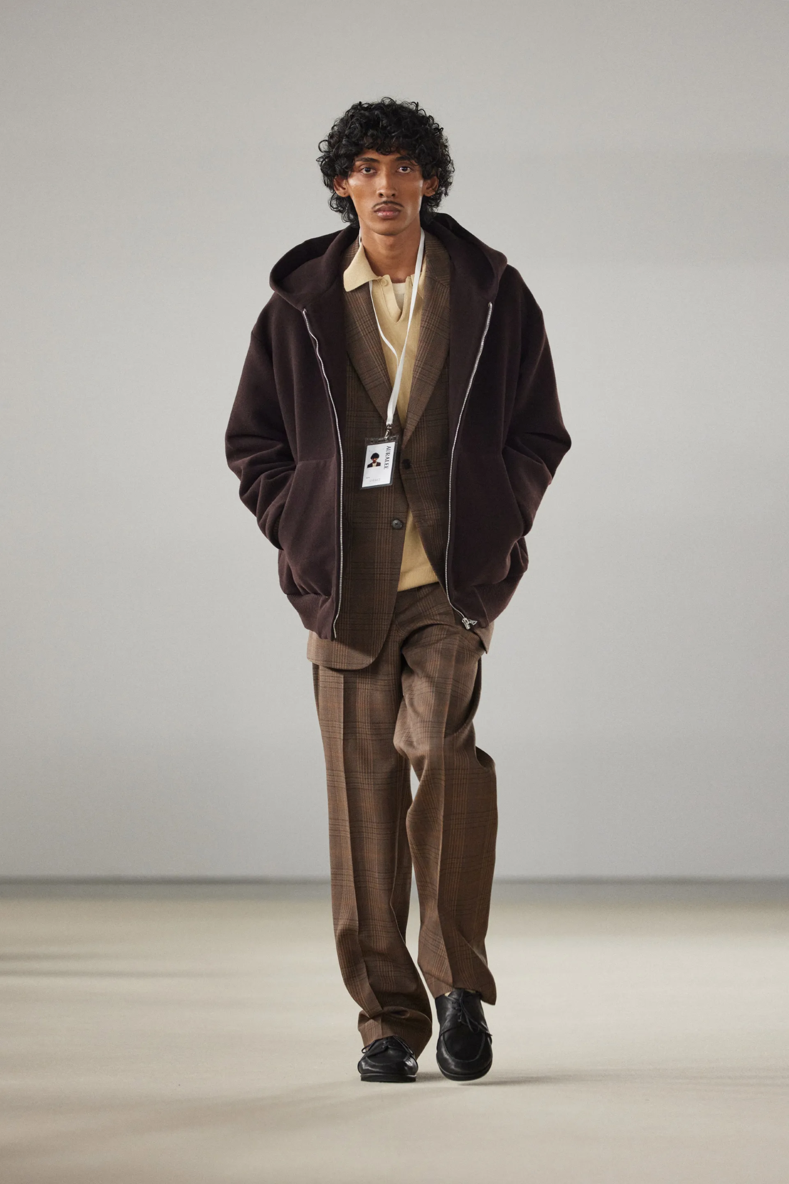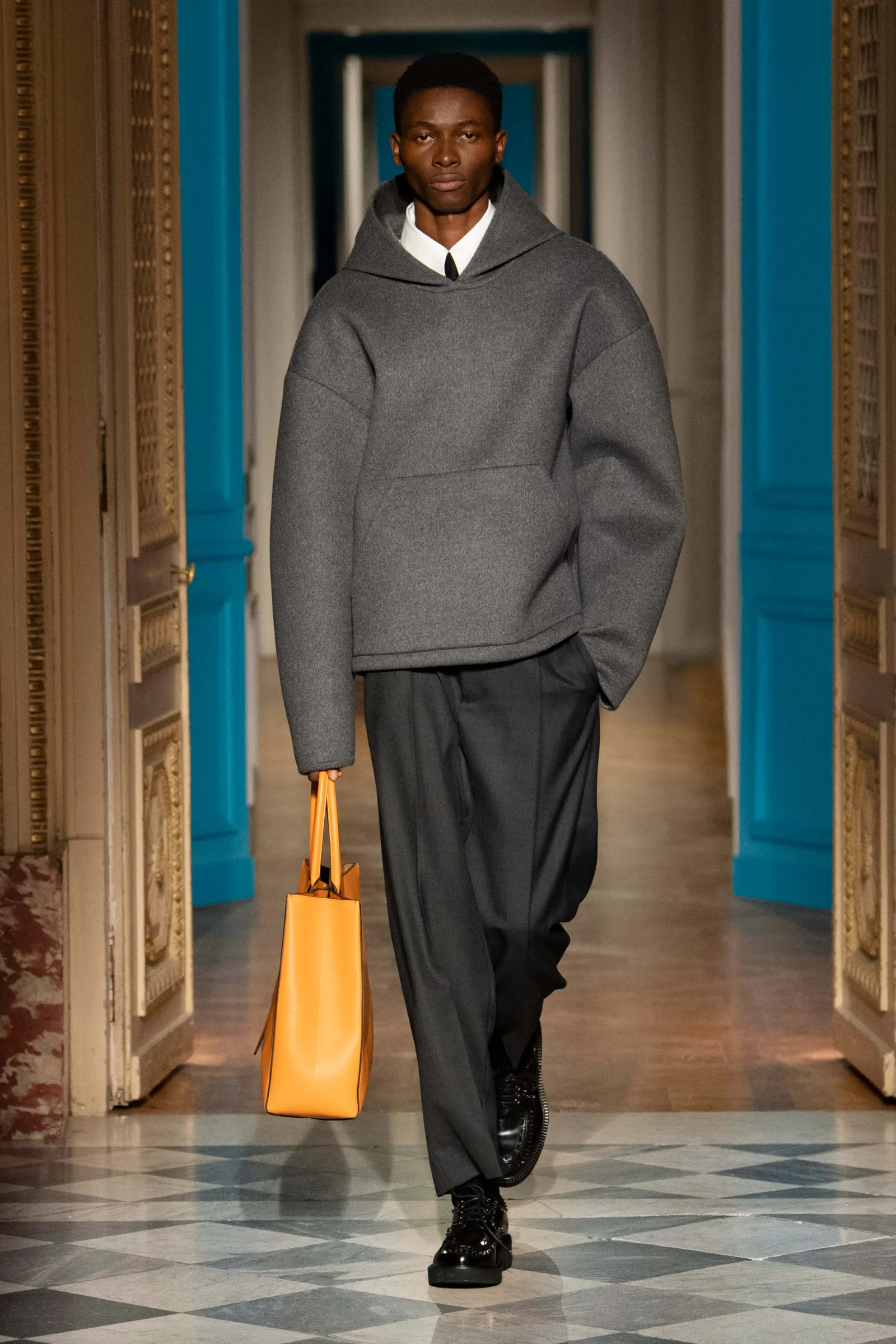 The same applies to hooded jackets, always present at Valentino with the same voluminous and "self-supporting" shapes in denim version. It's important to note here that we're not referring to jackets that externally appear as padded puffer jackets but adopt the model of the Carhartt WIP Active Jacket. Similar operations have been carried out by Dion Lee, Hermès, Louis Vuitton, and Our Legacy for the Stussy collection; more daringly, brands like Auralee, Balenciaga, Doublet, and MSGM have turned the oversized zip-up into a genuine outerwear piece (the best was Ryota Iwai of Auralee, who paired it with a formal suit), while Nigo, for Kenzo, used a neoprene-like material for a high-necked hoodie without a hood. The change, considering that many brands still don't know how to pull the hoodie out of the category of easy cash grabs, is more than welcome - perhaps it will be the cornerstone of that new contemporary sartorial wardrobe that many menswear designers are talking about today.