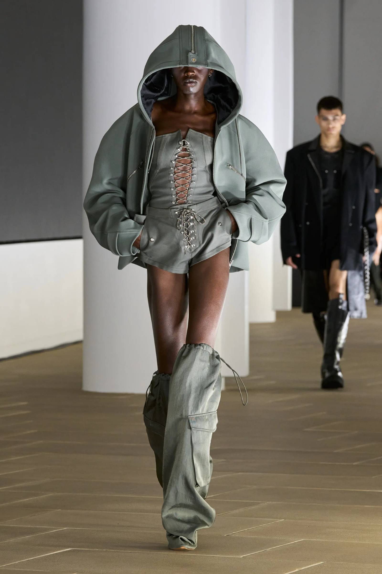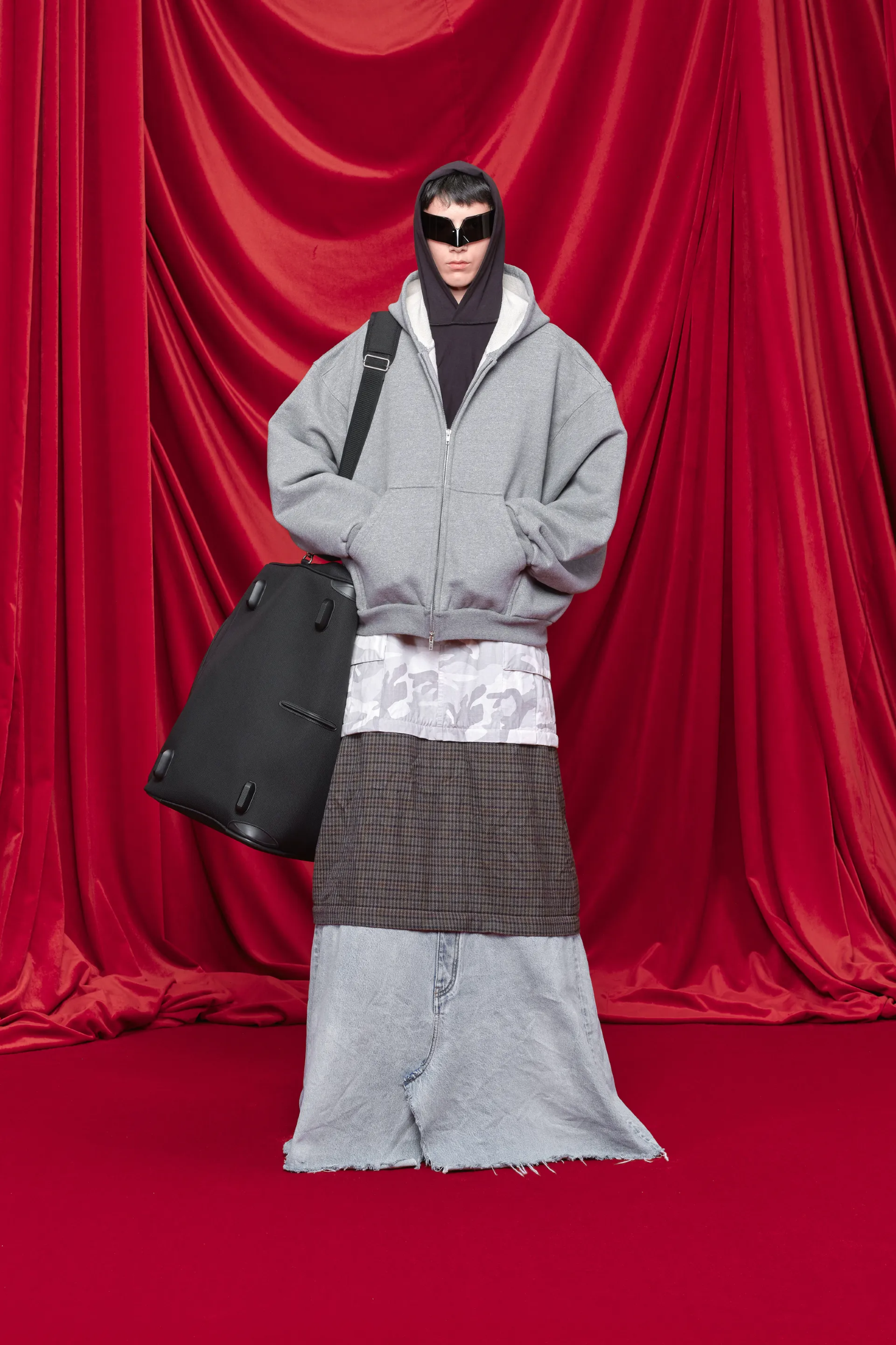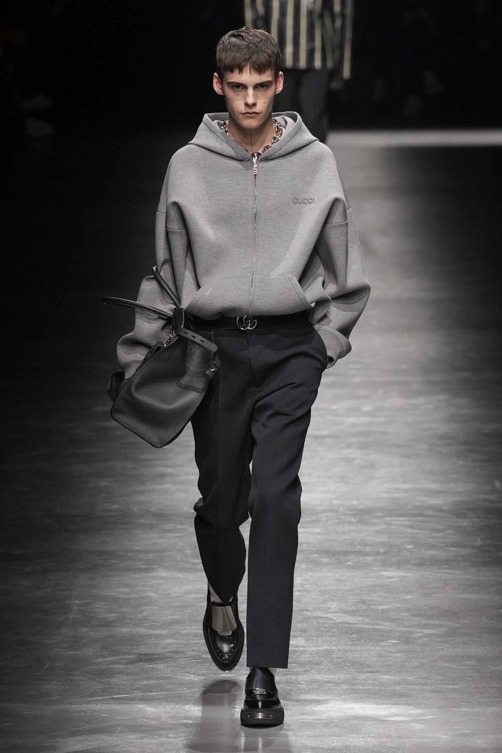 The world of fashion has recently had an obsession with workwear - and this for a variety of reasons, including the popularity and versatility of this type of clothing, but also for the style of its finishes, robust materials, generous volumes, and its fundamentally protective nature. The workwear craze has taken over almost every conceivable category, including the most ubiquitous, everyday garment: the hoodie, which is increasingly becoming a true design piece rather than just a commercial branding vehicle. The first brand to propose this shift was Miu Miu with a collection presented in Paris last March, where numerous jackets and sweatshirts reminiscent of Carhartt WIP classics became a playground between construction robustness and finishing delicacy. Among these, a zip-up hoodie and a jacket with rigid, structured hoods anticipated by at least one season a small boom of hoodies and hooded jackets characterized by ample fit, substantial fabrics, and vaguely rounded proportions. In addition to Miu Miu's, we've seen the compact gray hoodie from Gucci, in the latest men's collection from Valentino, a similar hoodie served as a layering element in different looks with a redesigned hood and neckline to showcase collars and turtlenecks; also, Louis Vuitton featured a jacket with a robust hood in the SS24 show this summer and a neoprene zip-up in the Pre-Fall 2024 in Hong Kong. But examples are numerous: the common thread in all of them is the presence of a hood that stands on its own, both on sweatshirts and outerwear, and the presence of models of, for lack of a better term, industrial origin. But why?