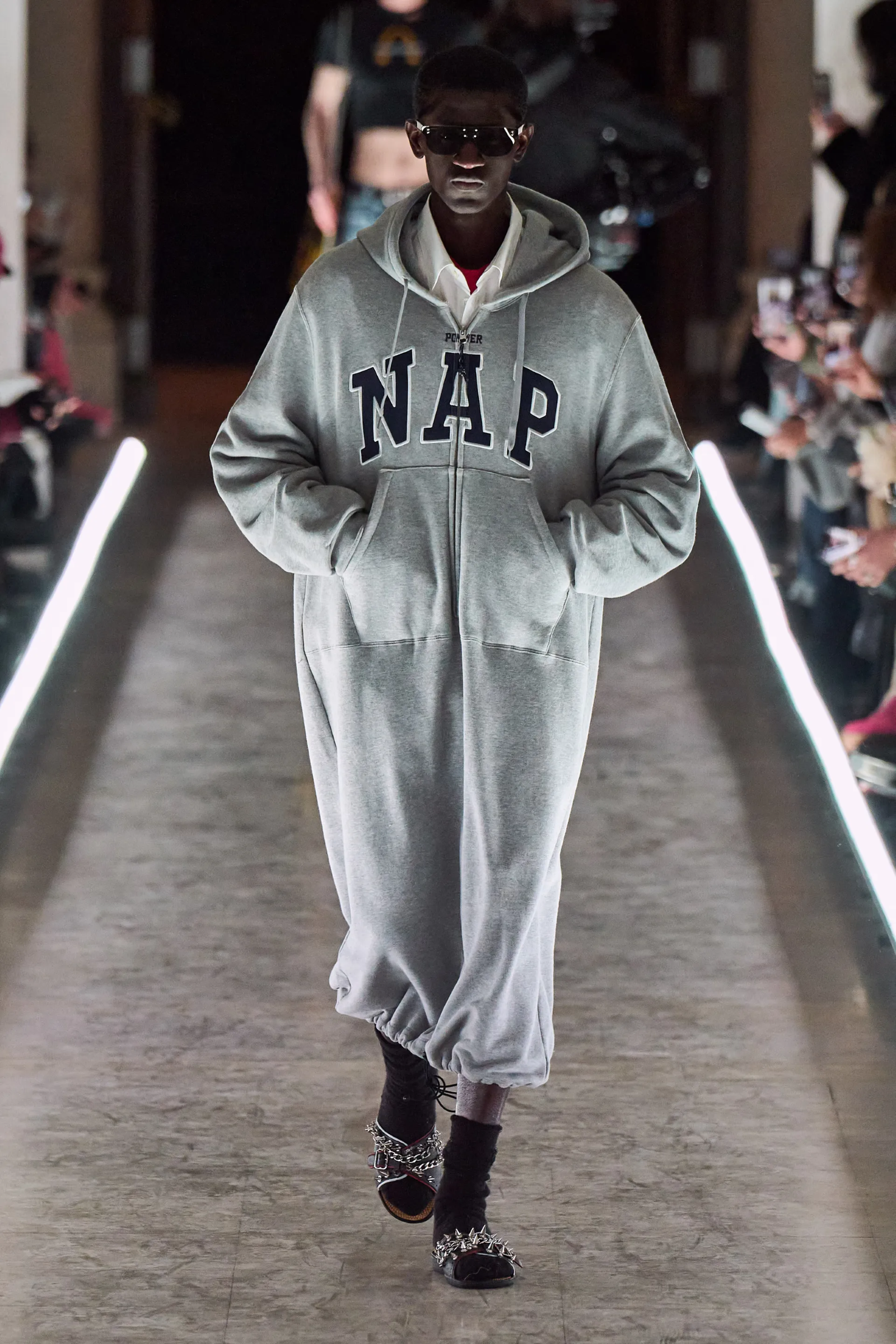 The most likely hypothesis about the recent (and still ongoing) transformation of hoodies into luxury items concerns materials and the perception of their value. It is undeniable that the major theme of 2023, and obviously also of this year, has been the attempt to enhance the craftsmanship and fabrics of classic garments to emphasize their value - a value that the spread of secondhand, economic crisis, the saturation of alternative-to-luxury brands, and the proliferation of gray markets have seriously questioned. Why pay €1300 for a hoodie if the cotton is fundamentally the same as Uniqlo's? The dilemma is pressing - especially because the younger generations more sensitive to quality discourse have quickly discovered that, regarding hoodies, there are ultra-niche classic brands offering the highest possible quality, such as Camber and Russell Athletic, especially if vintage and produced in the '90s. Therefore, it is necessary to showcase the value of the hoodie not only through the logo, as done in the past, but through a material (neoprene, silk-blend cotton, wool-based fabrics, and even pure leather in the case of Bottega Veneta) that feels more solid to the touch and is distinguishable from "normal" hoodies, that is more performant, and that, in general, justifies a luxury price beyond a simple label and possesses a more clearly sculptural silhouette. Anyone who wears a hoodie paying attention to its fit and construction will tell you that a hood that falls flat, devoid of any volume, is the first sign of a poor product or, at a minimum, an uninteresting one. The same can be said for other elements that determine its wearability, depending on the presence or absence of elastic, the distribution of proportions. Many fast-fashion hoodies, in fact, have a tendency to "fall" lifelessly, hanging loosely, while today a more compact and defined silhouette is generally favored, as well as materials that ennoble it.