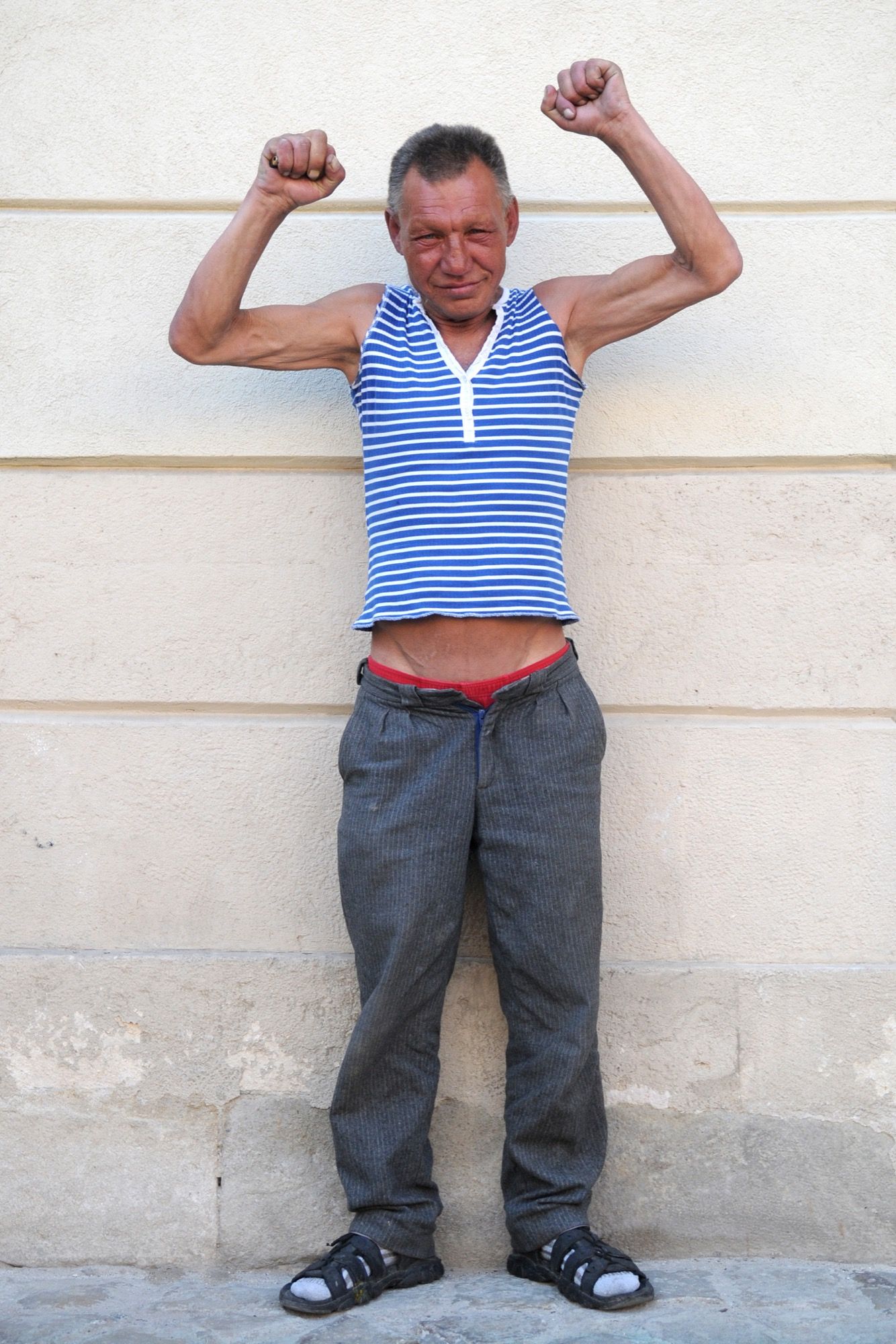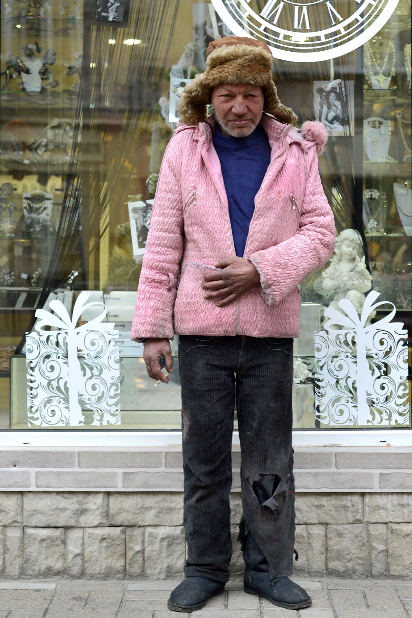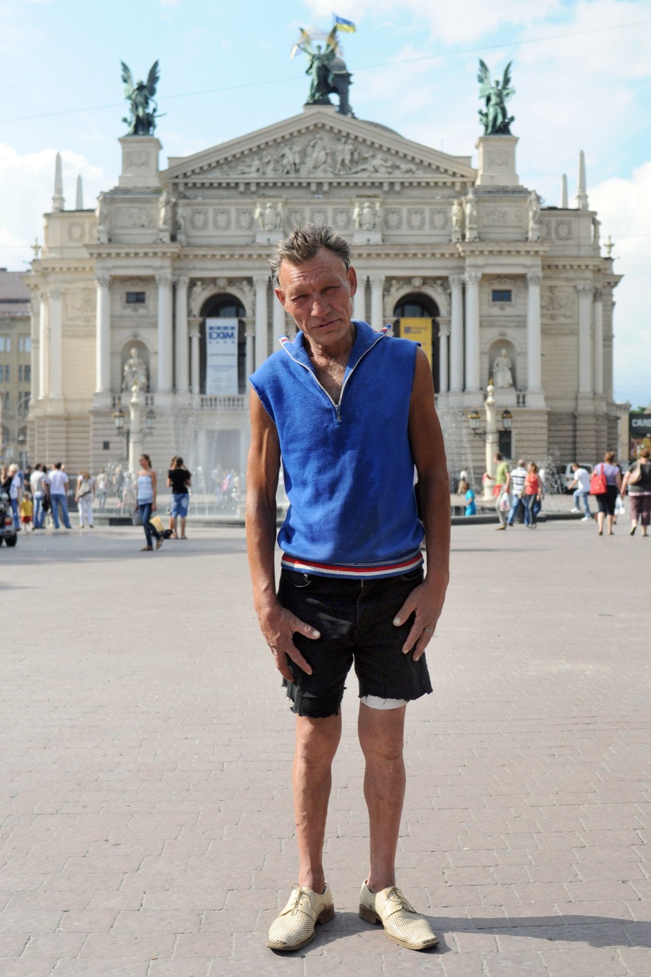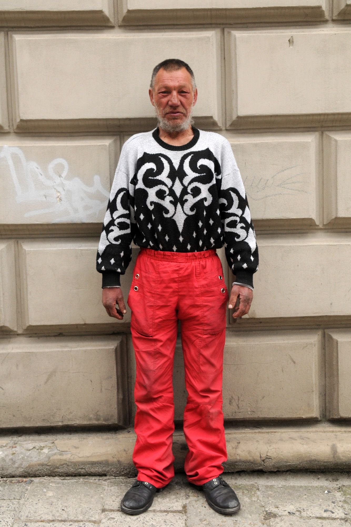Describing how he met Slavik, the man protagonist of the collection realized over two years, Dyachyshyn points out that the city center of Lviv is populated by tourists and eccentrics. «I kept running into him on the street, but I didn't yet know what would come out of it,» he says. Slavik’s Fashion follows the His Dreams project, centered around another homeless character roaming the Ukrainian streets, Andrew. «It was an important project so I didn't want to start something new hastily,» the photographer emphasizes, but Slavik's exuberant and unexpected style immediately struck him. «I noticed he was constantly changing, so I decided to collect his fashionable looks.» A true collection, the project realized by Dyachyshyn in the heart of Lviv documents the protagonist's outfits through casual encounters until he lost track of him. They didn't arrange to meet, he explains, his style was simply always interesting, so it didn't matter if he saw him once a week or once a month. «I believe Slavik wore the costumes for a reason: it was his performance, and the fact that someone noticed him made him happy,» Dyachyshyn adds, recounting how, at a certain point in the project, the two would search for each other on the streets of Lviv. «Sometimes, while going somewhere for work, I would hear behind me: 'Hey buddy, where have you been? I've been looking for you for two days'.»