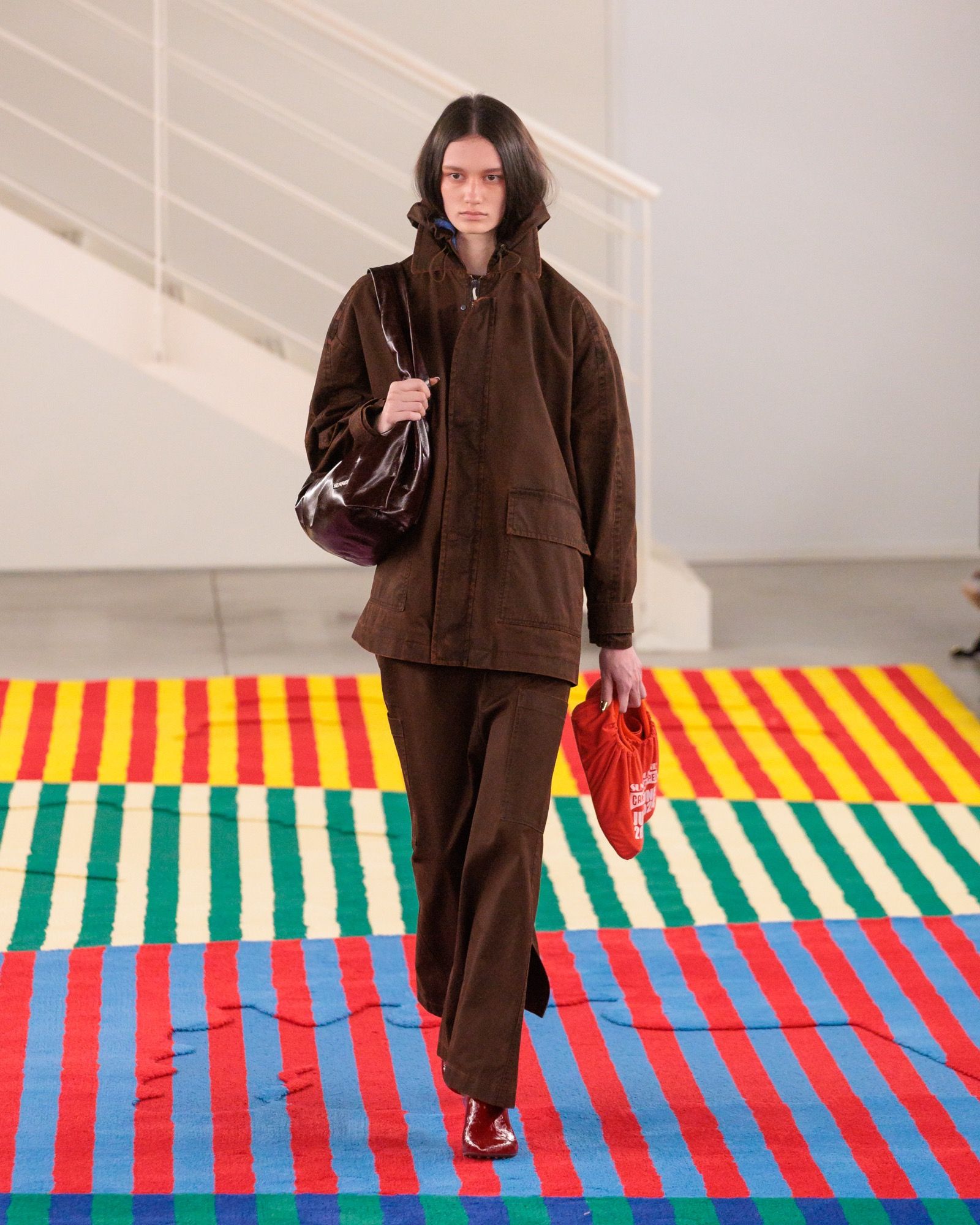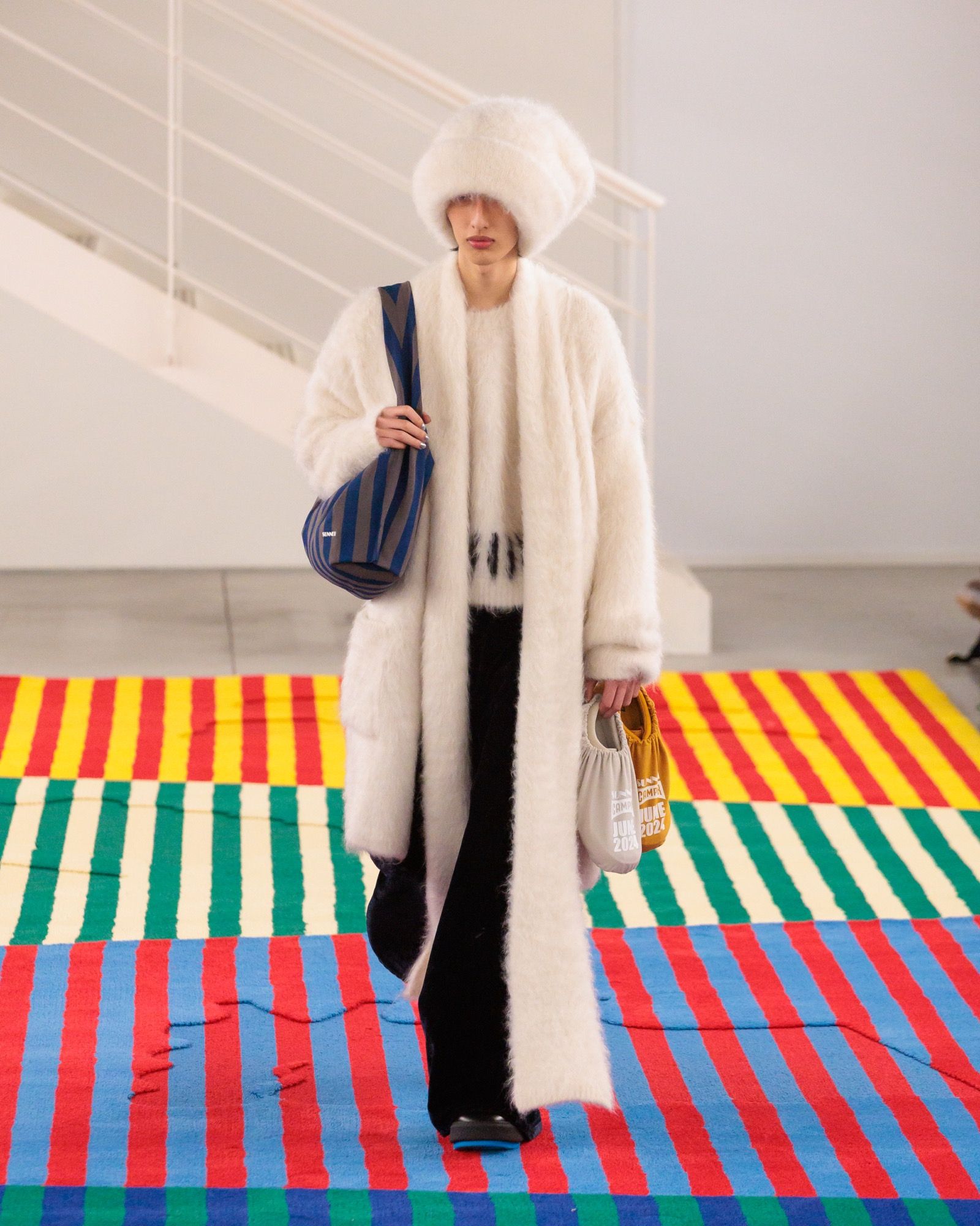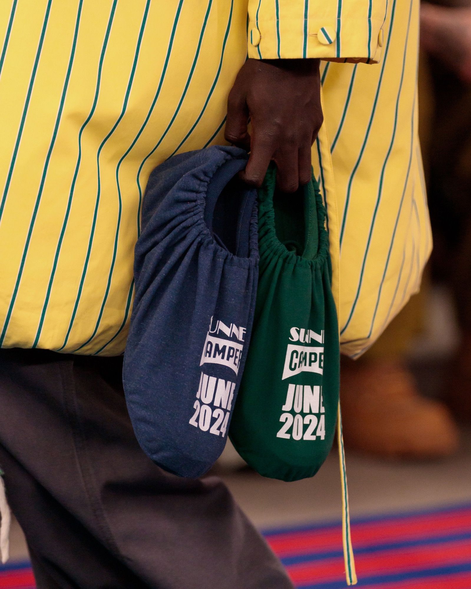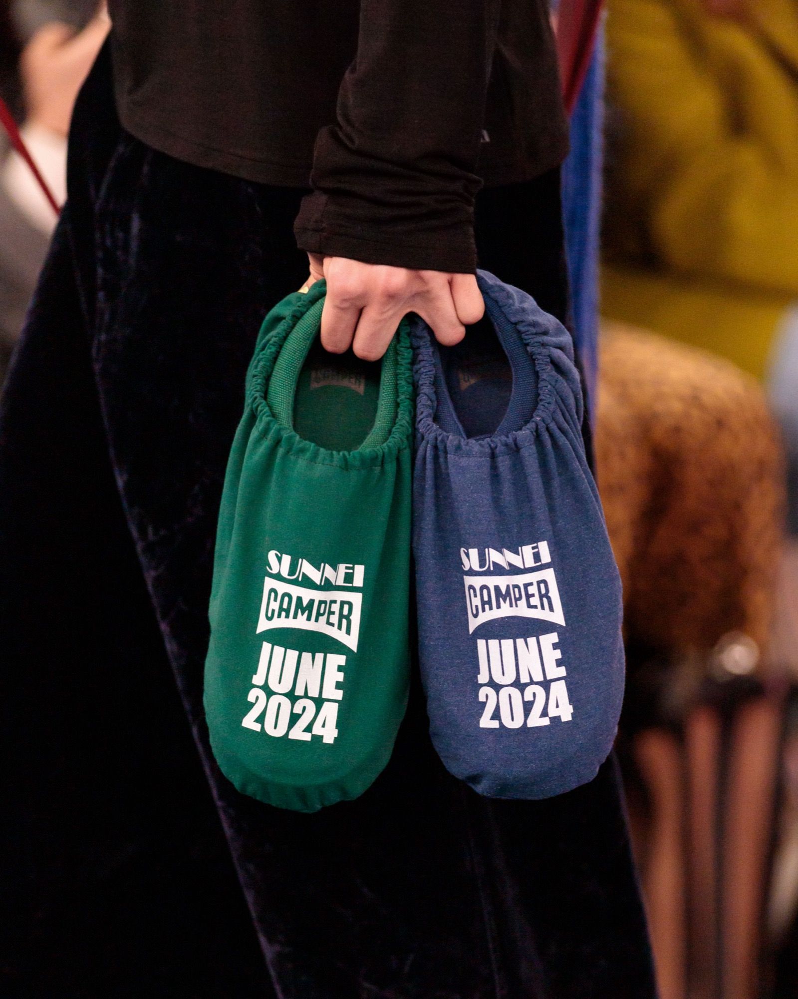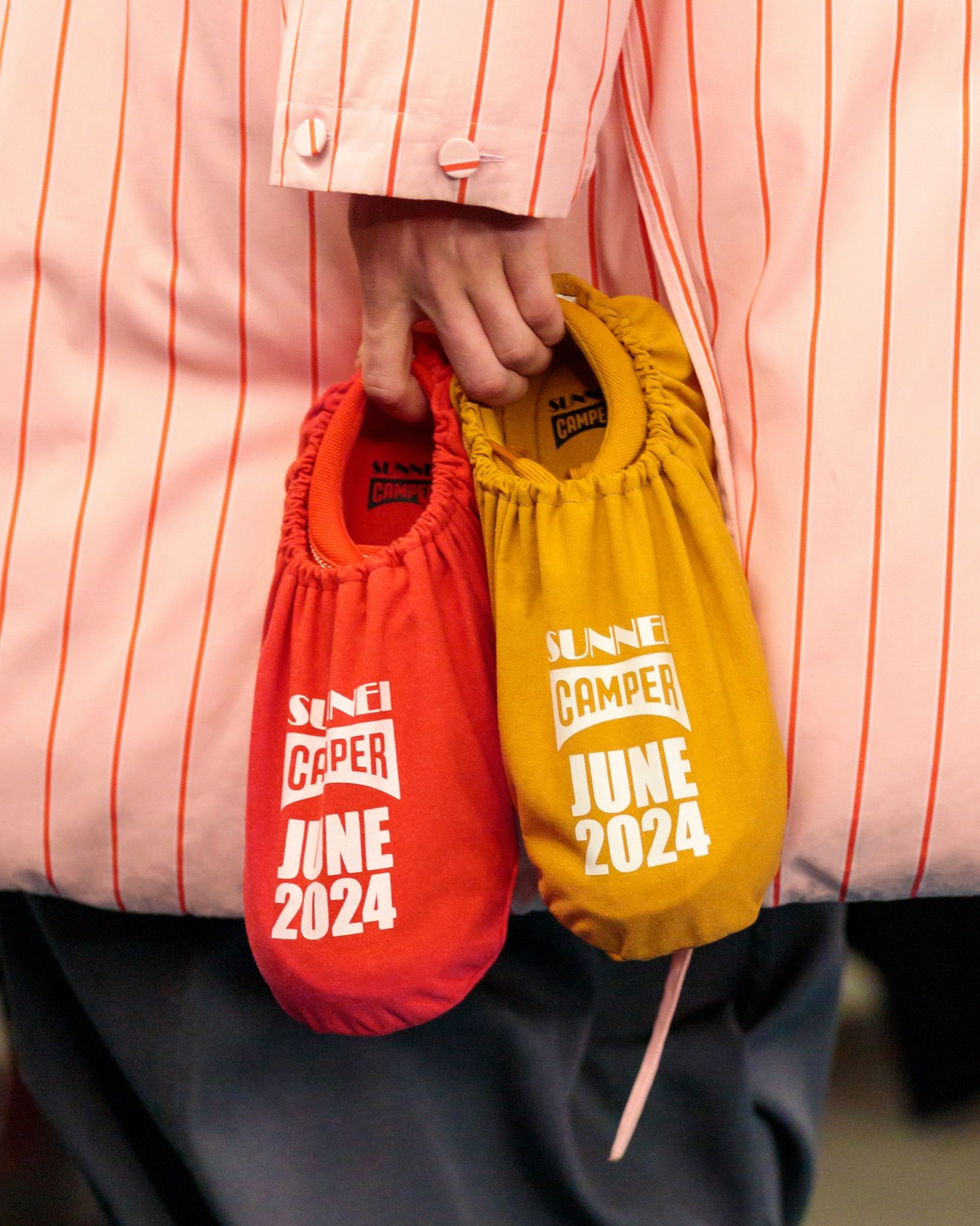 At the SUNNEI FW24 fashion show, it wasn't just the thoughts of the models played on a stereo that amazed the audience, but the unexpected appearance of a new collaboration on the catwalk. Wrapped in colourful dust bags, decorated with the words 'SUNNEI CAMPER, JUNE 2024', the shoes protagonists of the Italian brand's next partnership made their appearance during the show, capturing the attention of the industry insiders seated front row. A collaboration born as a project to be developed over the long term in two distinctive phases, SUNNEI x CAMPER will launch the first model next summer, in June 2024, followed by another drop during 2025.