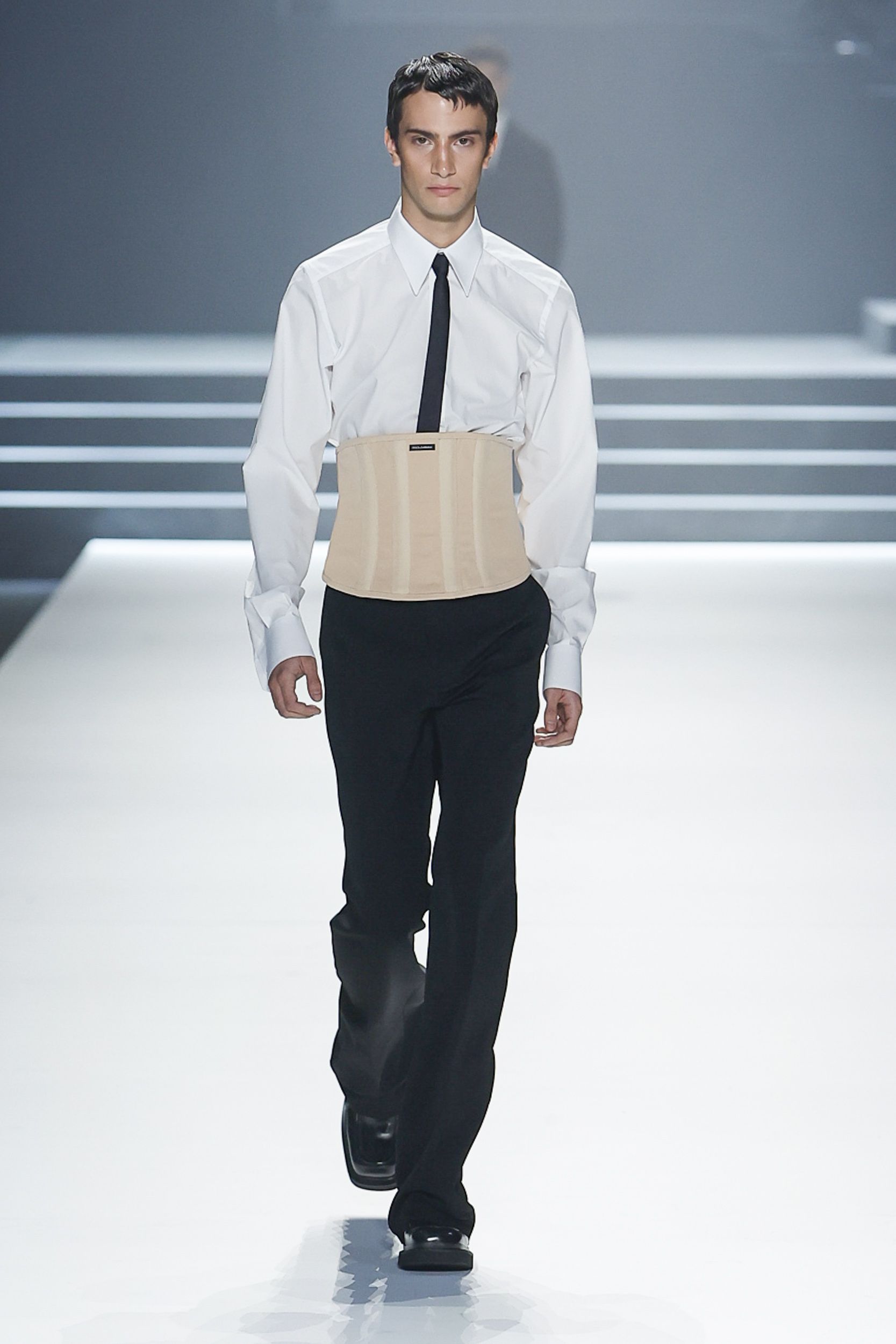It seems that, at the basis of the word silhouette, there is an etymological concoction of history and classism made edible by the taxes imposed by Etienne de Silhouette, the Comptroller General of Finances under the reign of Louis XV. His cuts to the detriment of the people and the wealth of the nobility and clergy ended up shaping a style à la Silhouette, a portrait in vogue in the 18th century that reduced people's outlines to barely noticeable black shadows. A Silhouette was also called trousers without pockets, which ended up straight in the mental encyclopaedia of us moderns to designate a figure or structure outlined to the bone. Throughout history, women have been the subjects most manipulated in terms of silhouette: Coco Chanel had endowed them with a dose of contemptuous pragmatism by constructing high-waisted suits and shifting chains on bags, while Monsieur Dior, a few years later, had jammed them into waspish waists on which to lay bar jackets and floral-printed full skirts. On men's bodies, on the other hand, there have never been any major interventions: it was enough, in modernity in particular, to focus on the work uniform and its component units to bring about major revolutions. Things, however, seem to have changed just now, at a time in history when the economic crisis and the fear of exposing oneself on a narrative level has been compounded by the sharp differentiation between fashion and luxury. Tangible and recognisable forms are sought after, areas of the body typically associated with the sensuality of the female sphere are discovered, the ideal of elegance is pursued, or, bypassing the mainstream, everything is deformed, going beyond any anatomical taxonomy.
