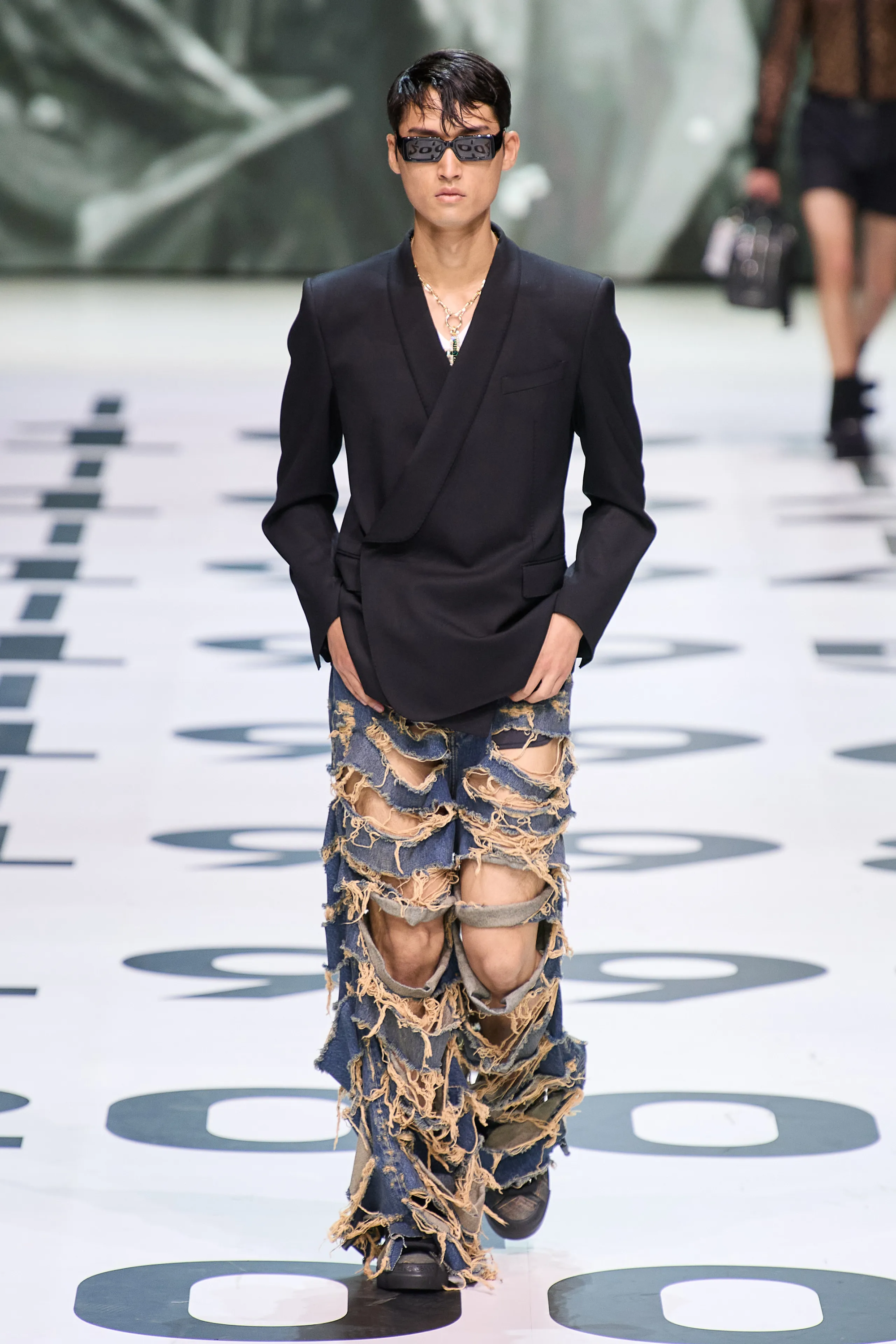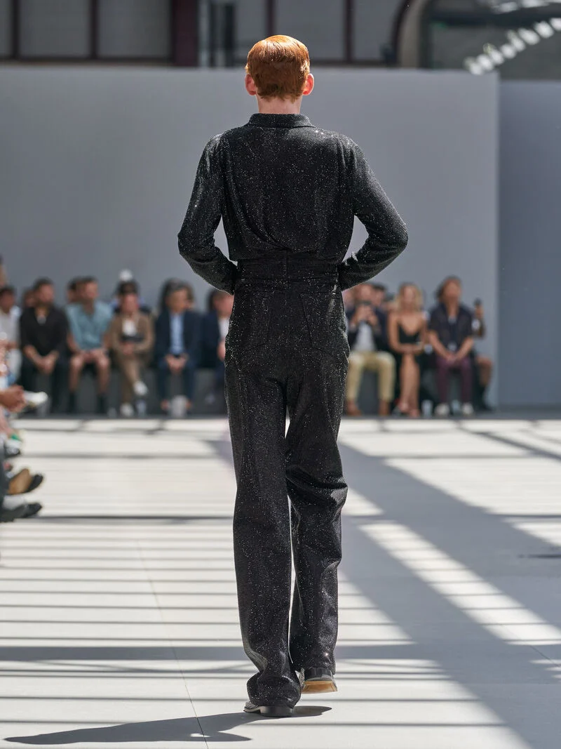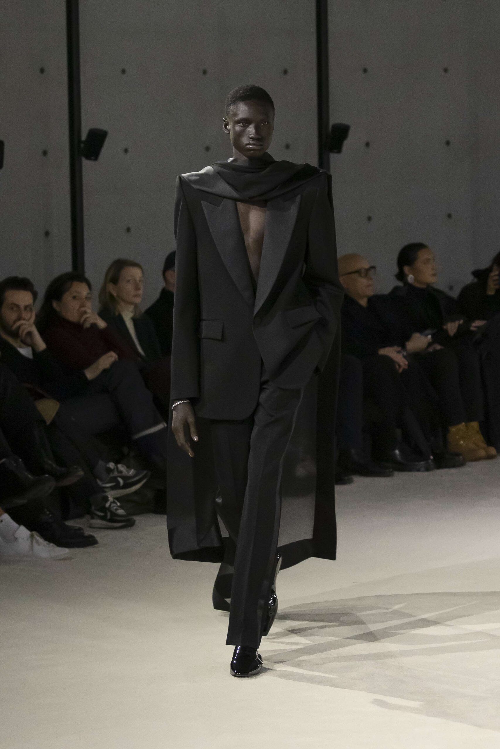«It was a silhouette,» explained Jonathan Anderson in an interview in The Washington Post. «And for me, the fantasy of being a designer when I was younger was really the idea of creating a silhouette.» According to journalist Rachel Tashjian, the author of the interview, Anderson came very close with Loewe's SS24 collection by proposing «something we hadn't seen before: an ambivalent shape, rigid and baggy at the same time, that made the spontaneous and casual gesture of stuffing your hands in your pockets disarming, at times threatening». Very high-waisted trousers, in denim and with all-over rhinestone decorations, which even attracted the attention of the Financial Times, which was surprised to have spotted them on the Sanremo 2024 stage. The incriminated are singer Ghali (in full Loewe look) and his stylist Ramona Tabita, according to whom it is «an evolution, with a man who has shaken off toxic masculinity and proposes another model, not necessarily gender fluid, but virile in a contemporary sense». Liberation which, in the case of Rick Owens, becomes deformation in its purest state - a masculine silhouette supported by inflatable rubber boots, blankets knotted together to form winter tops and "bombastically sculptural" coats in the FW24 collection. A reflection, perhaps, on how primitive the gesture of continually creating forms to inhabit is. A silhouette, in short. An old story that fashion likes to tell as always new.