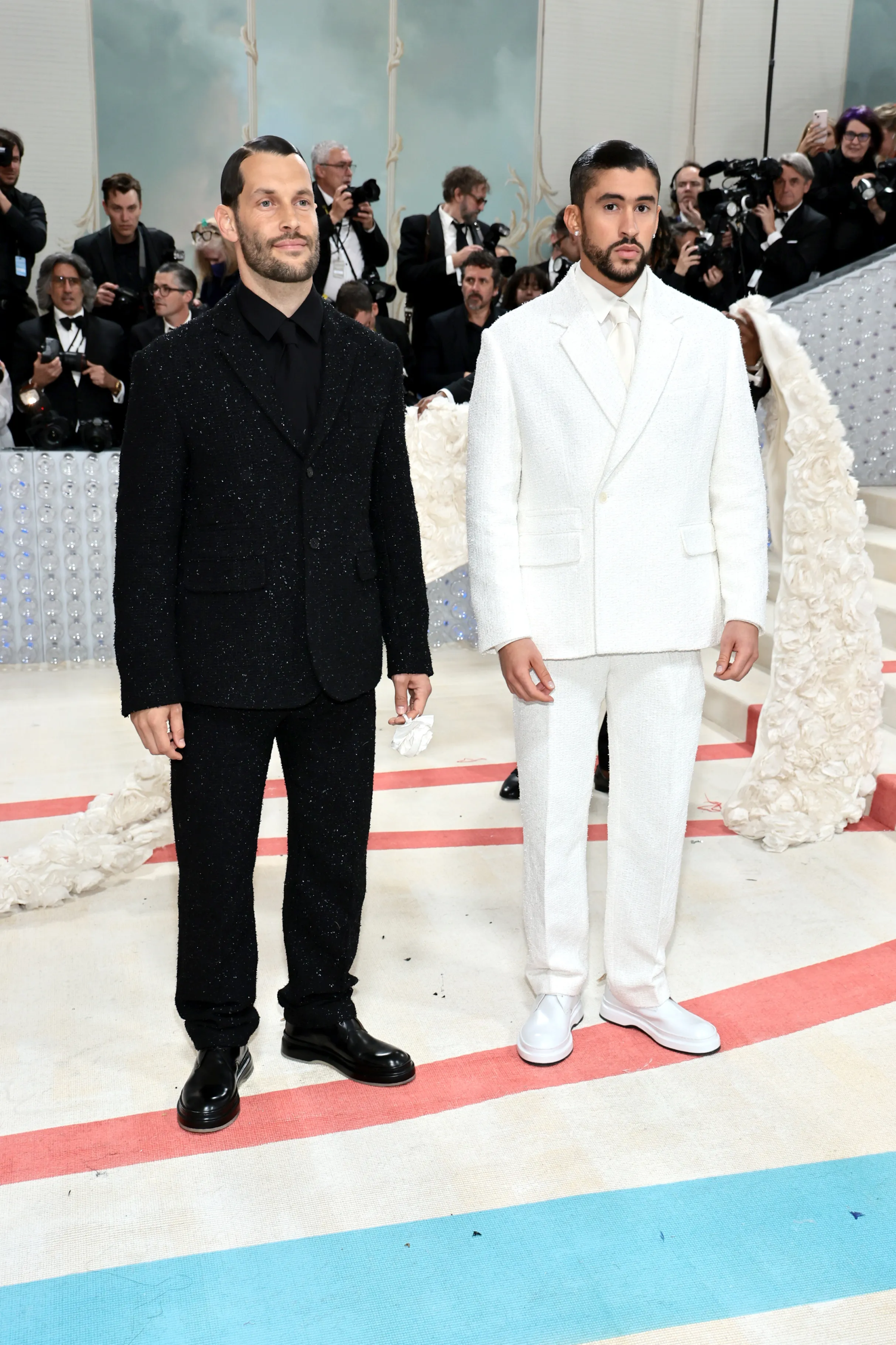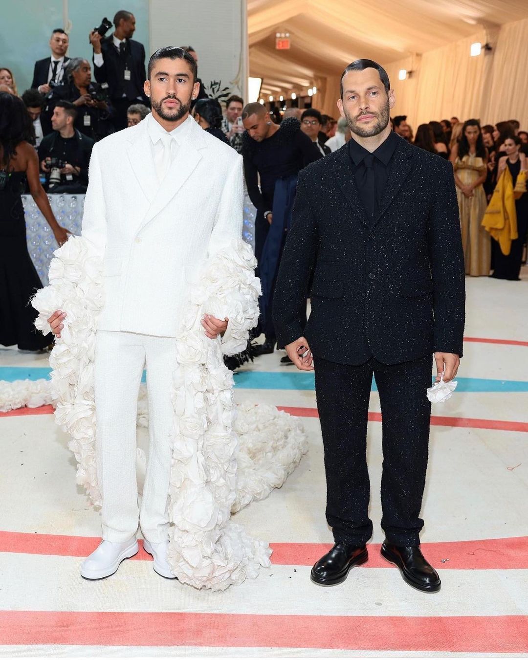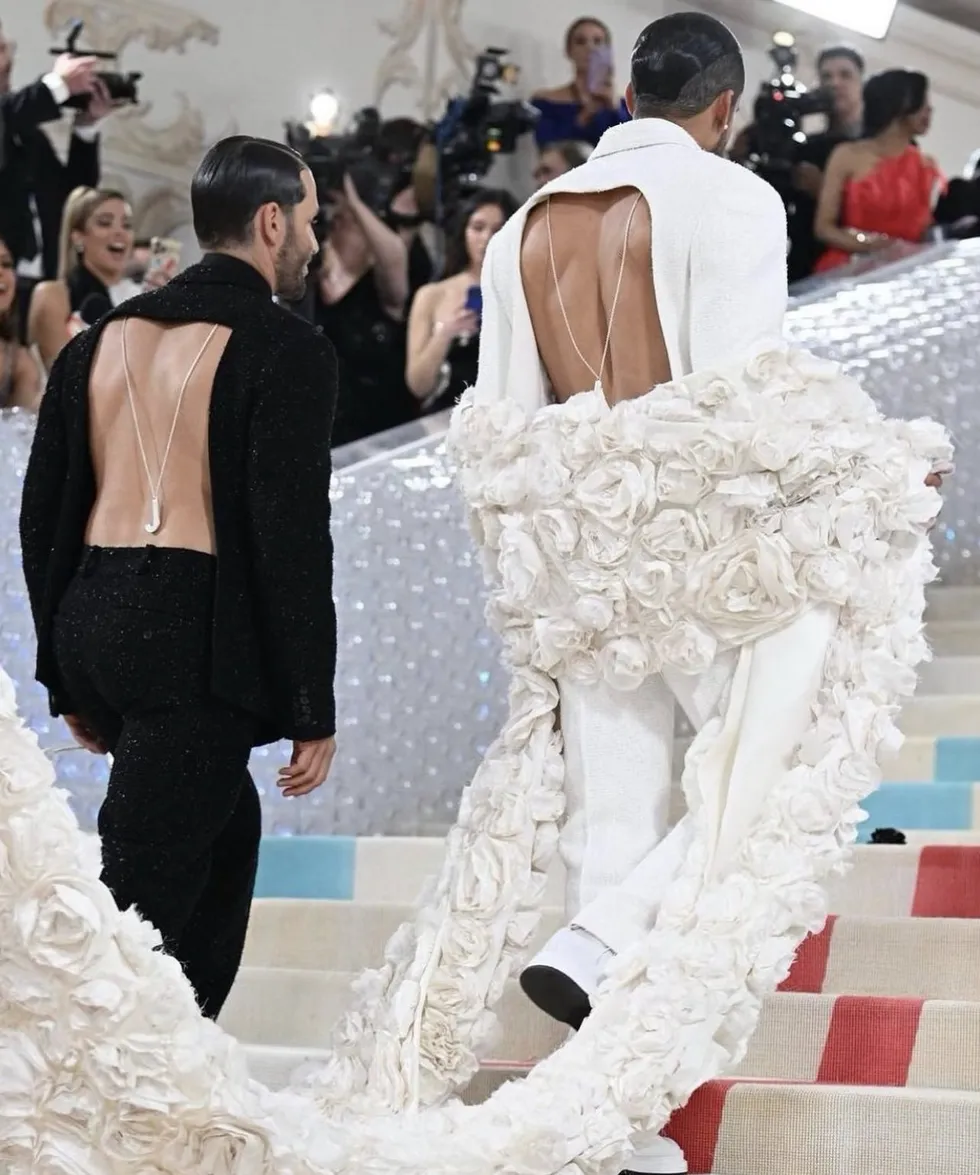 A duo that certainly raised the bar in men's fashion is none other than the Puerto Rican superstar and the darling designer of the French. They graced the red carpet wearing two suits, one black and the other white, each featuring a backless design and bearing the designer's signature. Both interpretations, crafted in tweed, complemented each other perfectly. One complemented his suit with a long floral train for an even more spectacular effect, while the other enhanced his with a long custom necklace with the initial J.