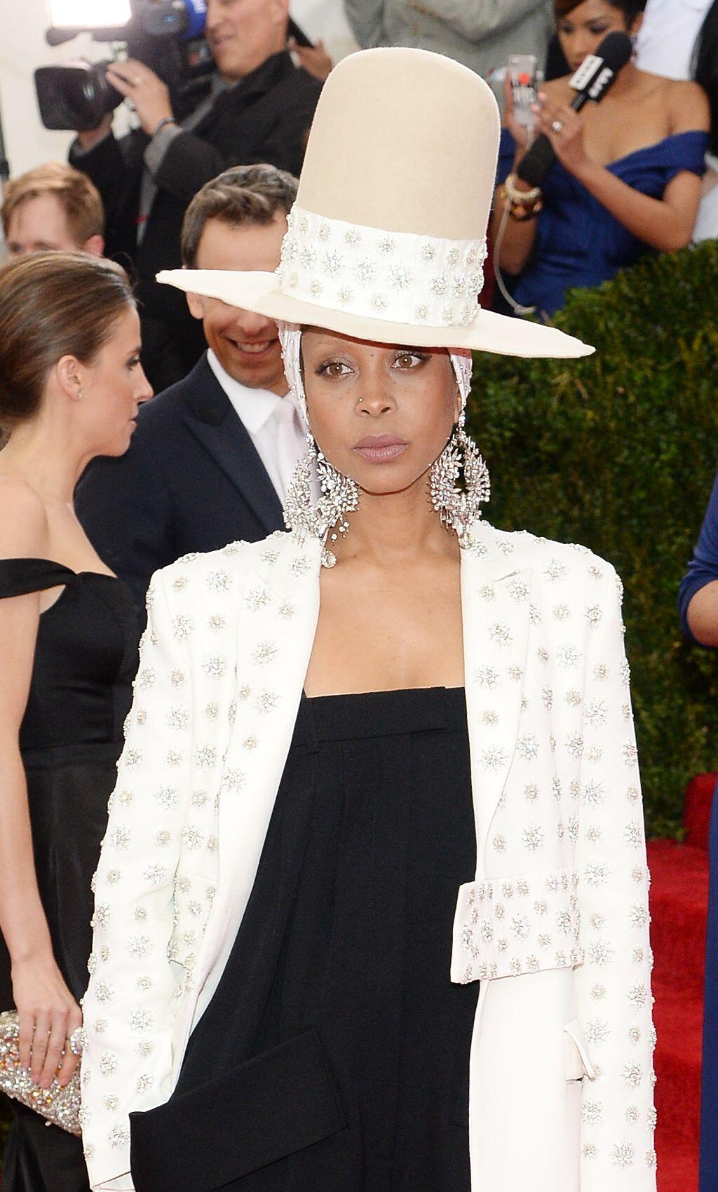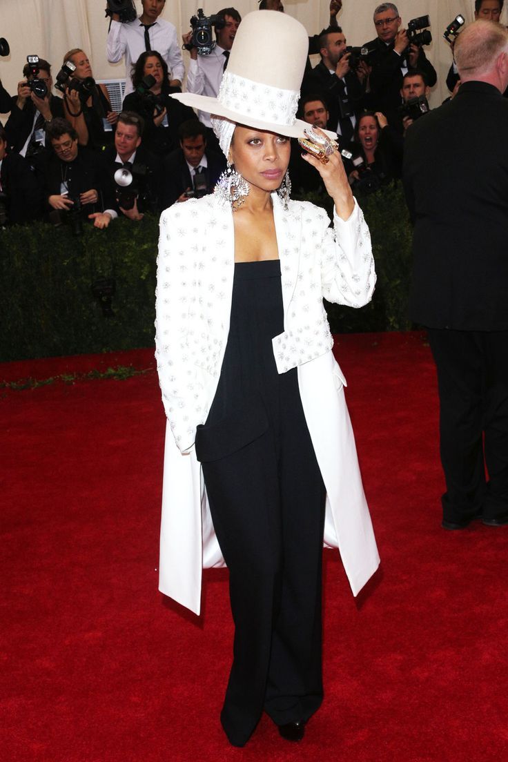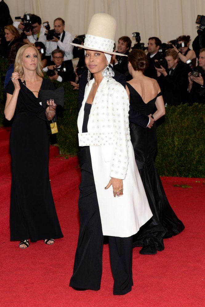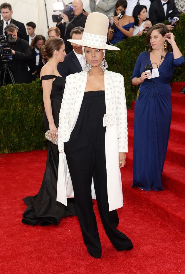 Among the best-dressed personalities of the 2014 edition, if not of the century, was undoubtedly Erykah Badu, muse of Riccardo Tisci then at Givenchy. Wearing a Givenchy Couture outfit entirely custom-made, she undeniably followed her own beat, highlighting her famous fashion style. Her look consisted of a black jumpsuit worn with a white satin coat embroidered with crystals, matched to her silk scarf and signature wool top hat.