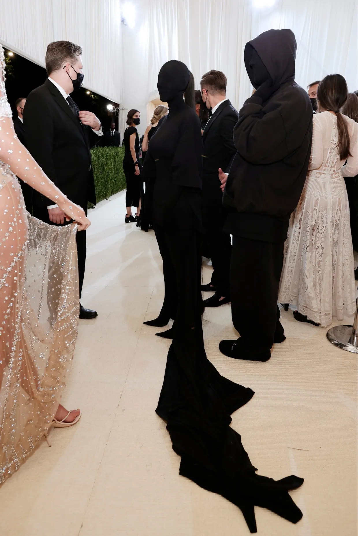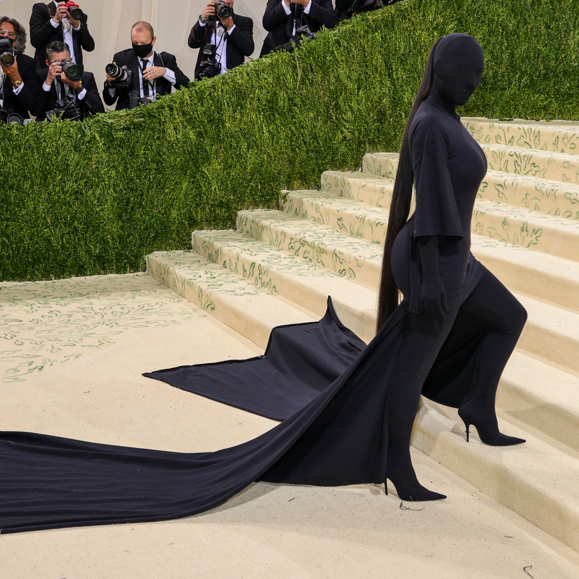 Among the best looks of Kim Kardashian in Balenciaga, it is undeniable that this one stands out at the top of the list. Competing with Blake Lively at this edition, she ascended the steps, masked, alongside Demna Gvasalia, dressed in a stark black haute couture Balenciaga gown with a matching train. A look that, to this day, remains etched in memory as it distinguished itself from anything she—or anyone else—had worn at the Met Gala before.