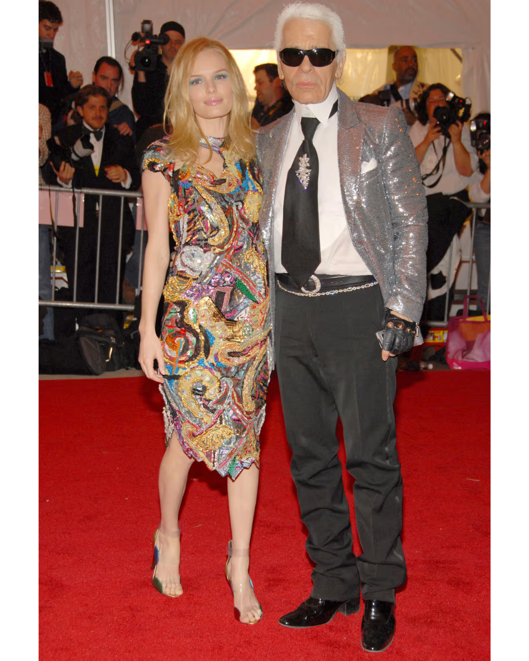 That year, the gala's theme was "Superheroes: Fashion and Fantasy", and Lagerfeld captivated attention - both literally and figuratively. Dressed in a shimmering silver jacket, matched with a diamond chain and a belt buckle, Lagerfeld was as dazzling as the celebrities he dressed. Among them, Kate Bosworth, who shone in a Chanel dress inspired by comic books and was warmly applauded for her interpretation of the theme.