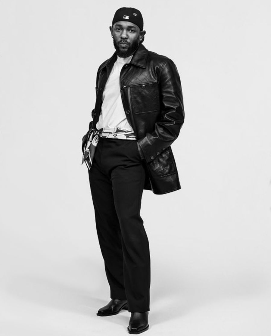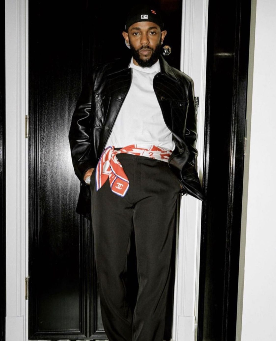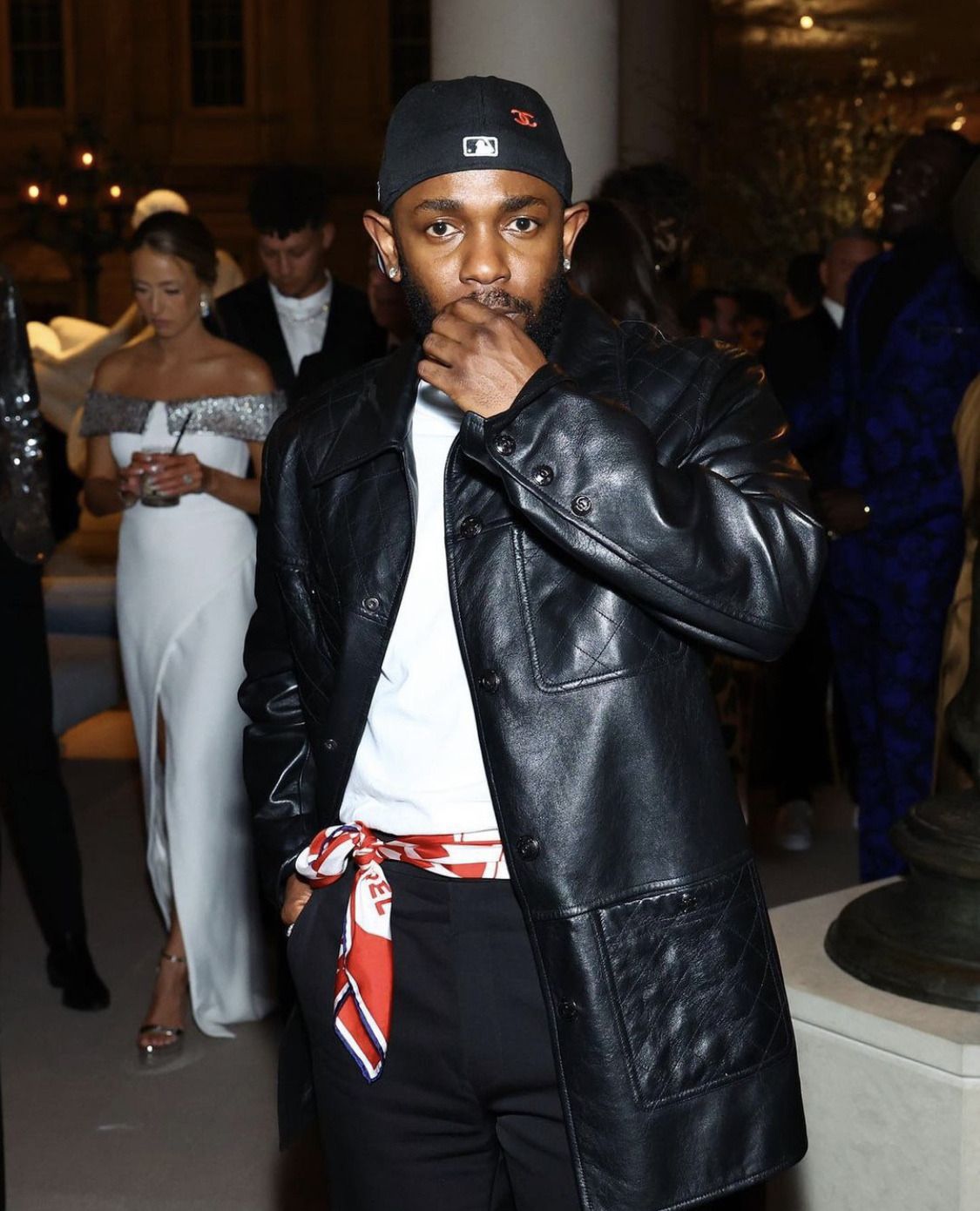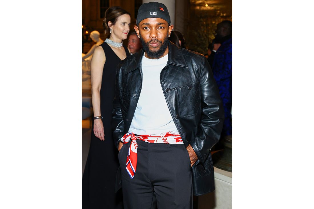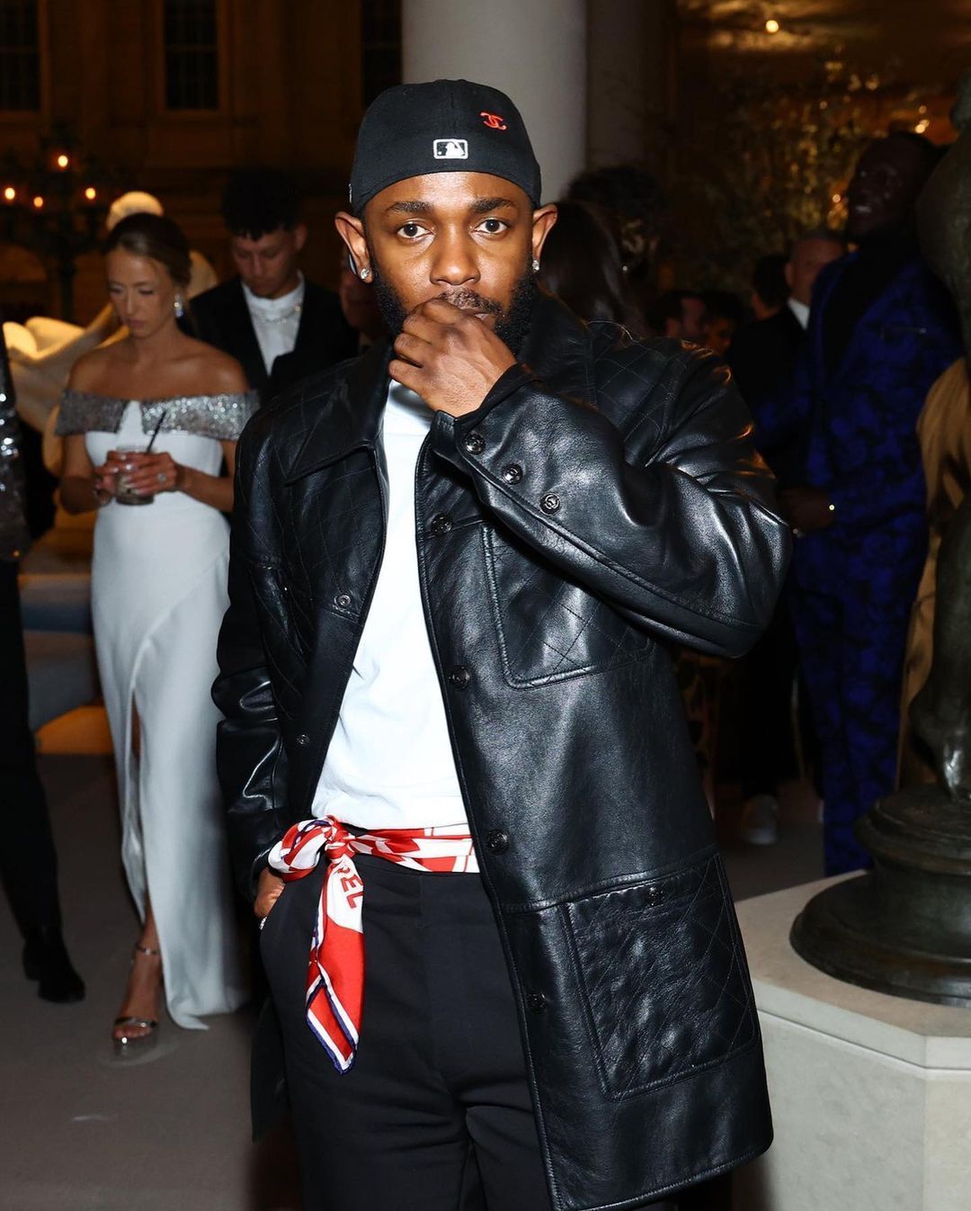 Even though Kendrick Lamar did not deem it necessary to ascend the steps, he still participated in the festivities alongside Chanel to celebrate the opening of the Costume Institute's exhibition, “Karl Lagerfeld: A Line of Beauty” at the Metropolitan Museum of Art in New York. For the occasion, he sported an almost entirely black outfit with a leather jacket, oversized pants, evening shoes, and an MLB cap. He enhanced his look with a white sweater and an orange and white Chanel scarf tied around his waist.