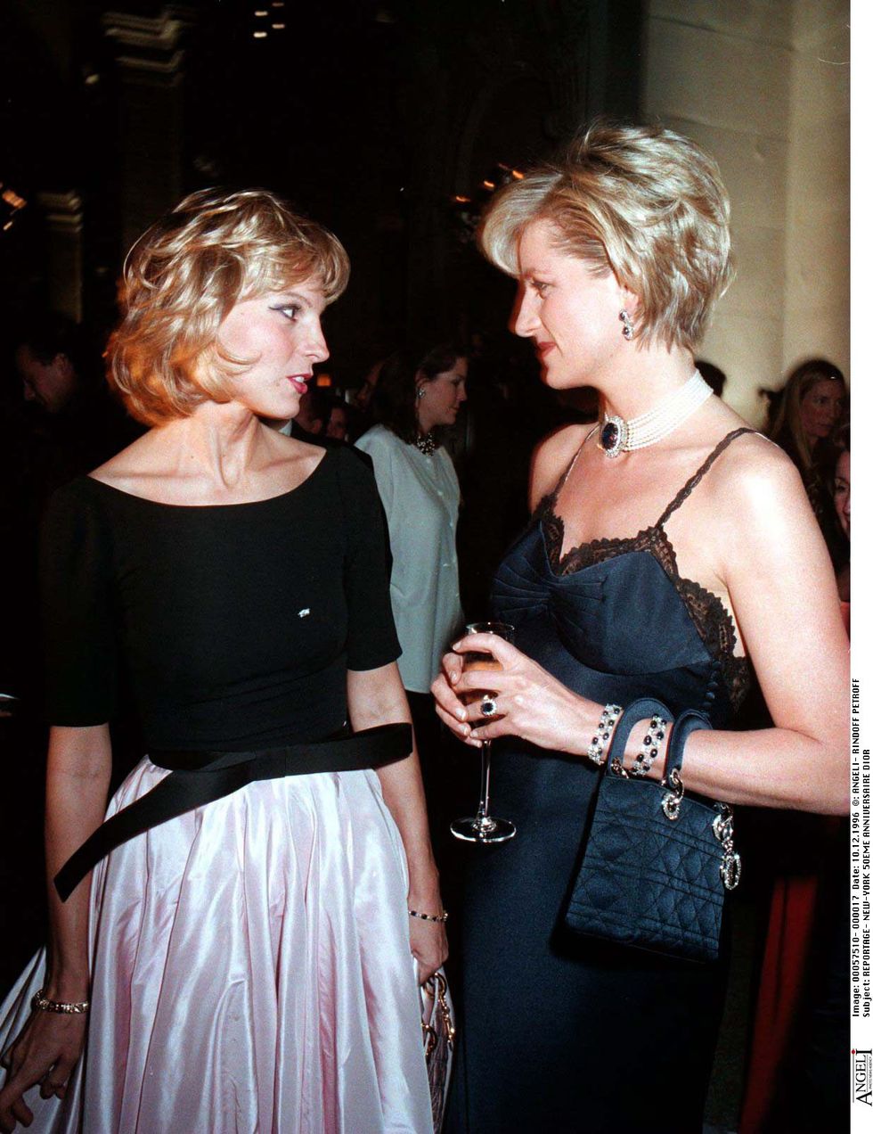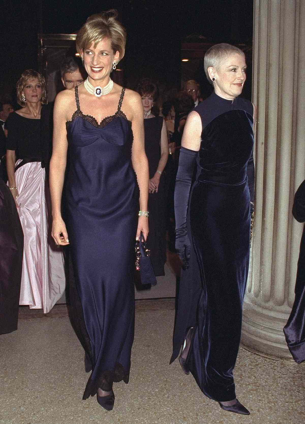 For this grand evening dedicated to "Christian Dior", Lady Di embodied the spirit of the theme with natural ease. As a true fashion icon and trendsetter, she pleasantly surprised by setting aside her usual princess outfits to wear a navy blue silk slip dress, enhanced by a set of pearl and deep blue sapphire jewelry. A creation credited to John Galliano, who was then at the helm of the house of Dior.