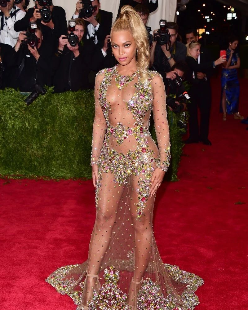It seemed as though Beyoncé was floating on the red carpet in her Givenchy dress from 2015 adorned with Swarovski crystals, yet it was actually one of the heaviest she had ever worn. In 2015, Queen B made a splash with this “naked dress” designed by Tisci at Givenchy, transparent except for clusters of crystals strategically placed.