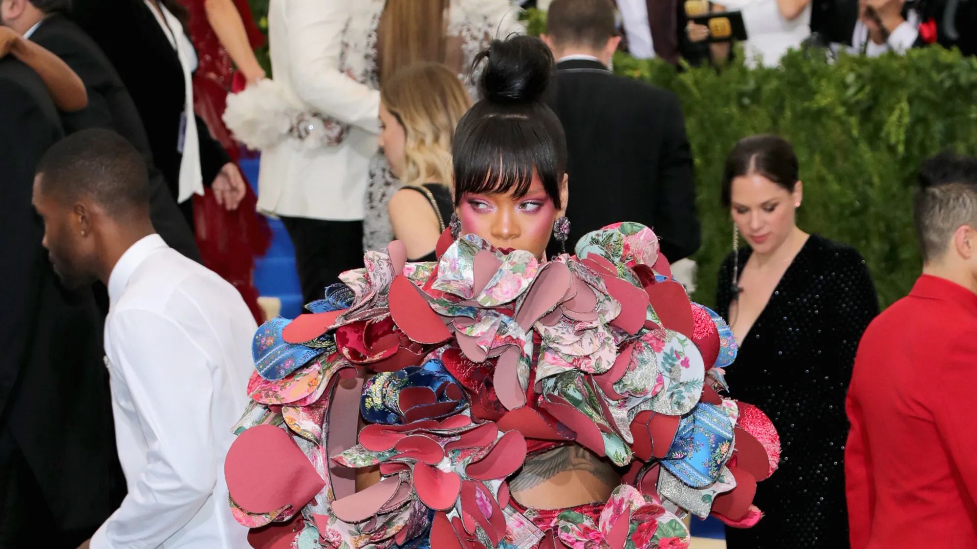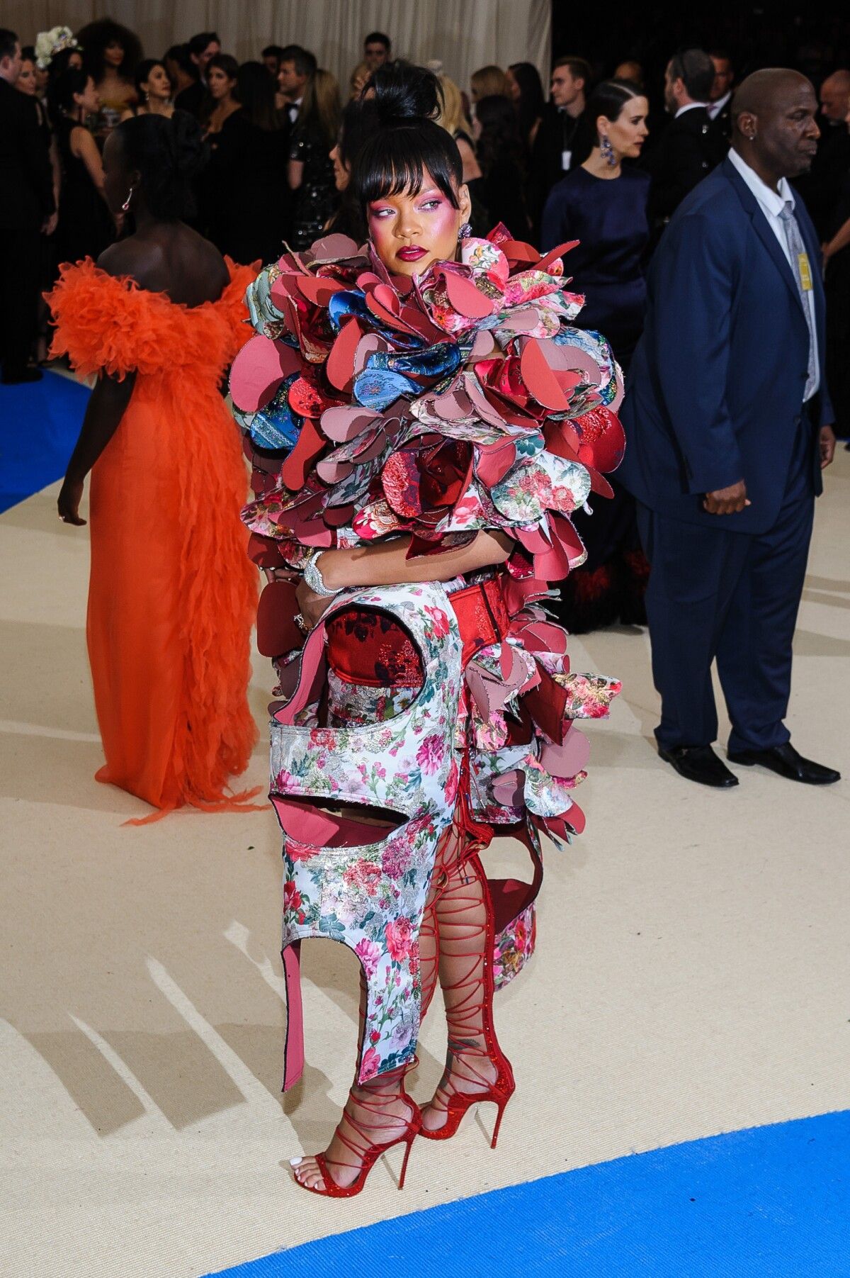 Rihanna is undeniably one of the Met Gala attendees everyone eagerly awaits to see. If in 2015 she had made a splash with an oversized yellow gown with a train, it was in 2017 that she truly outshone everyone else. Dressed in a creation by Comme des Garçons, in tribute to Rei Kawakubo, the theme of the evening, Rihanna captured all eyes. Her asymmetrical dress, blending shades of pink and crimson, adorned with printed flowers and fabric disks evoking petals, earned her the title of “Best Dressed” by Lady Gaga, an advocate of outlandish outfits.