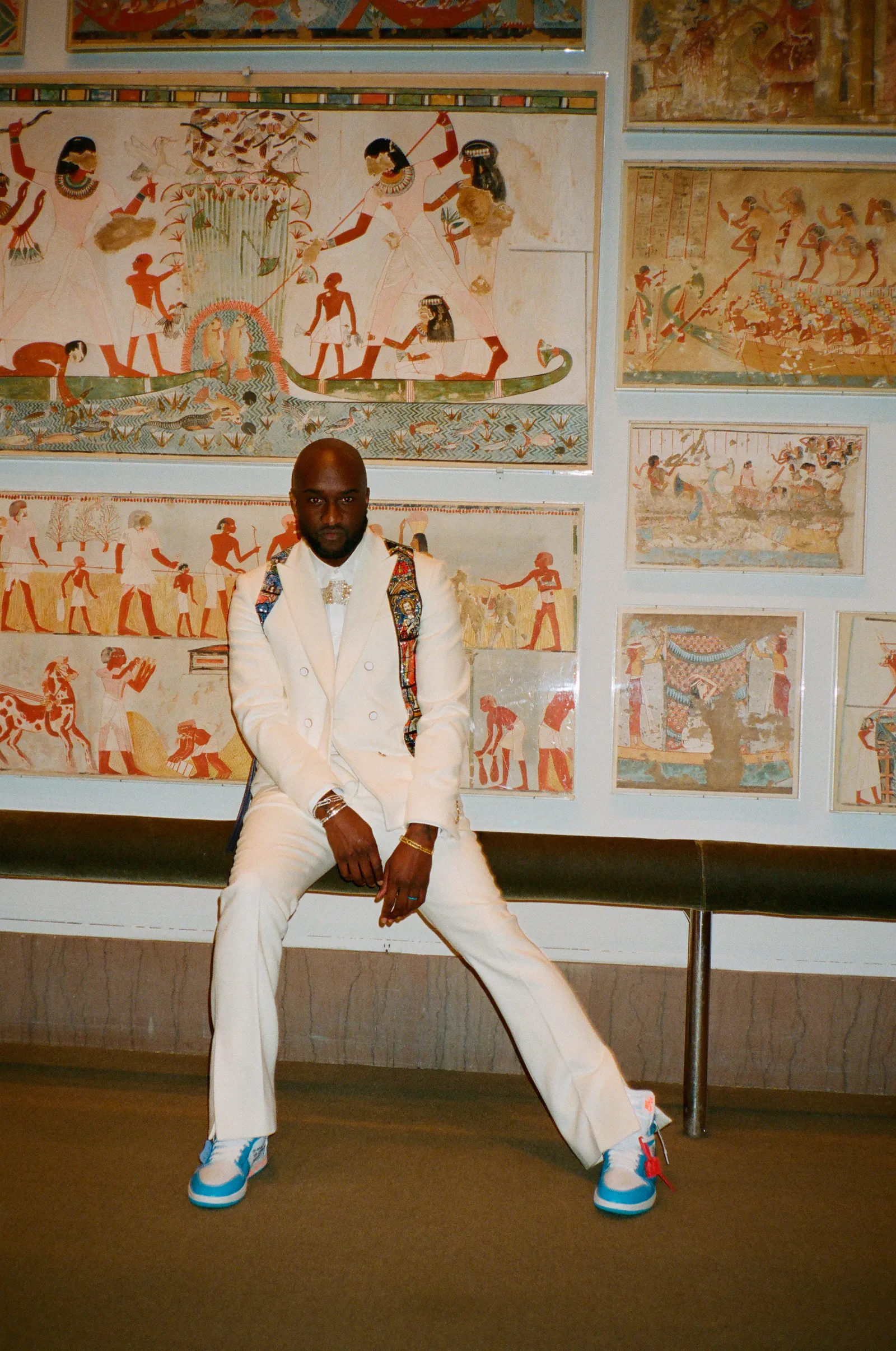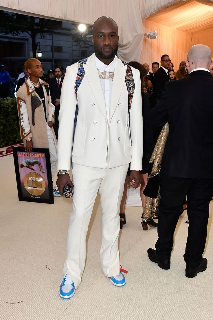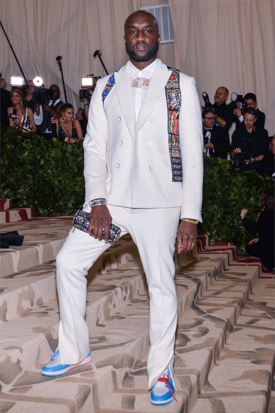 Just after being named the head of menswear at Louis Vuitton, with the entire fashion sphere buzzing in anticipation of his first collection coming in June, it was on the Met Gala red carpet that Virgil Abloh previewed the first silhouette he envisioned for Louis Vuitton Homme. He appeared in a suit that paid homage to the theme of the exhibit "Heavenly Bodies: Fashion and the Catholic Imagination", with a blazer adorned with pearls forming illustrations inspired by Catholic tradition.