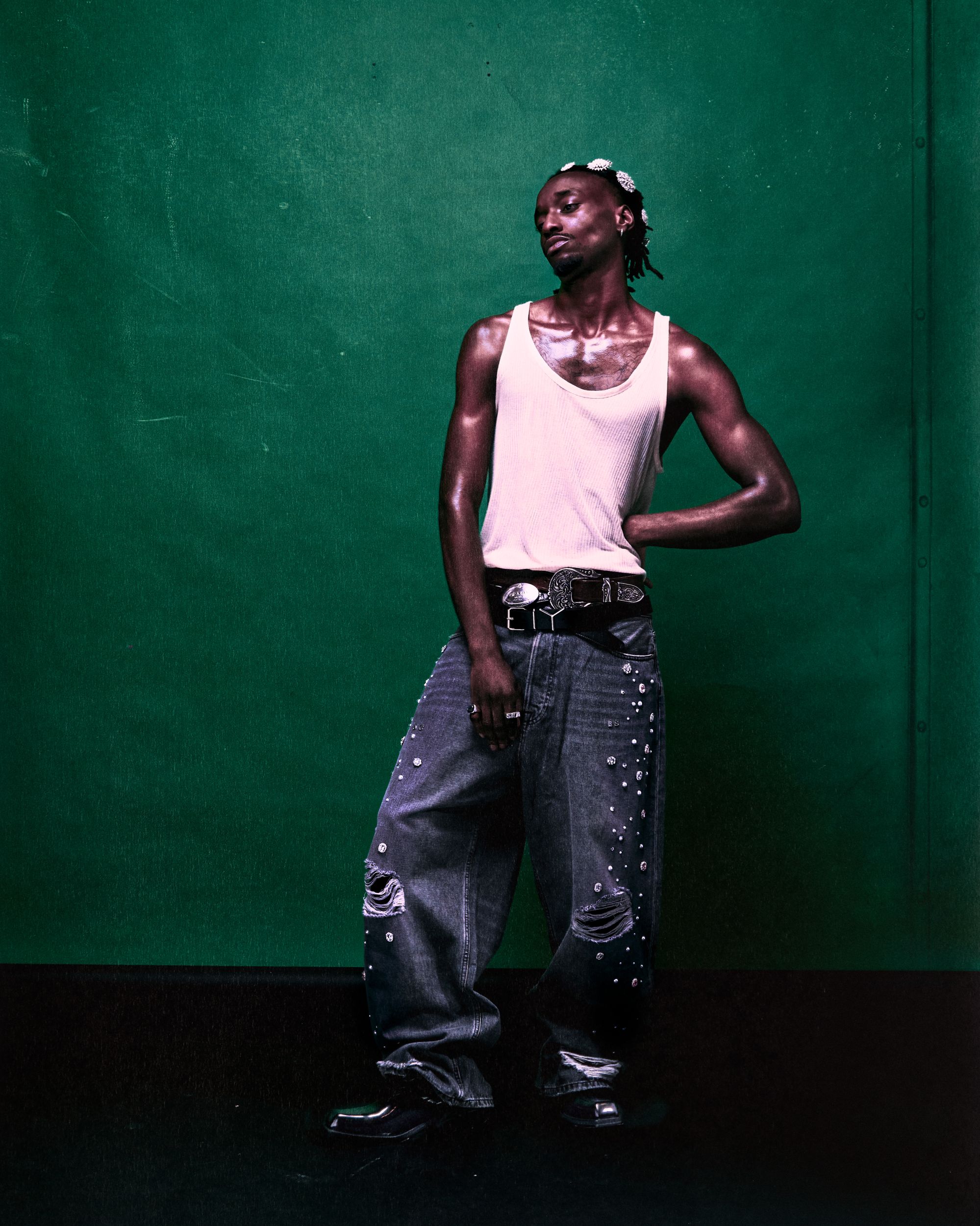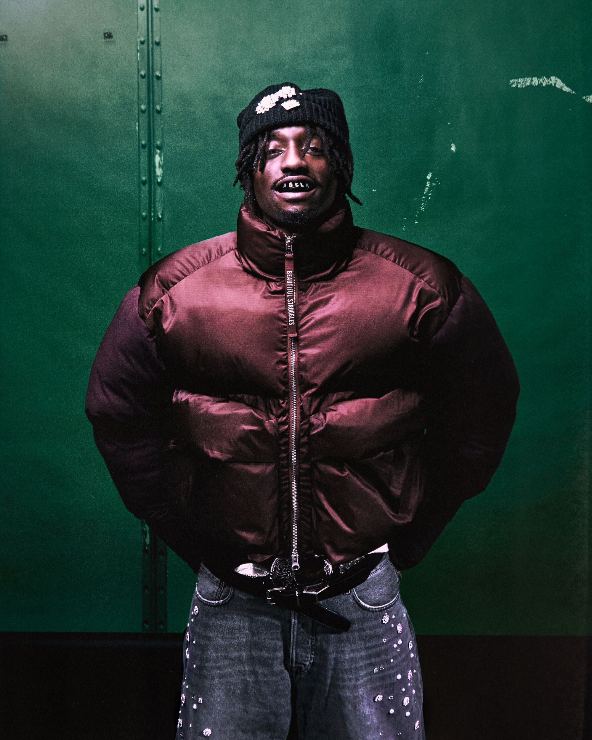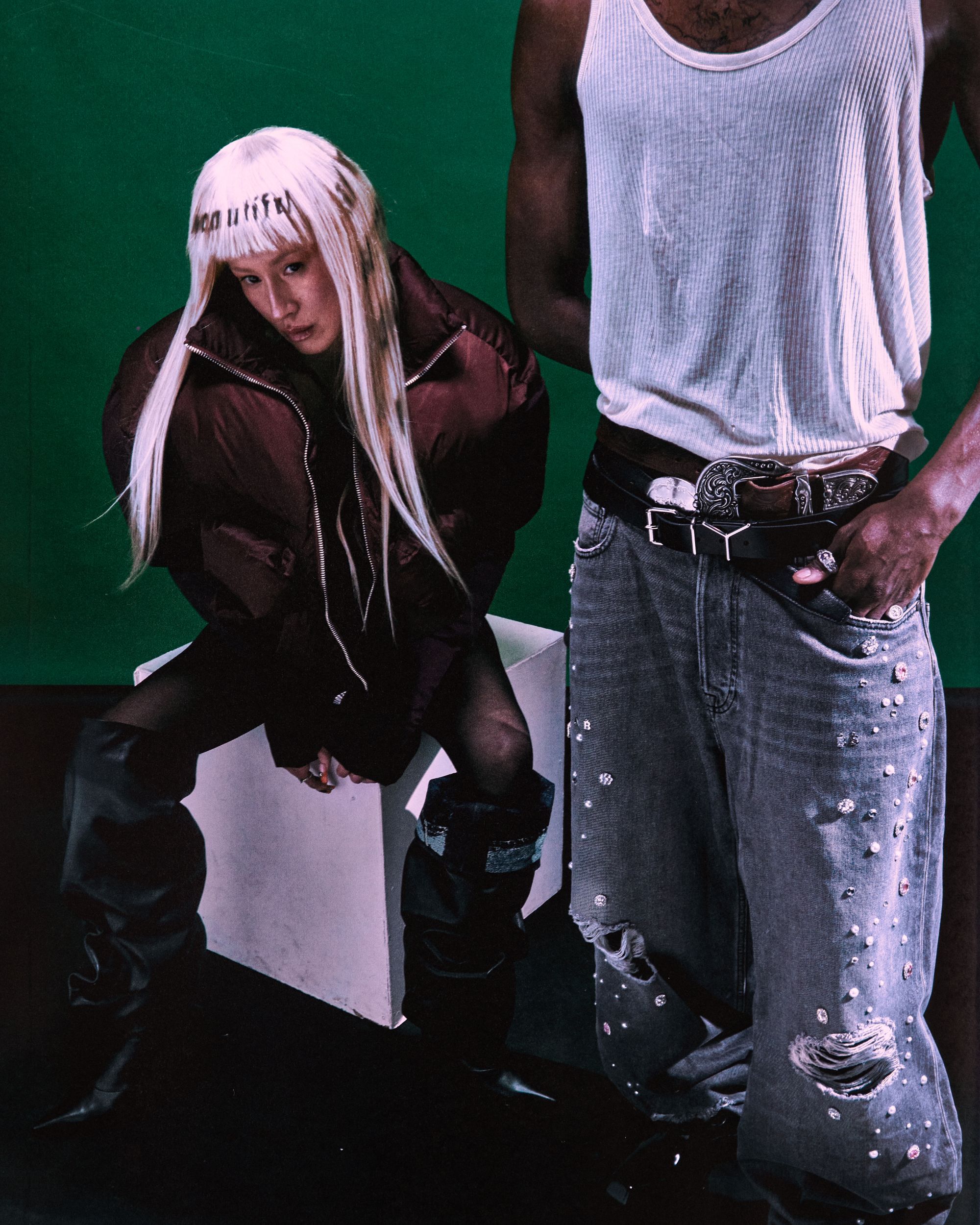 ABELA has incorporated the distinctive features of its recent creations, including the jewelry adorning its headwear, to reimagine the « Baggy Destroyed Denim Pants ». Each jewel was hand-placed, giving the jeans a unique character, continuing the concept of 1/1 pieces for which ABELA is renowned. The meticulous crafting of these jeans required over two hours of artisanal work for each pair. The « Nylon Puffer Vest » from Beautiful Struggles has been transformed with the addition of voluminous sleeves. Using a darker burgundy nylon, this modification accentuates the bi-material contrast, a recurring element in Abela’s creations. The result is a piece that perfectly combines elegance and innovation.