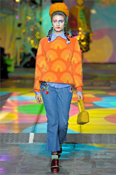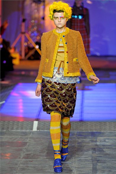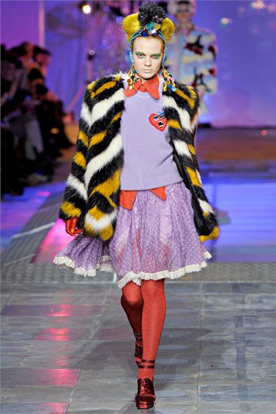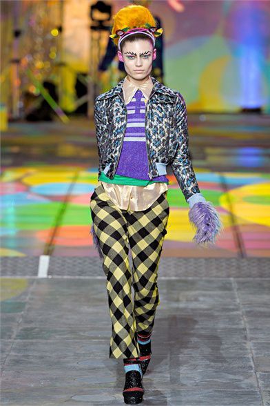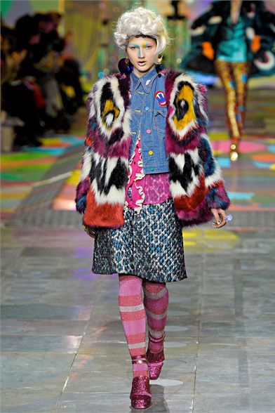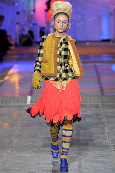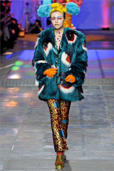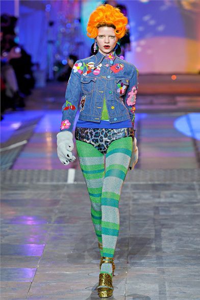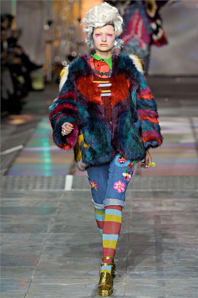 Everything is excessive, hyperbolic: wigs, dramatic make up, glittery platforms, shorts, stripes stockings, colorful jackets and sweaters, marabou fake furs.