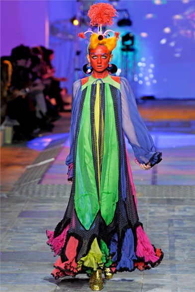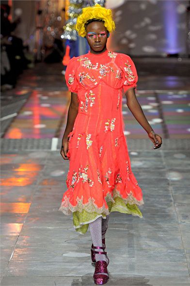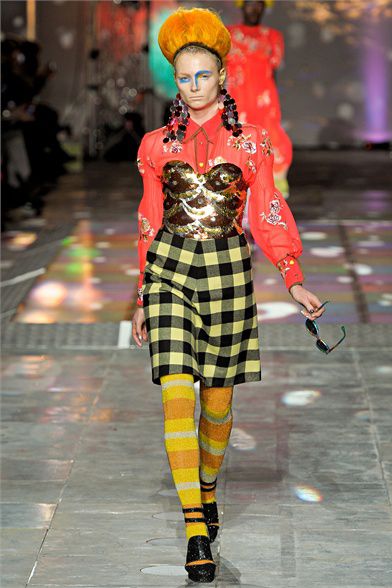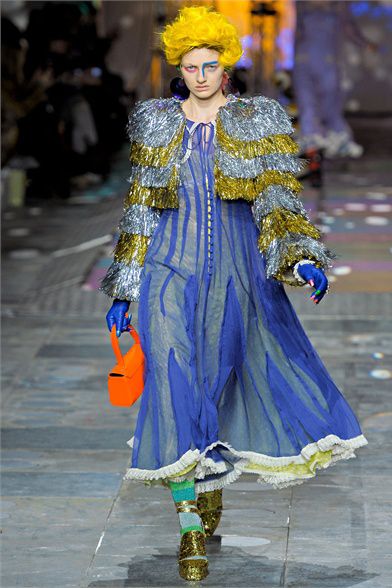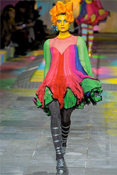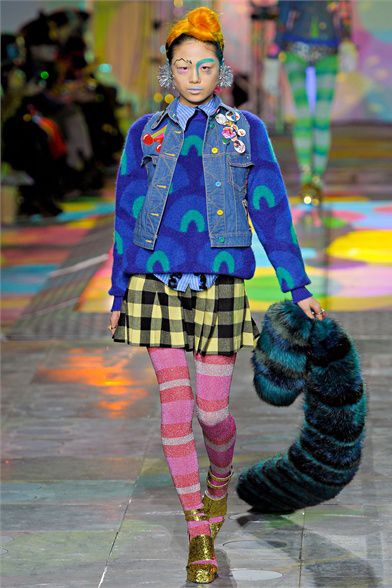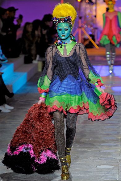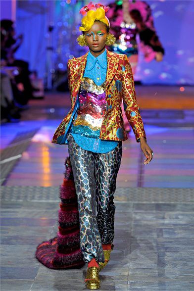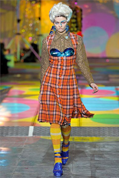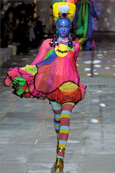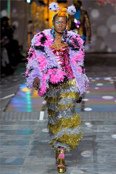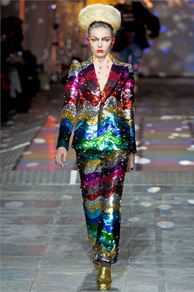 Tutto è esagerato, iperbolico: parrucche, trucco scenografico, tacchi glitterati, shorts, calze a righe, giacche e golfini coloratissimi, pellicce finte di marabou.