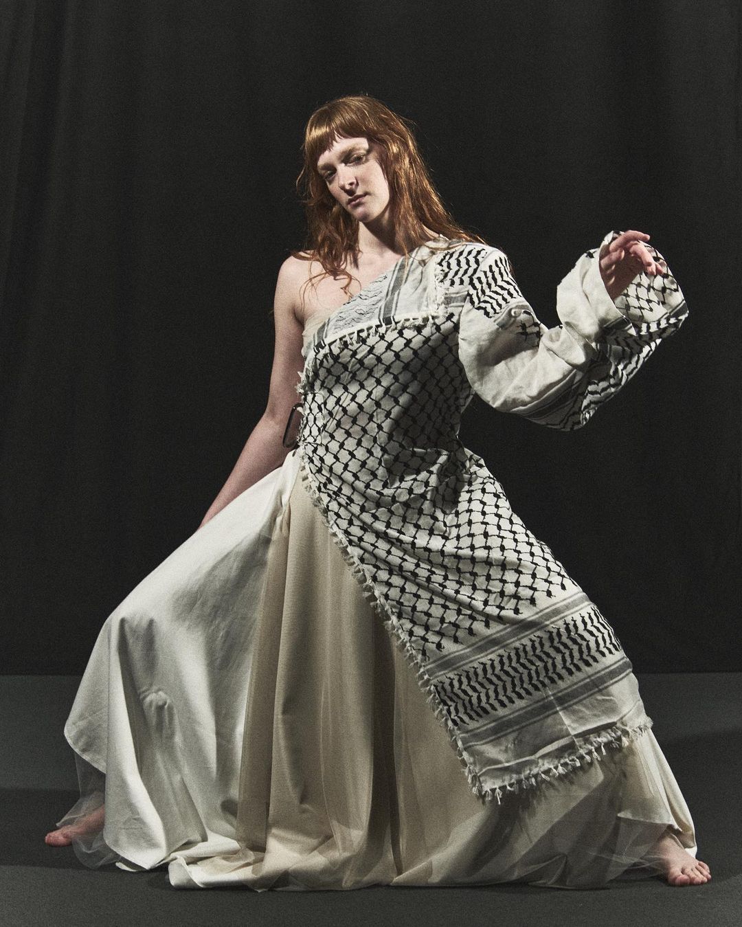 On the red carpet of the Cannes Film Festival, many celebrities showed solidarity with the Palestinian people. Jasmine Trinca wore a pin with the Palestinian flag, Cate Blanchett sported a dress with its colors, and Bella Hadid (who along with her sister Gigi donated one million dollars in support of Palestinian refugees) was seen wearing Michael and Hushi's red keffiyeh dress. At style events, as well as among street protests, there is a greater awareness of the headscarf's meaning, perhaps also thanks to the globalization of images through modern media. There is a growing desire to use the keffiyeh to represent a tangible connection with the struggle and resilience of the Palestinian people, and to declare an anti-colonial and anti-authoritarian stance, on the streets worldwide.