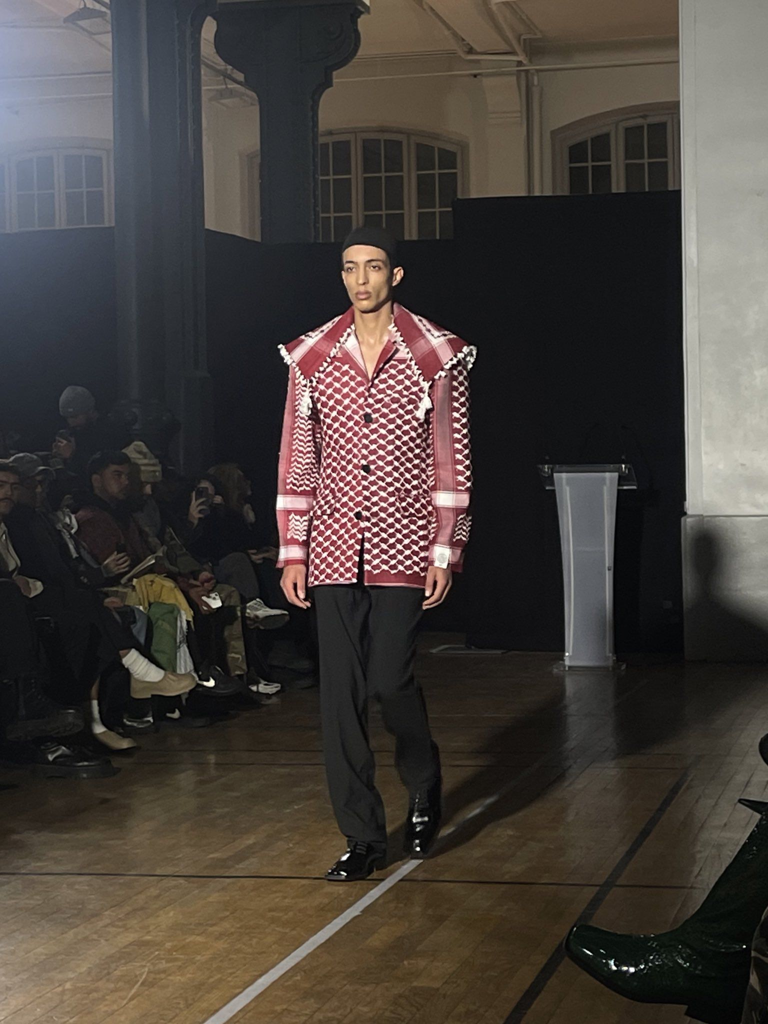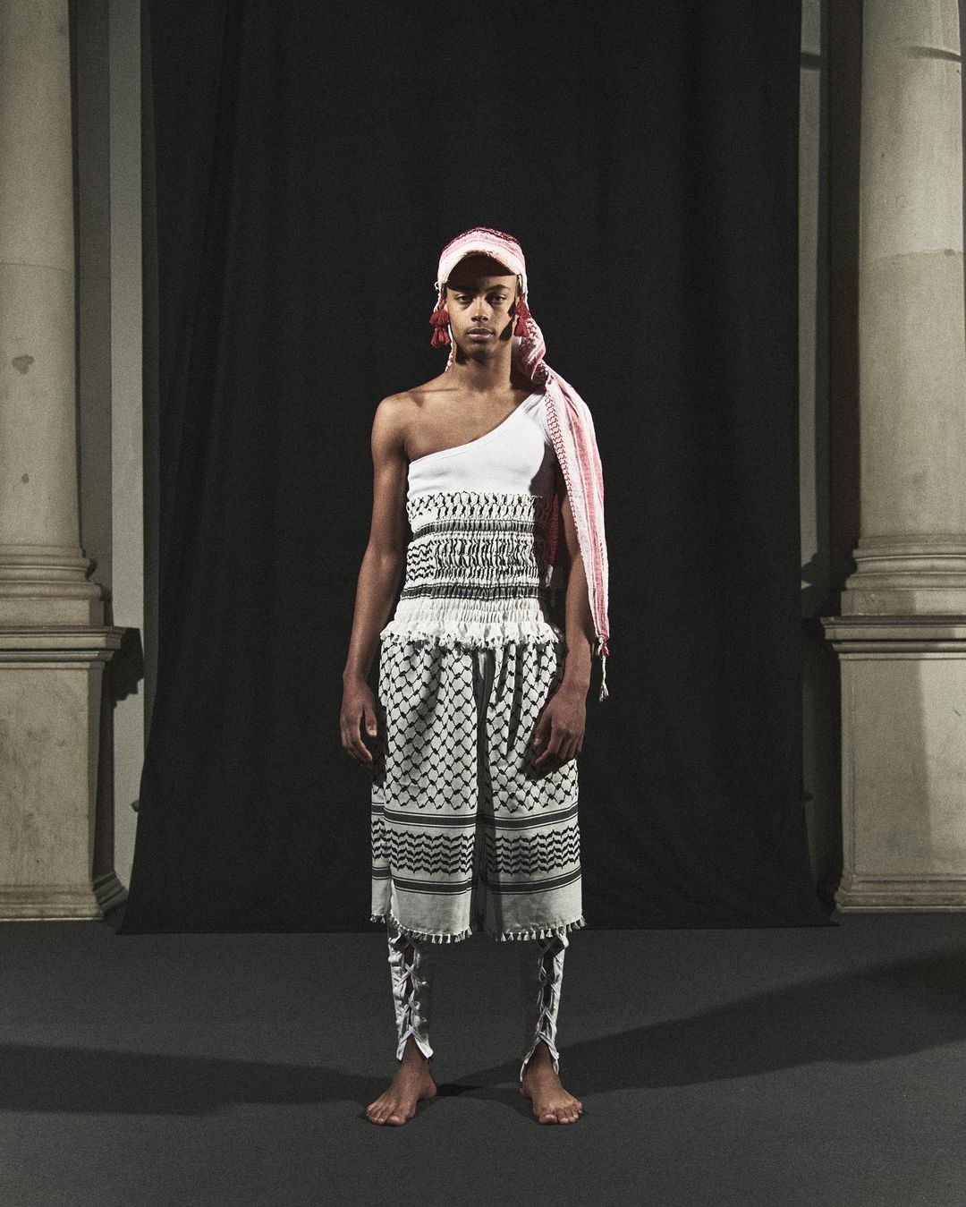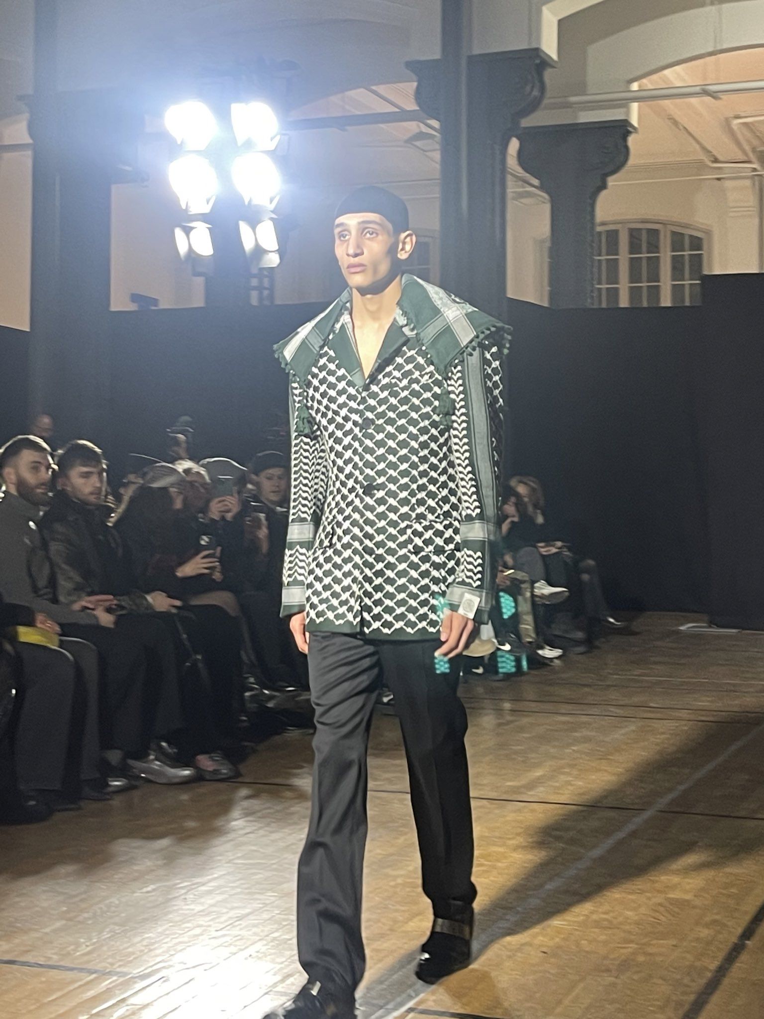 Today, the keffiyeh has regained its original political and cultural connotation, especially among new generations of activists who use it as a symbol of solidarity and resistance. Last January, at Paris Fashion Week, the German brand GmbH closed the show with jackets featuring the same pattern. In an interview with Dazed, designers Serhat Isik and Benjamin Huseby stated they were not afraid to be political. «We are interested in the political and formal possibilities of fashion as a medium of intercultural exchange. As designers, we usually express our thoughts through clothing and leave the rest to the imagination. But we live in dangerous times where precision of words is necessary.» In Milan, the keffiyeh appeared on the runway of Salvatore Vignola, with a collection titled "If I Must Die", inspired by the poetry of Palestinian poet Refaat Alareer, killed in Gaza on December 7, 2023. Vignola donated the proceeds from sales to the Palestine Red Crescent Society, an organization that provides humanitarian aid in Palestine.