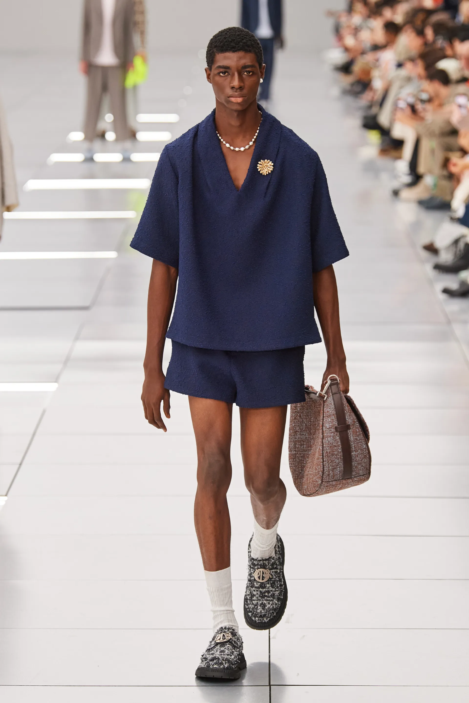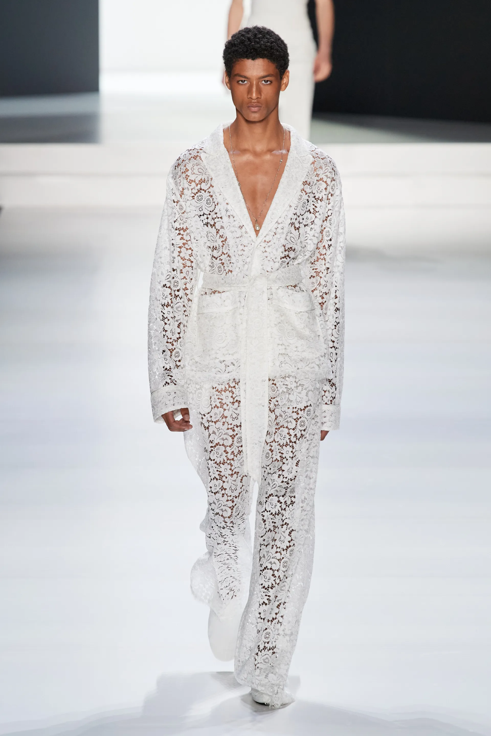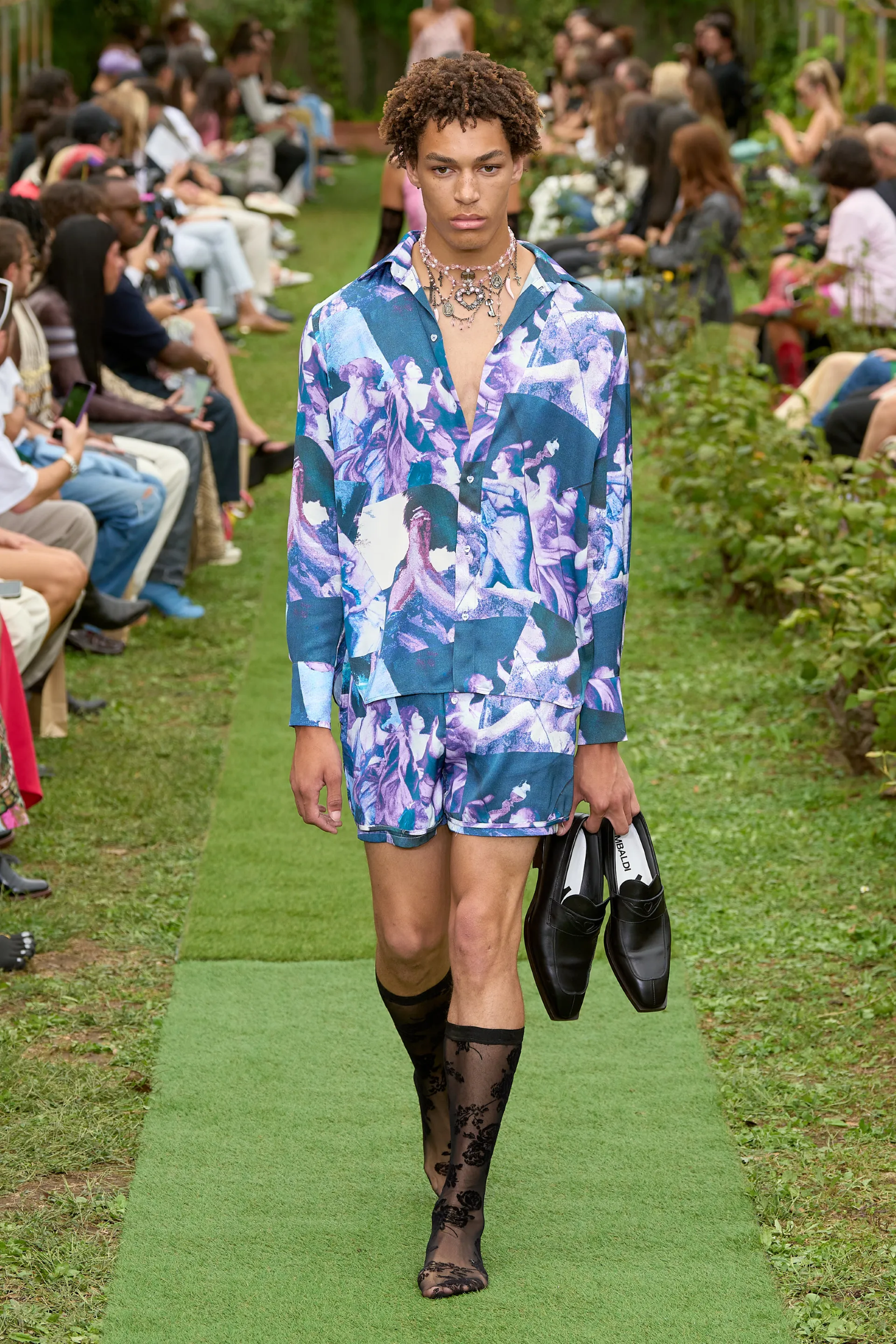 A note: in recent seasons only Louis Vuitton has used pearls in more "institutional" menswear, while Namesake has incorporated them in various forms. But men's pearls were present in SS24, in the "disappearing models" show by Dior Homme, for example, or at Dolce & Gabbana and Giorgio Armani where the pearl was a single pendant appearing on just two looks in both collections. At Dsquared2 the pearl was a simple choker which, however, worn with the brand's usual boldness and masculine flair, seems to suggest that now men can wear pearls too without hiding behind the "soft boy" label – which was the way the entire trend of men wearing pearls started, thanks again to Alessandro Michele and Harry Styles. Similarly, designers as diverse as Massimo Giorgietti of MSGM, Mihara Yasuhiro, Chitose Abe of sacai, and Rok Hwang of Rokh seem to have included pearls or similar jewelry in their looks. More oriented towards the original "soft boy" world but with very little softness were Marco Rambaldi and Martine Rose in the same season. And if one wanted further evidence of how pearls no longer have any connotation of gender fluidity, even Philippe Plein had one of his models wear them. In short, their disappearance from one season to the next in menswear signals their normalization, the end of their divisive status.