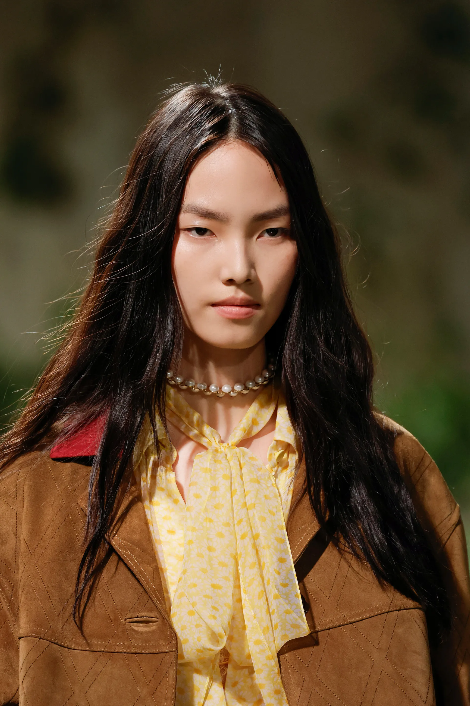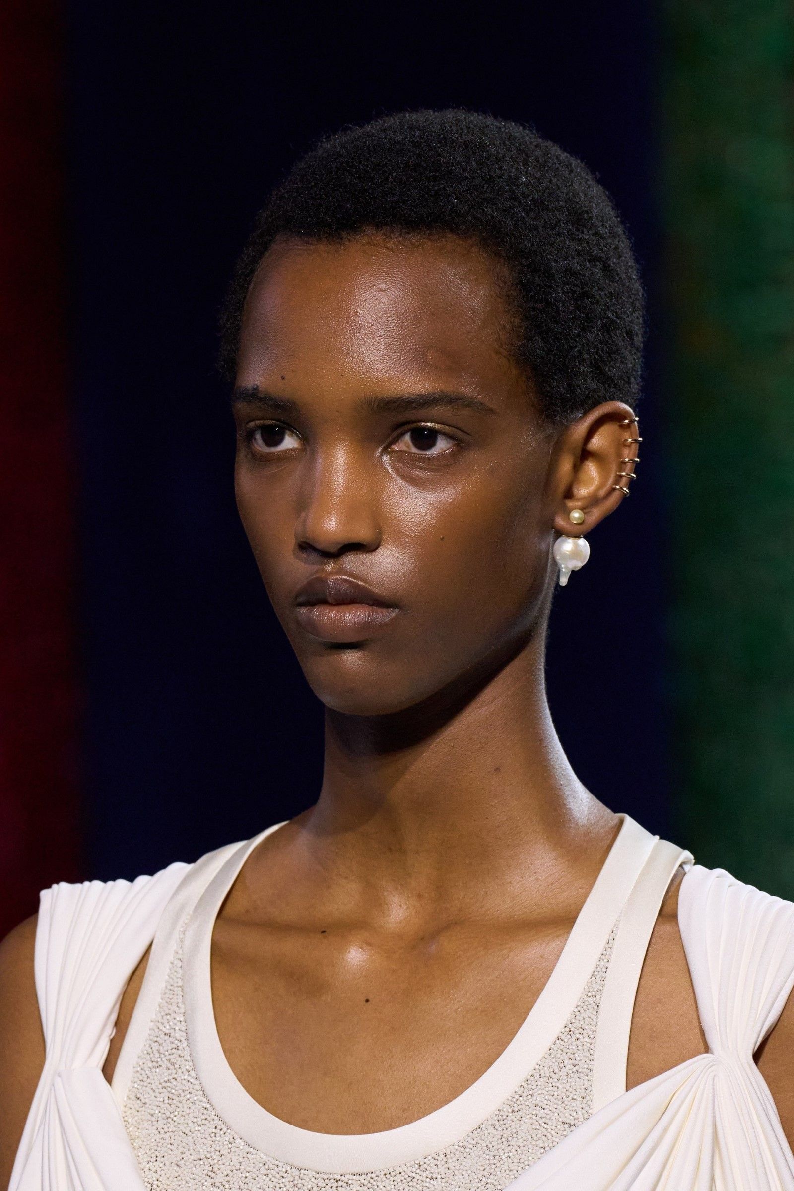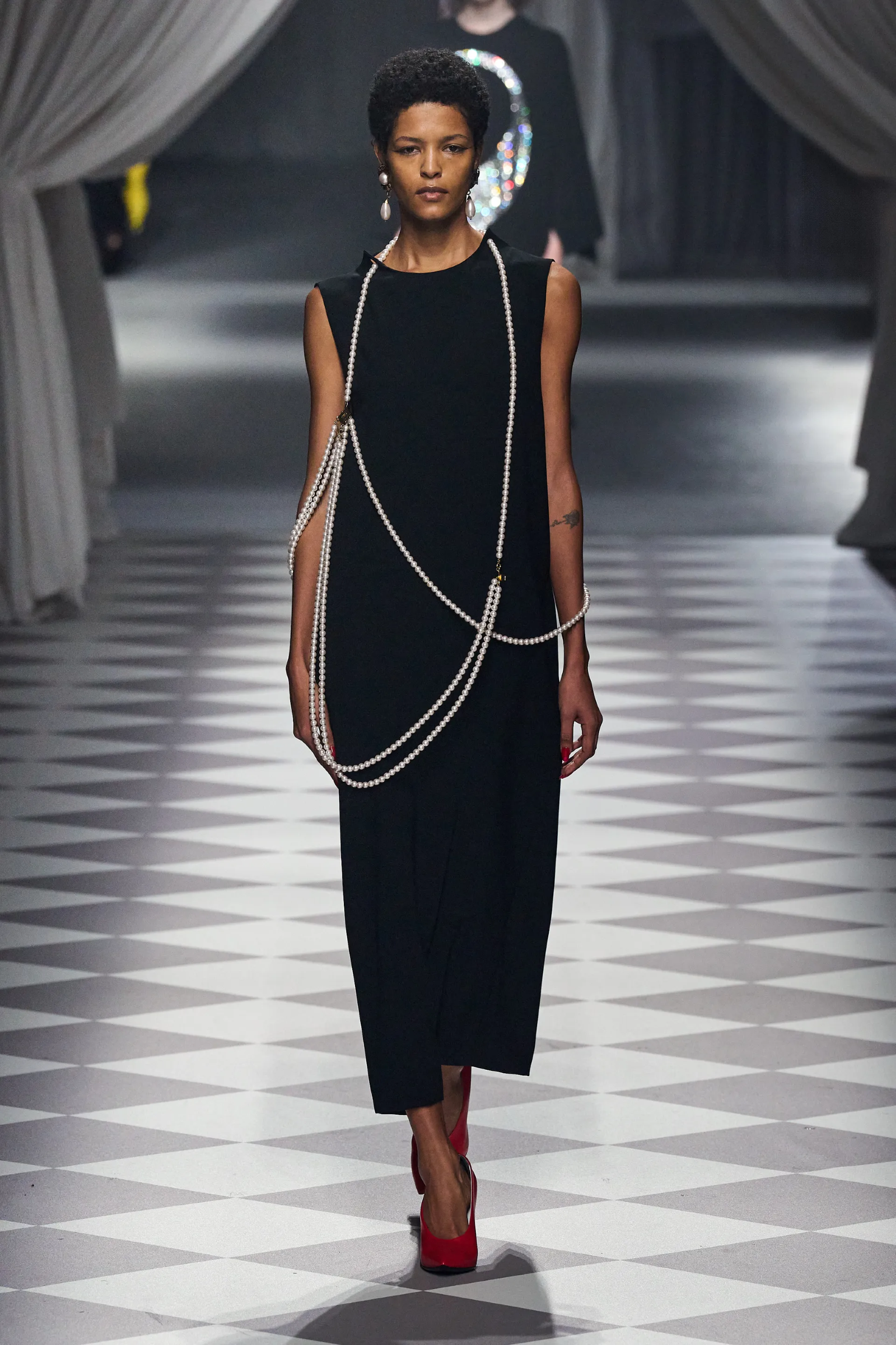 In their respective Resort 2025 collections, both Gucci and Dior have used pearls in different ways. In his recent show in London, Sabato De Sarno reinvented jewelry like necklaces and bracelets by slicing the pearls in half and dislocating their volumes to create a new visual effect, while Maria Grazia Chiuri scattered them throughout her Scottish-themed looks with the apparent intent of enhancing classic punk accessories like leather chokers, black veils, as well as parts of dresses resembling chainmail and certain t-shirts. Staying within the world of Resort 2025, Chanel used them with unusual moderation (considering that pearls are one of the brand's fundamental codes) and even Givenchy applied pearls to the collar of a jacket – among other things, as did Ahluwalia who embroidered them onto garments along with other trinkets and gems to embellish the dresses in her FW24 collection. This season, pearls have not been lacking: they were tightly wound around the necks of Celine's models, draped like manes over the chest of one of Balmain's looks, and encrusted various key pieces of Louis Vuitton's cowboy-inspired collection. Moschino adorned long black dresses with long strands of pearls in Appiolaza's debut collection, and of course, Miu Miu placed them around the necks of all its prim and proper nymphs in its latest collection.