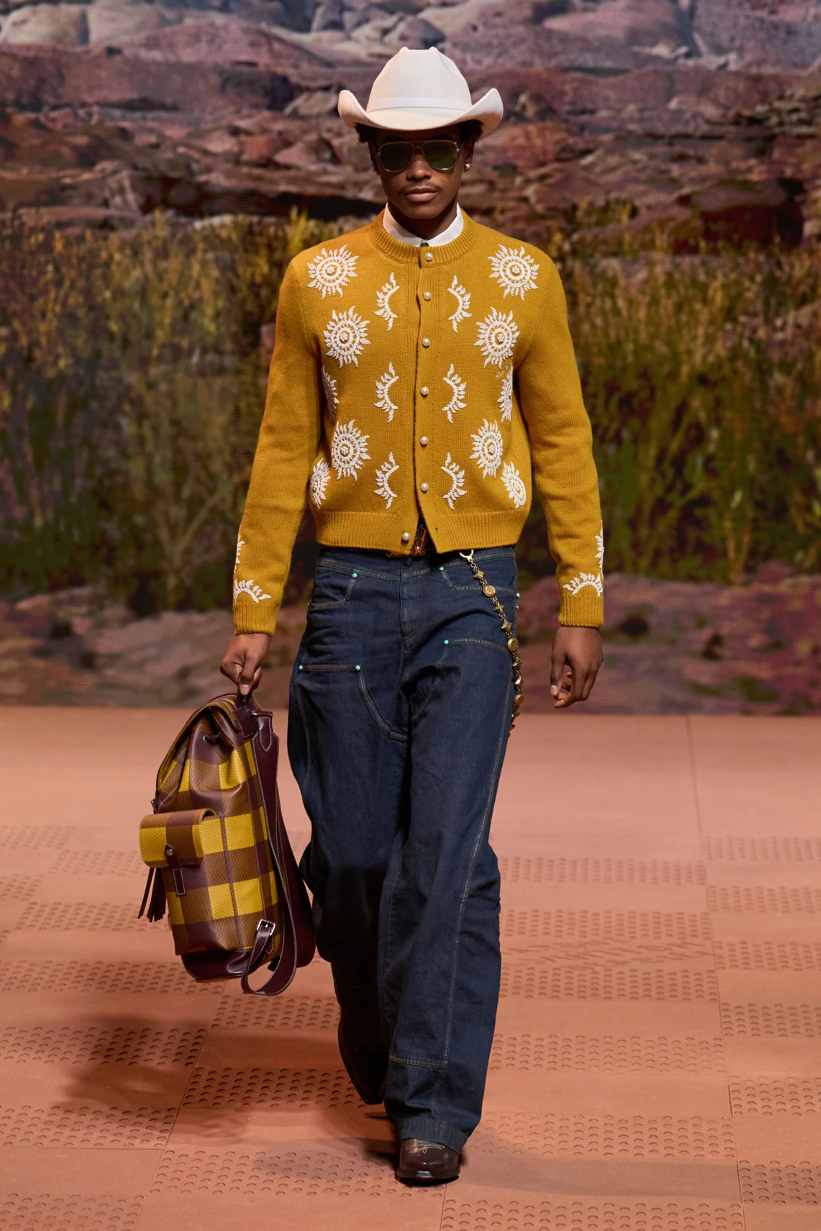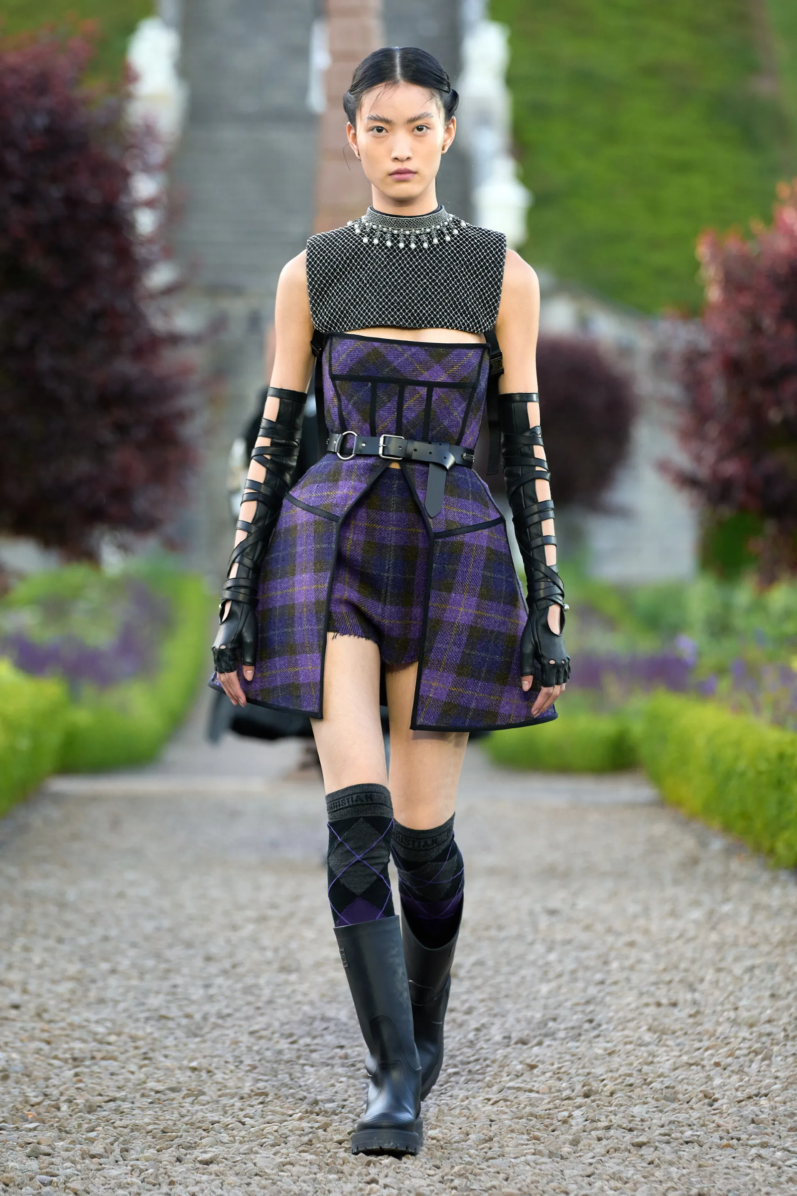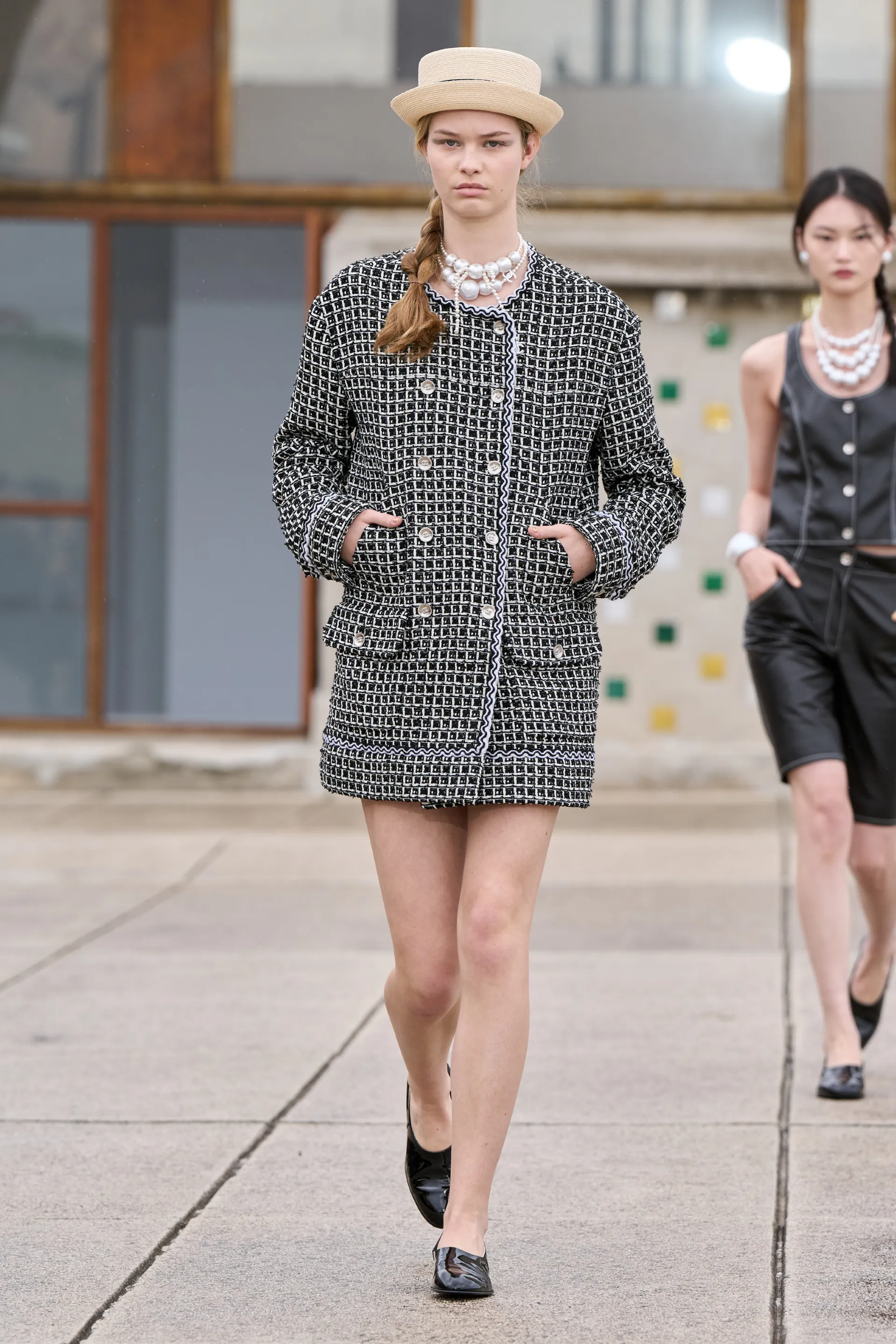 In their respective Resort 2025 collections, both Gucci and Dior have used pearls in different ways. In his recent show in London, Sabato De Sarno reinvented jewelry like necklaces and bracelets by slicing the pearls in half and dislocating their volumes to create a new visual effect, while Maria Grazia Chiuri scattered them throughout her Scottish-themed looks with the apparent intent of enhancing classic punk accessories like leather chokers, black veils, as well as parts of dresses resembling chainmail and certain t-shirts. Staying within the world of Resort 2025, Chanel used them with unusual moderation (considering that pearls are one of the brand's fundamental codes) and even Givenchy applied pearls to the collar of a jacket – among other things, as did Ahluwalia who embroidered them onto garments along with other trinkets and gems to embellish the dresses in her FW24 collection. This season, pearls have not been lacking: they were tightly wound around the necks of Celine's models, draped like manes over the chest of one of Balmain's looks, and encrusted various key pieces of Louis Vuitton's cowboy-inspired collection. Moschino adorned long black dresses with long strands of pearls in Appiolaza's debut collection, and of course, Miu Miu placed them around the necks of all its prim and proper nymphs in its latest collection.