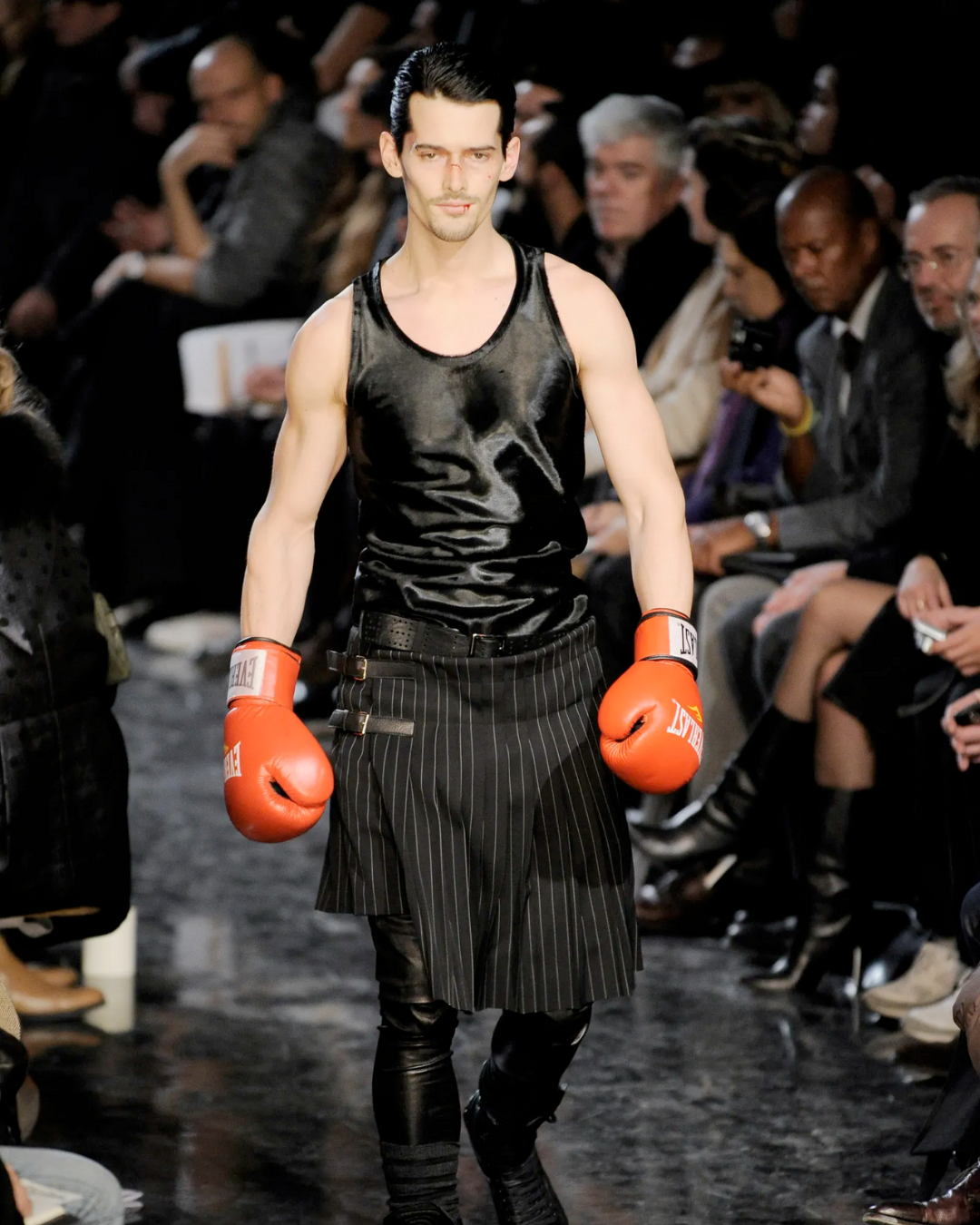 His show, sponsored by Everlast, took place around a boxing ring, where women in corsets kickboxed while male models walked in outfits inspired by fight clubs. Gaultier masterfully blended fashion and boxing, presenting layered pieces including fluid mesh t-shirts, belted ring robes, leather jackets and trousers with protective padding, as well as zip-up hoodies and drawstring jersey pants. Boxing gloves transformed into accessories and championship belts integrated into the outfits added a provocative and iconic touch, transforming each model into a true style gladiator.