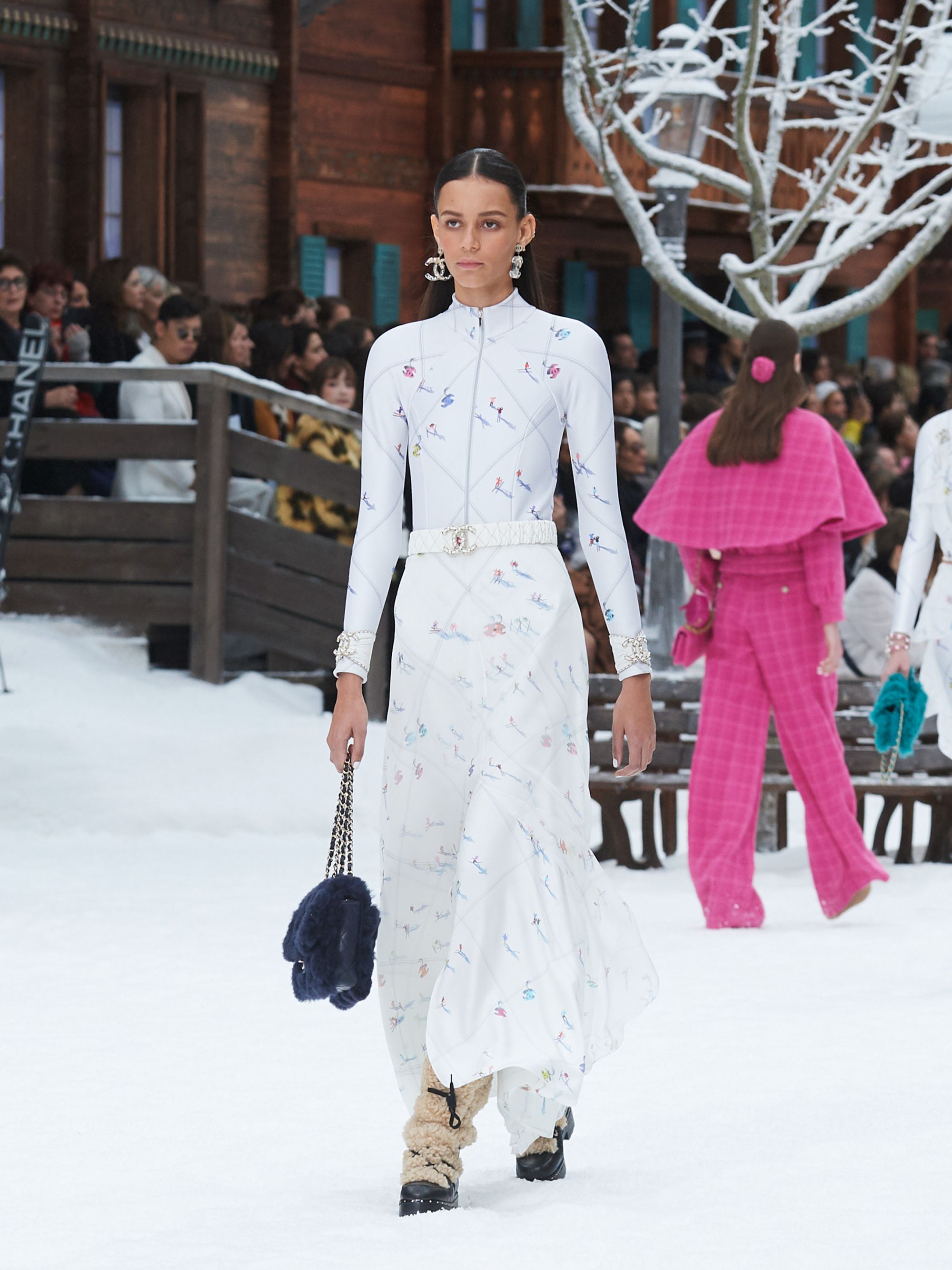 Chanel's FW19 collection, under the direction of Karl Lagerfeld, sublimated the world of skiing with undeniable sophistication. The collection featured elegant ski suits, quilted jackets, and snow pants, enriched with sumptuous details such as furs, sequins, and metal accessories. Tones of white and silver, combined with geometric patterns, evoked snowy landscapes with a sense of luxury and refinement. Ski goggles and beanies adorned with Chanel logos completed the look, making this collection a brilliant tribute to both sport and haute couture.