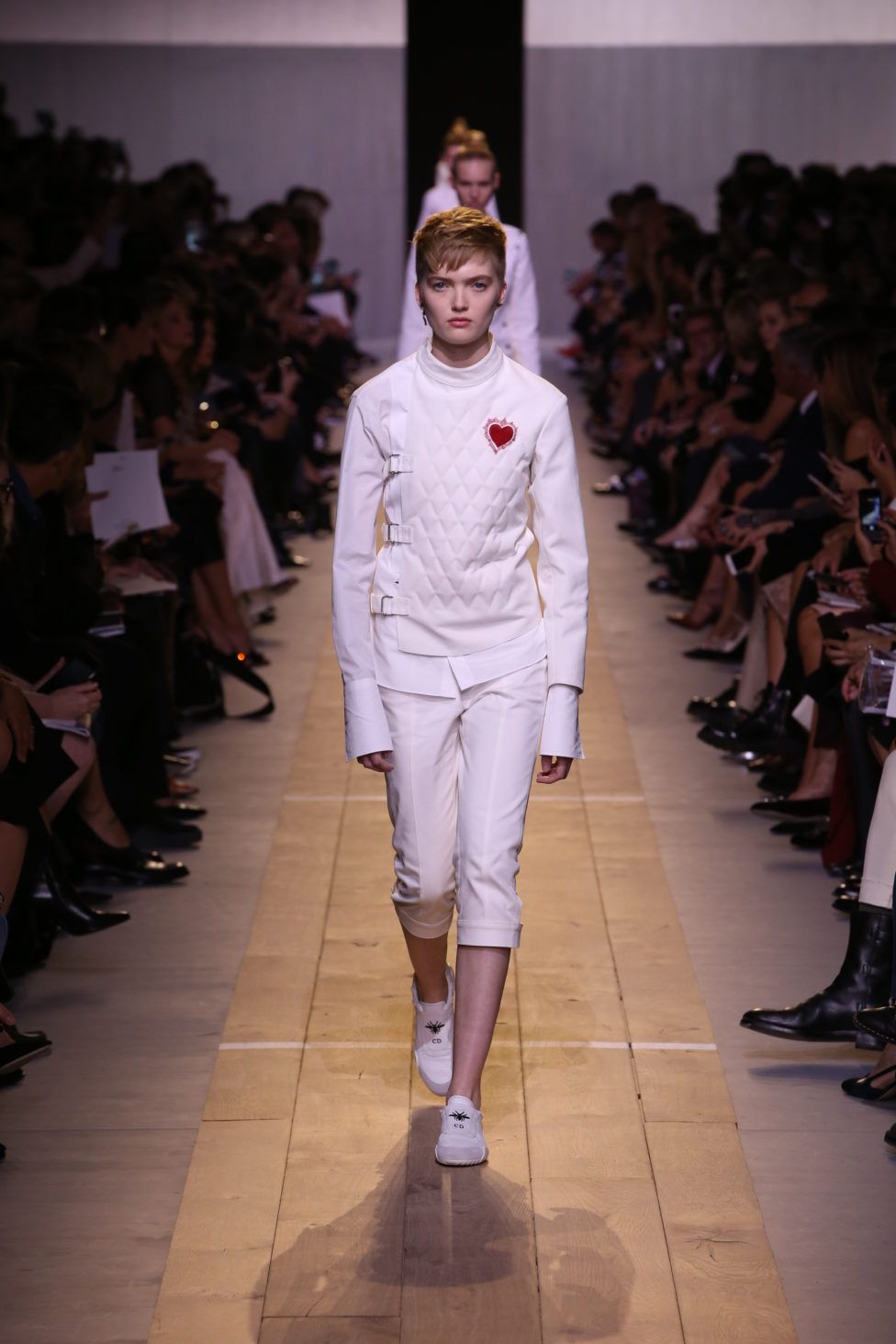 For her SS17 collection, Maria Grazia Chiuri brought an aura of aristocratic elegance to Dior, inspired by fencing. The structured jackets and high-waisted trousers evoke the outfits of fencers with modern sophistication. Key pieces included gray wool jackets and fitted trousers, reminiscent of the sport's protective clothing, while being embellished with leather details and elegant embroidery. The collection also played on crisp, contrasting colors like black and white and incorporated mesh elements reminiscent of fencers' metal protections.