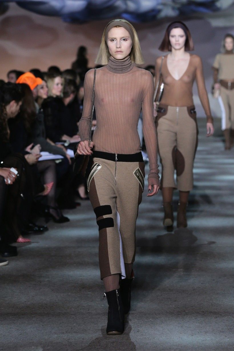 Marc Jacobs delved into the world of equestrian sports for his FW14 collection, showcasing a contemporary vision of this aristocratic sport. Key pieces included tweed jackets, leather trousers, and high leather boots, all enhanced by elegant details such as leather belts and wide-brimmed hats. Jacobs also incorporated subtle equestrian motifs and deep colors like burgundy and forest green, adding a touch of luxury and tradition. The collection thus reinterpreted equestrian chic with a modern and bold sensibility.