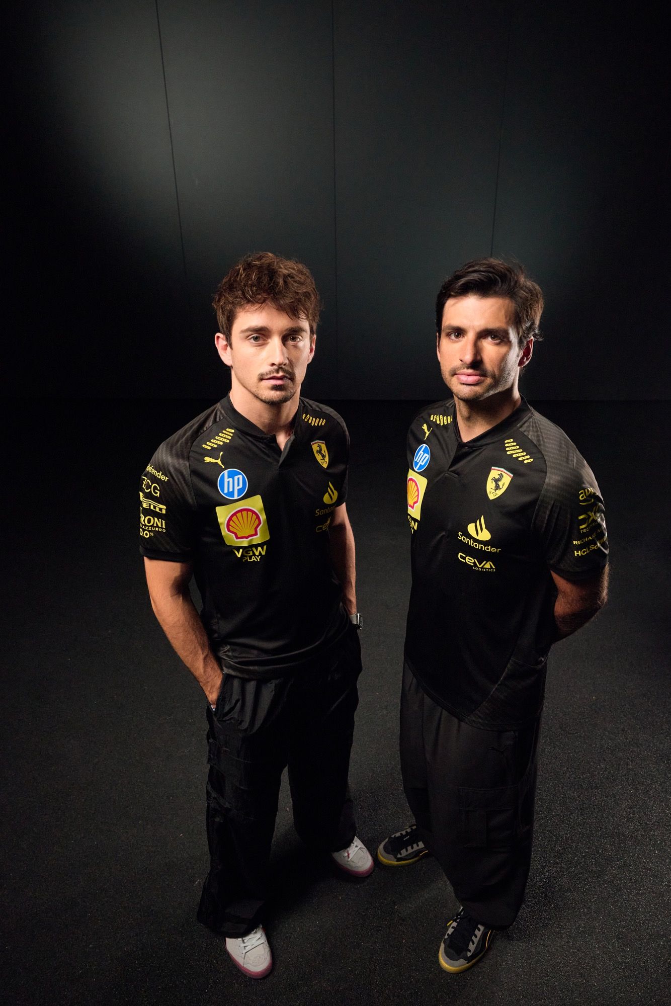 The new Scuderia Ferrari uniform, unveiled to the public during the Grand Prix, is entirely inspired by one of the most revolutionary materials in the history of the sport: carbon fiber. Presented for the first time in the heart of the Monza racetrack, the collection offers a direct reference to the spirit of innovation that characterizes the Maranello team, while also paying homage to a material that has forever changed the world of Formula 1. As always, the protagonists of the campaign are drivers Charles Leclerc and Carlos Sainz, who with their strong personalities ignite the passion of Scuderia Ferrari's new total black look. In the Italian Grand Prix, Leclerc and Sainz will wear special versions of their Bell helmets, featuring visible carbon fiber parts among the historic colors of Ferrari and the city of Modena, red and yellow.