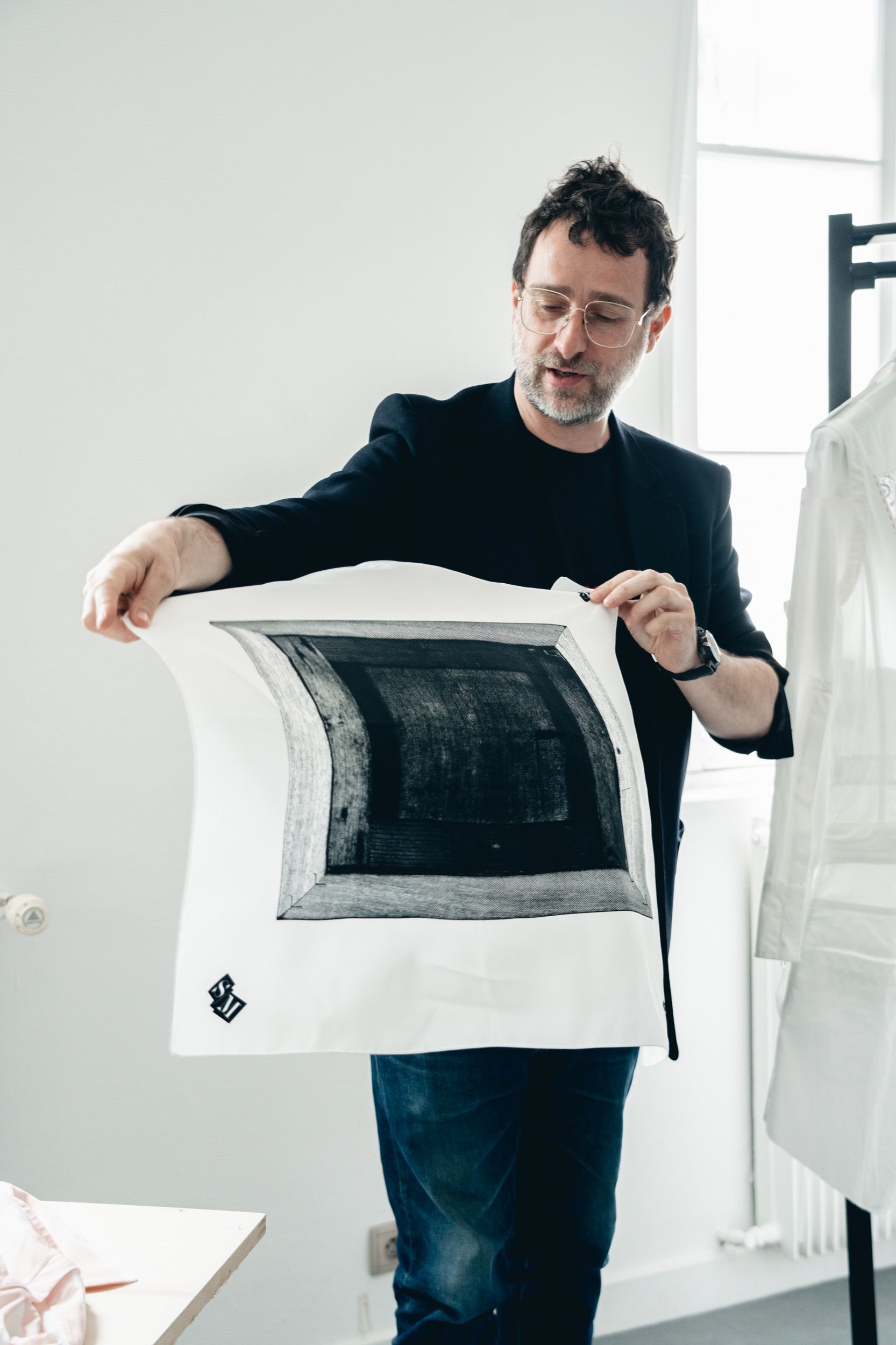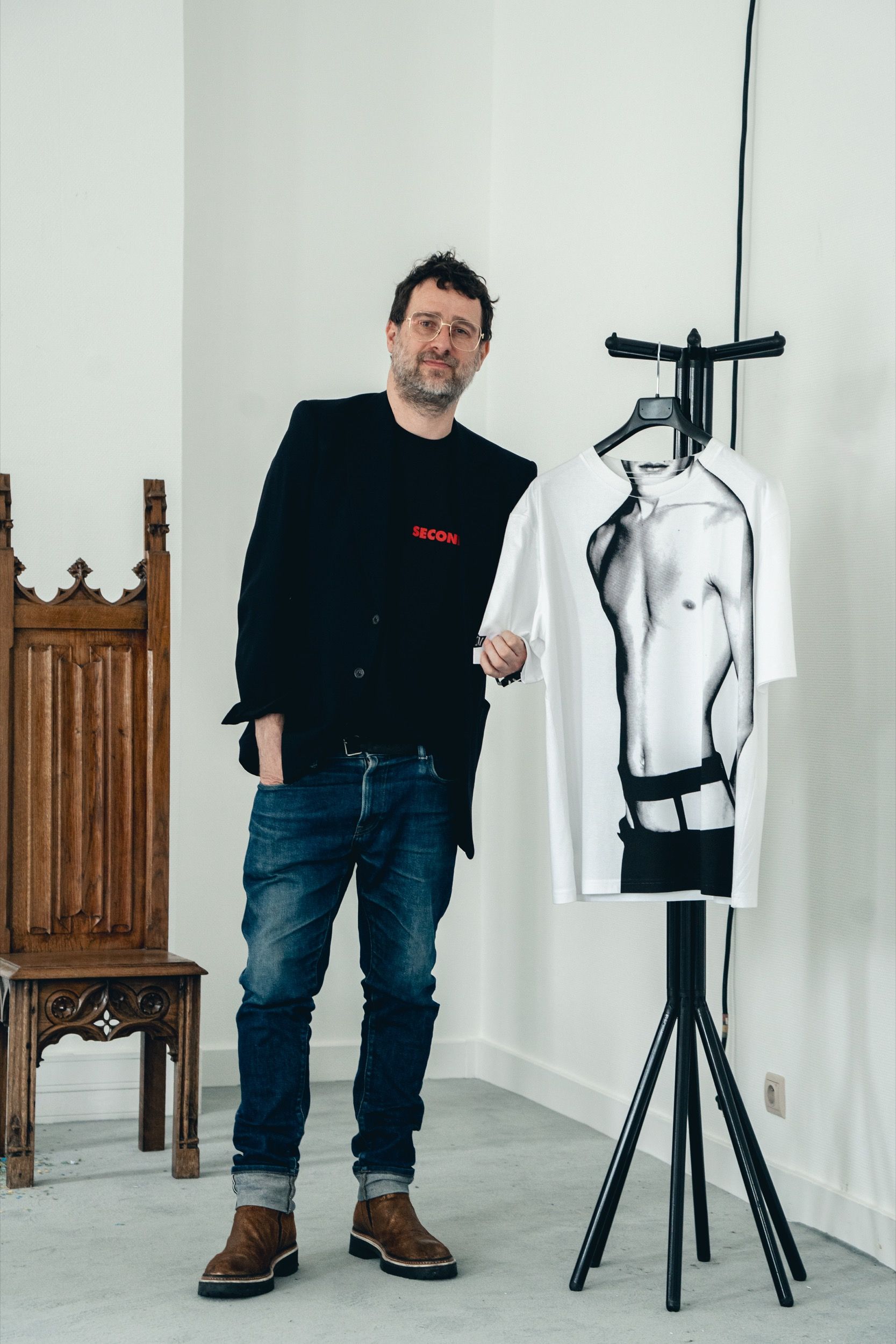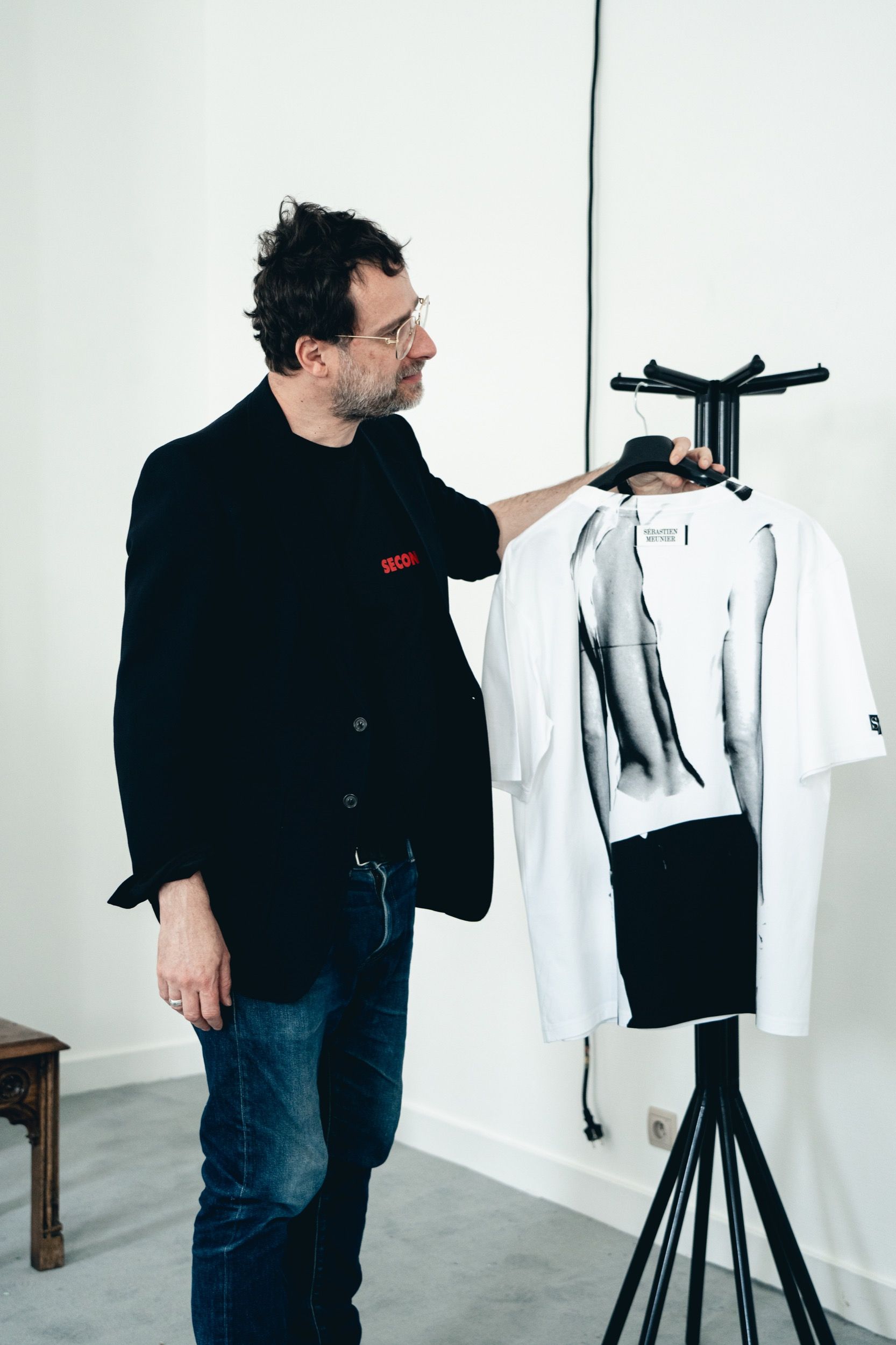 Dressing a body. This is the fundamental act underlying the operation of an industry that, in Italy alone, generates over 102 billion euros a year: dressing a body. And thus determining its perception, creating an entire narrative through a material medium, sometimes even a world, if we are willing to see it. This is how women discovered miniskirts, reclaiming their sexual liberation in the swinging '60s, and how men, with the same function, discovered the same garment 30 years later. But it all starts with the body, with how much we want to conceal or reveal, with the perception we want to evoke in others by dressing it one way or another. For Sébastien Meunier, this has been the case from the beginning, and it wasn’t just the body that had to be at the center of everything; it was his own body, in an obsessive quest that began during his university years, with the victory of his skinny punk boys at the Hyères Festival in 1998. From his role as head of menswear at Martin Margiela to the creative direction at Ann Demeulemeester, the French designer's work has taken on different nuances over the years, sometimes more subtle and romantic, crossing paths with Belgian fashion and its anonymous masters for over two decades. Today, that youthful obsession returns—because it never really went away—with his eponymous brand and a studio that draws inspiration from Arte Povera, from a work jumpsuit that can be assembled and disassembled at will, adorned with prints marking the key moments in Meunier's biography. "My work is much more sensual than it was with Ann and Martin," says the designer, speaking from the turquoise walls of his home-studio, behind him an imposing marble cross, a photograph of Marina Abramović and Ulay screaming at each other, and a rack of printed T-shirts. One reads "Holy Shit," another "A rose is a rose," and yet another features an image of a satyr, taken during a trip to Pompeii with Margiela himself ("It was then that I fell in love with Italy," he confesses). The conversation was abundant; attempting to summarize it is a necessary sin, but in that ever-changing atmosphere, surrounded by the memorabilia of a lifetime and the capsule collection marking a new chapter, Meunier revealed himself as a designer, a man, once again a boy, always in the most "instinctive way possible."