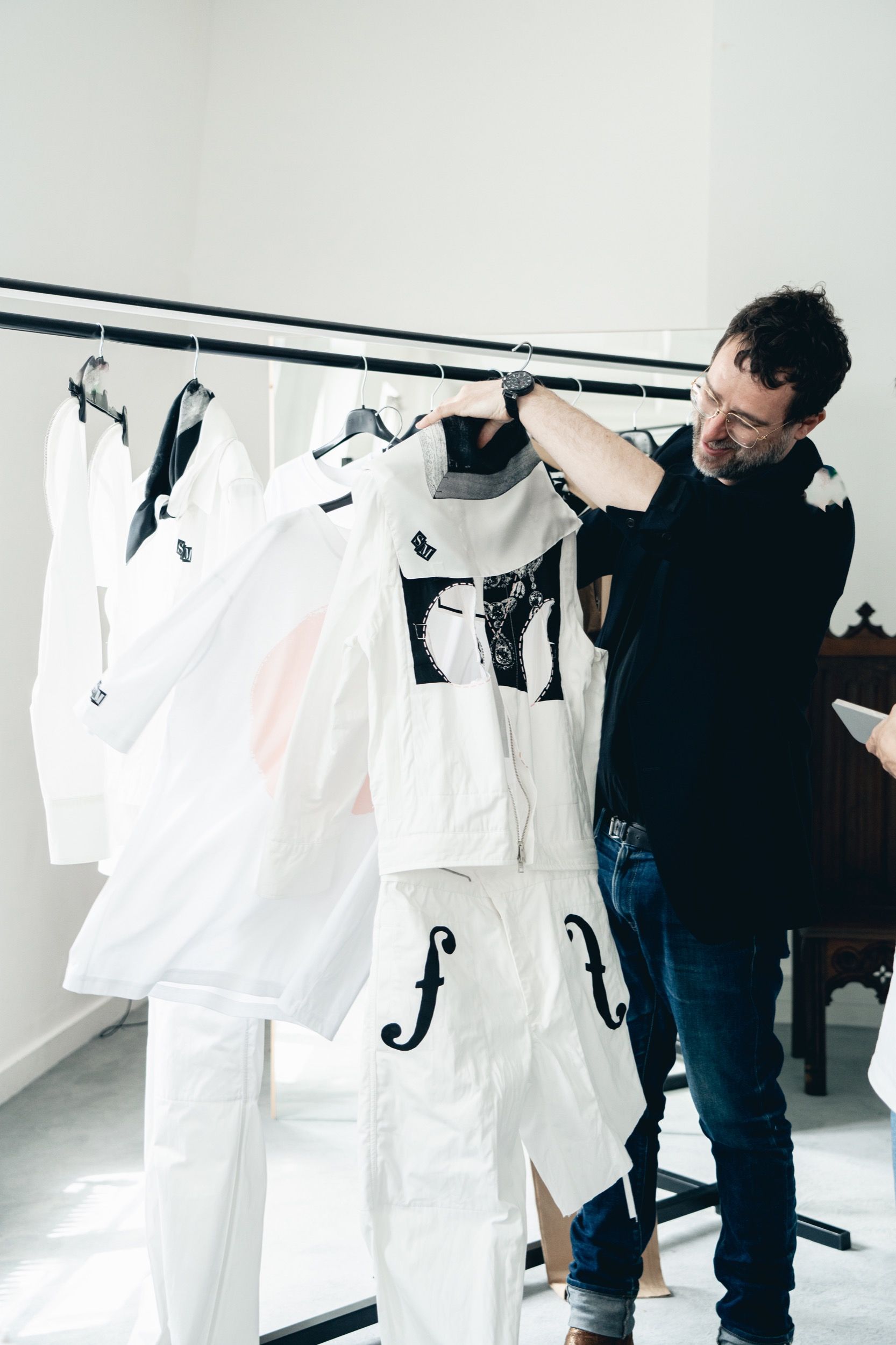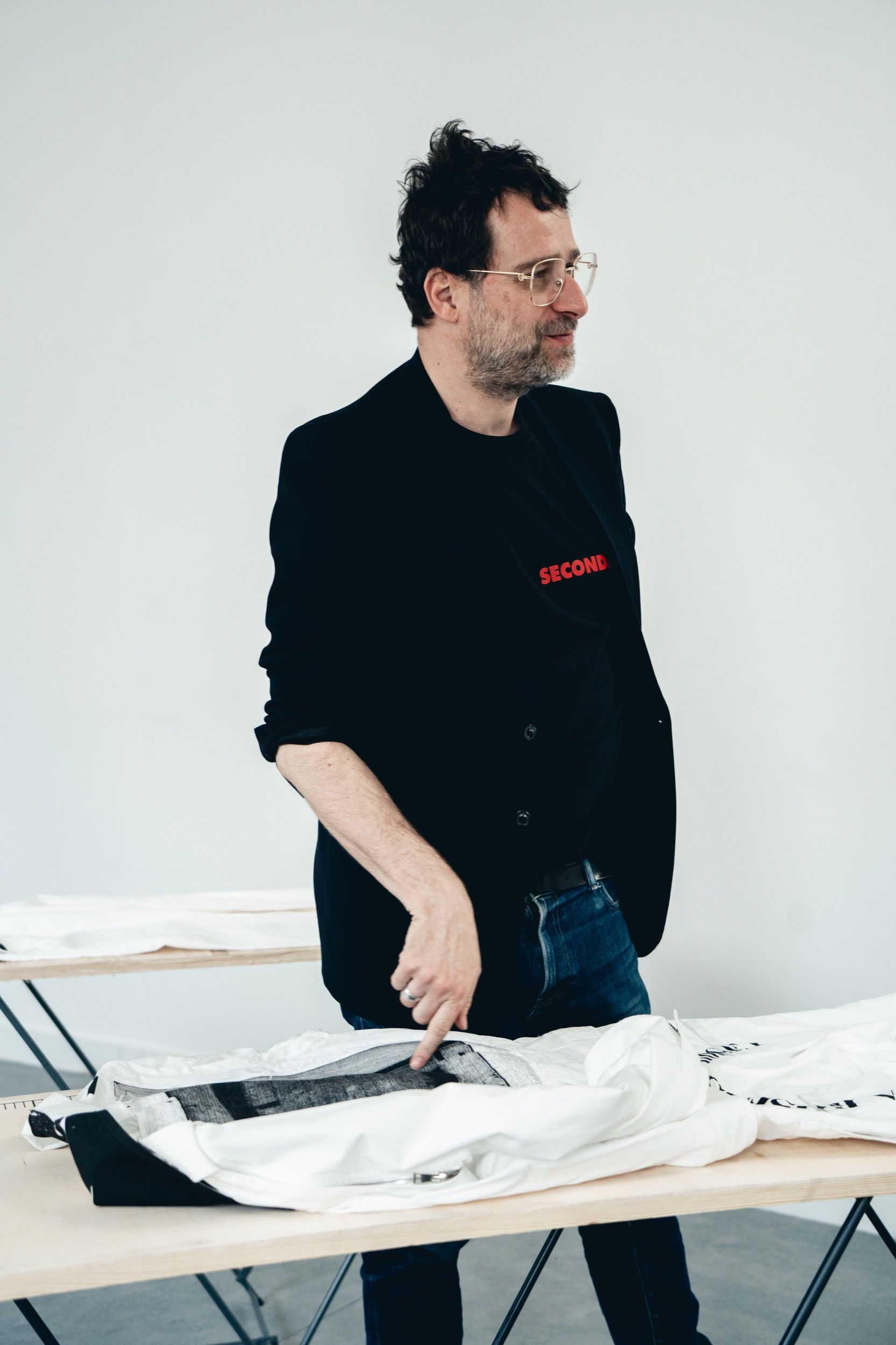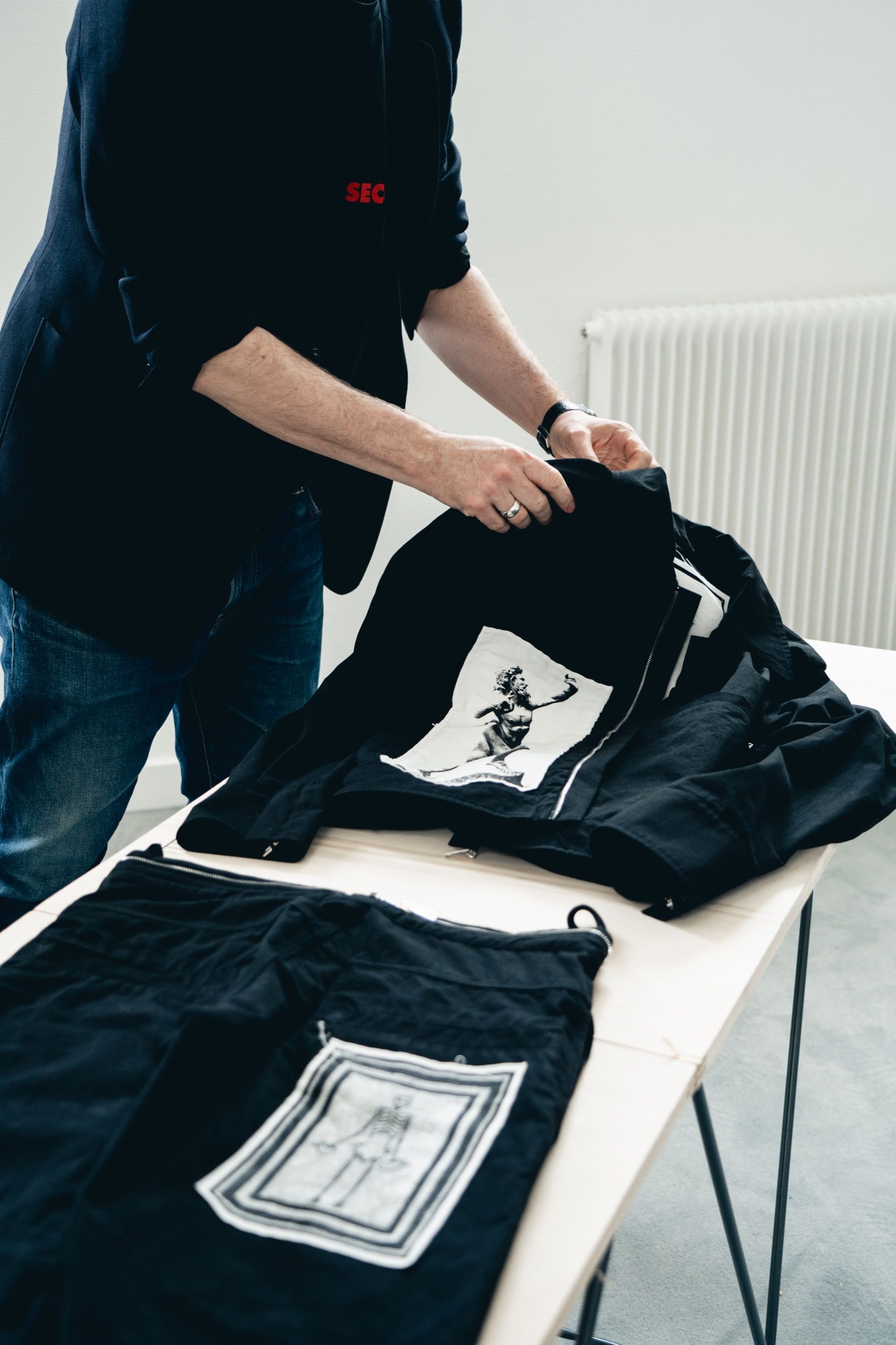Dressing a body. This is the fundamental act underlying the operation of an industry that, in Italy alone, generates over 102 billion euros a year: dressing a body. And thus determining its perception, creating an entire narrative through a material medium, sometimes even a world, if we are willing to see it. This is how women discovered miniskirts, reclaiming their sexual liberation in the swinging '60s, and how men, with the same function, discovered the same garment 30 years later. But it all starts with the body, with how much we want to conceal or reveal, with the perception we want to evoke in others by dressing it one way or another. For Sébastien Meunier, this has been the case from the beginning, and it wasn’t just the body that had to be at the center of everything; it was his own body, in an obsessive quest that began during his university years, with the victory of his skinny punk boys at the Hyères Festival in 1998. From his role as head of menswear at Martin Margiela to the creative direction at Ann Demeulemeester, the French designer's work has taken on different nuances over the years, sometimes more subtle and romantic, crossing paths with Belgian fashion and its anonymous masters for over two decades. Today, that youthful obsession returns—because it never really went away—with his eponymous brand and a studio that draws inspiration from Arte Povera, from a work jumpsuit that can be assembled and disassembled at will, adorned with prints marking the key moments in Meunier's biography. "My work is much more sensual than it was with Ann and Martin," says the designer, speaking from the turquoise walls of his home-studio, behind him an imposing marble cross, a photograph of Marina Abramović and Ulay screaming at each other, and a rack of printed T-shirts. One reads "Holy Shit," another "A rose is a rose," and yet another features an image of a satyr, taken during a trip to Pompeii with Margiela himself ("It was then that I fell in love with Italy," he confesses). The conversation was abundant; attempting to summarize it is a necessary sin, but in that ever-changing atmosphere, surrounded by the memorabilia of a lifetime and the capsule collection marking a new chapter, Meunier revealed himself as a designer, a man, once again a boy, always in the most "instinctive way possible."