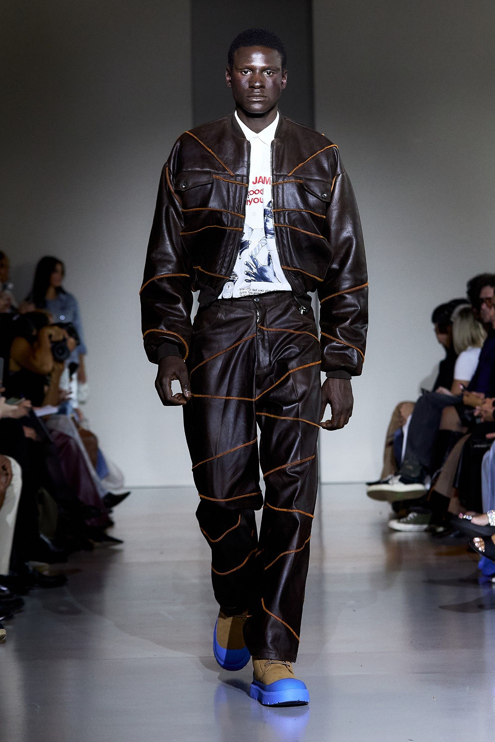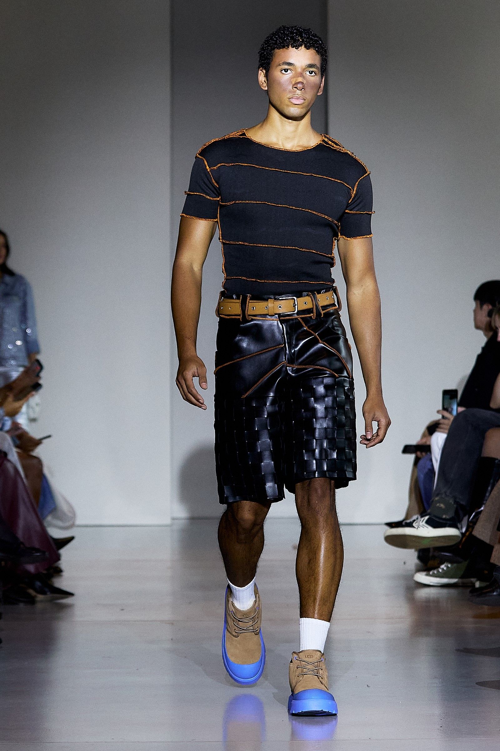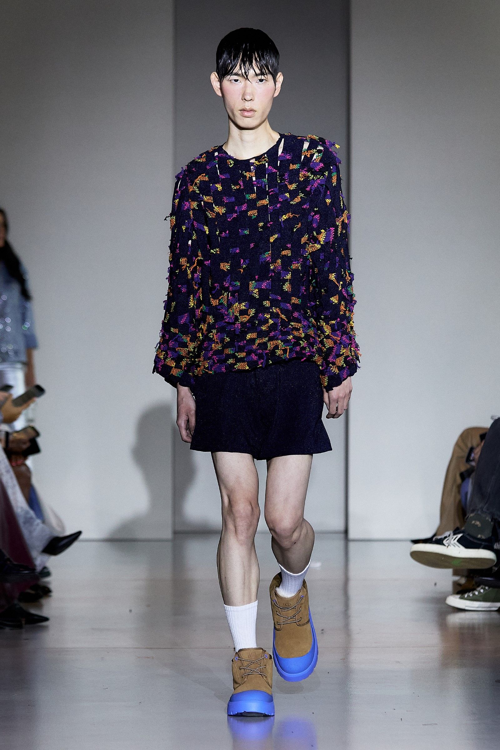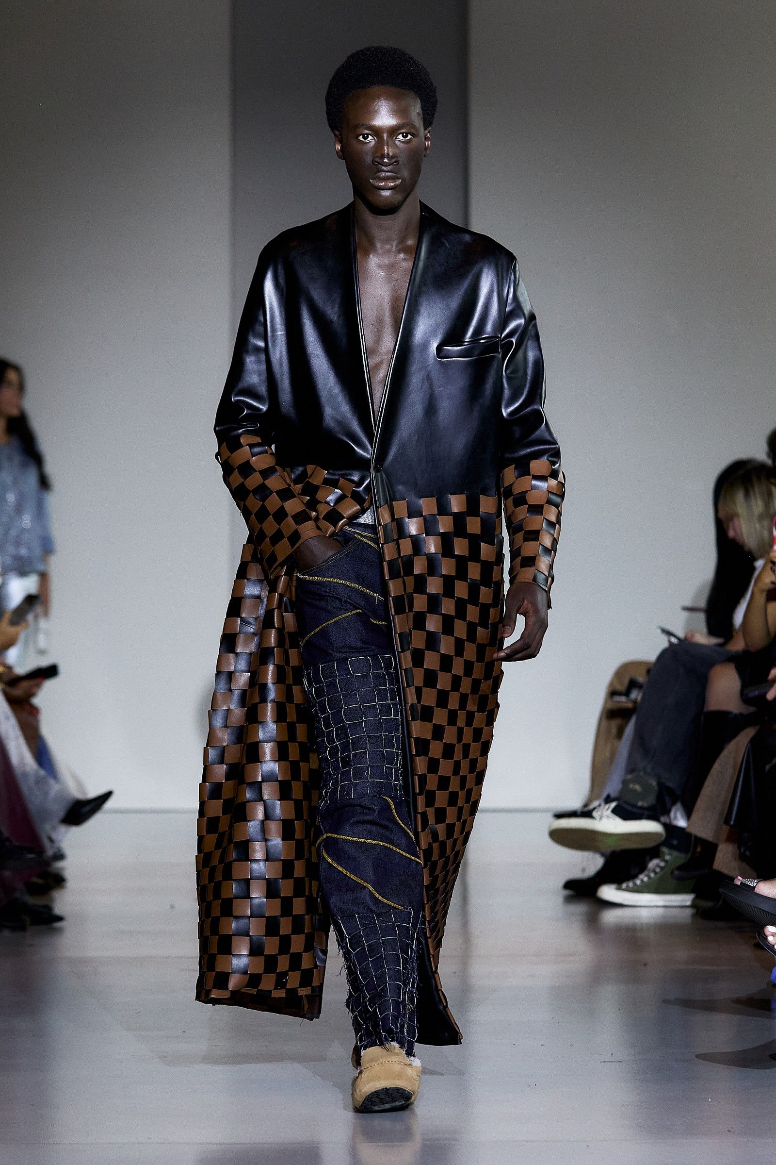 In a world that often chases perfection, the Anglo-Nigerian designer Tokyo James delivered a powerful message during Milan Fashion Week SS25 with his collection aptly titled Imperfection. Drawing from personal memories and James’ precise tailoring expertise, the collection sought to challenge the very concept of perfection around which fashion often revolves. His philosophy is simple: "We don’t have a perfect world, so why should we have perfect clothes?" This belief is at the heart of James’ creative process, which defies fashion’s obsession with precision. "I think clothes should have character, even if they’re a little unstitched. It’s OK. Chasing perfection is unsustainable, and it’s not really good for our planet." One of the key moments of the show was James' collaboration with UGG, which brought a fresh reinterpretation of the brand’s DNA, as UGG has supported a different emerging designer every season for several years now.
