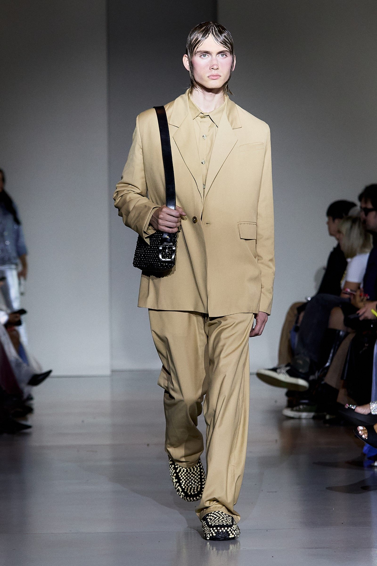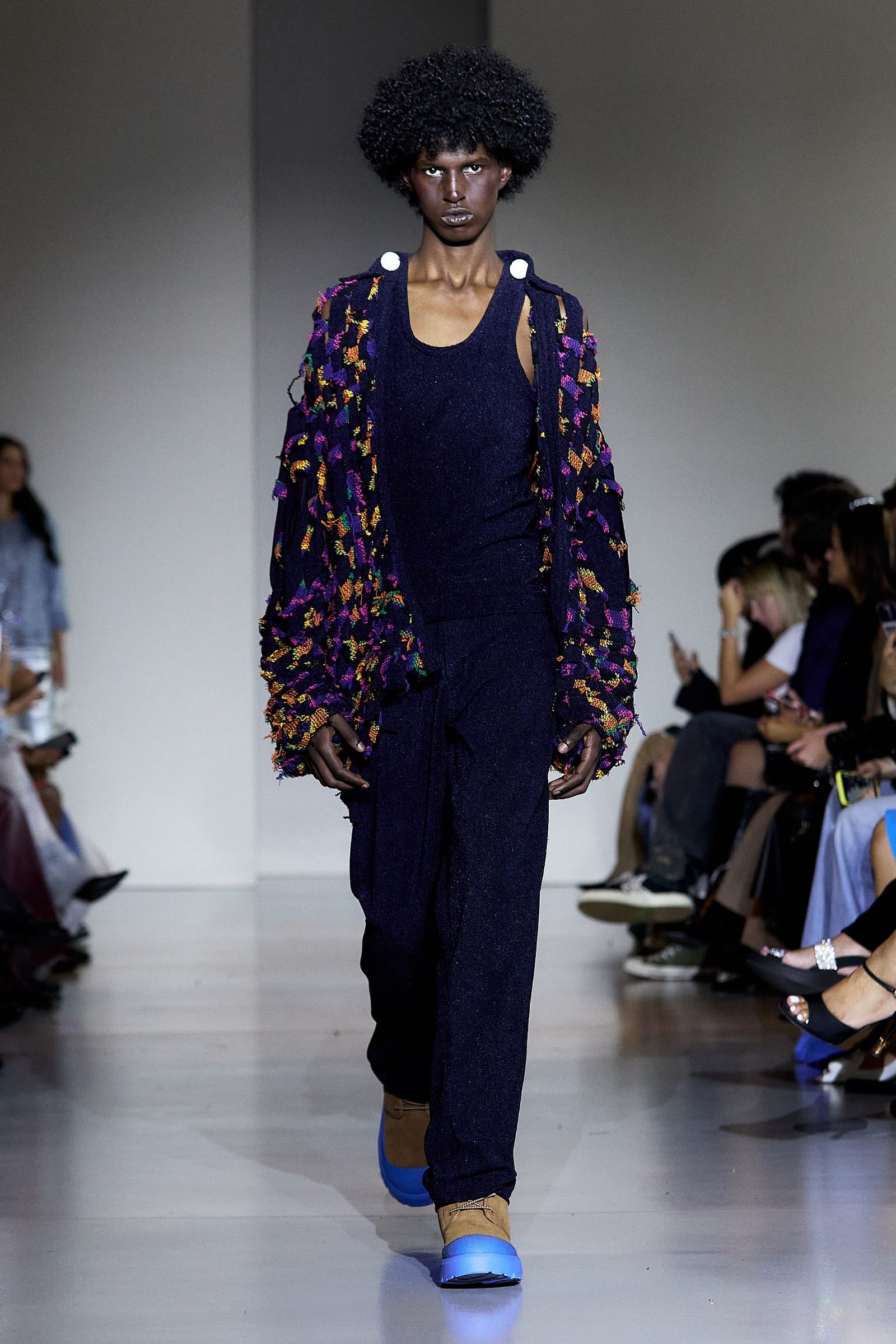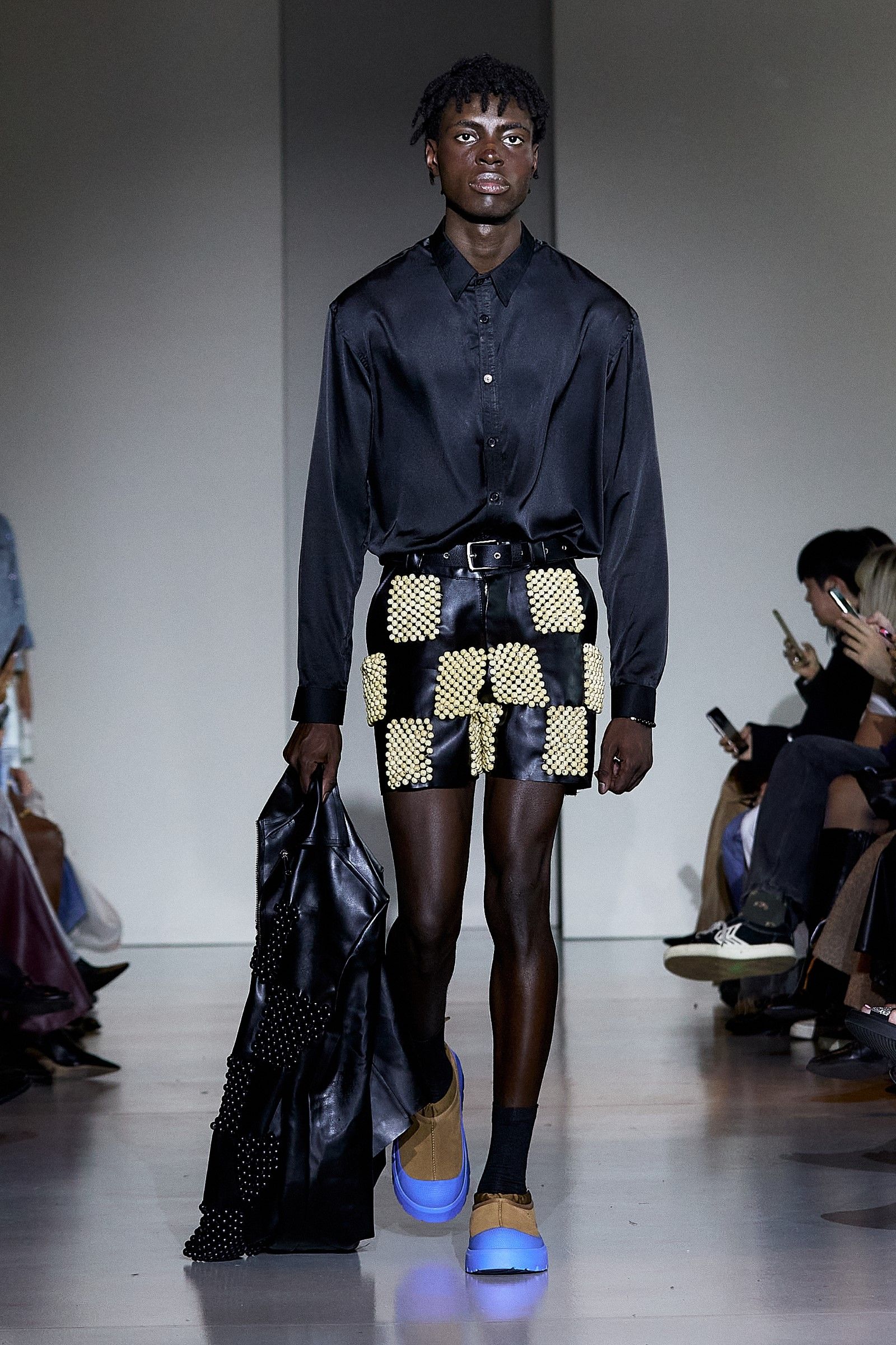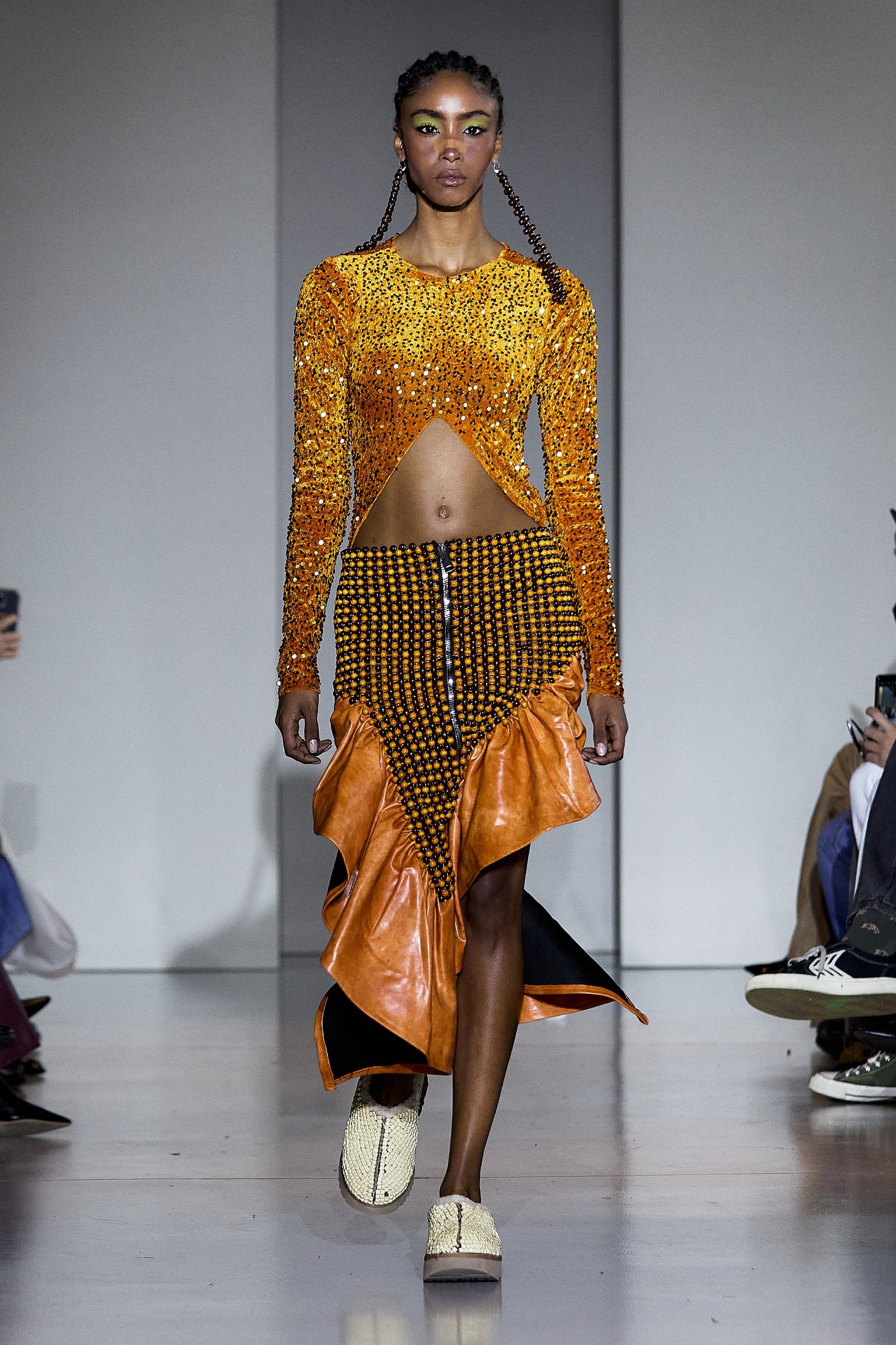 In addition to the co-branded UGG clogs, which are available in numerous other variations, including one where tobacco-colored suede is paired with a vibrant blue synthetic sole, beads were one of the fundamental elements of the collection. Their use played a crucial role in expressing the idea of intersectionality that James has always aimed to bring into fashion: "For me, intersectionality is an ongoing conversation. And that's the conversation we're constantly having." James has always explored ways to reconcile Western aesthetics with the rich heritage of Nigerian textile culture (the brand’s production is based in Lagos), which is expressed through the use of prints, woven leather, knitwear, and specific fabrics typical of certain regions. "The key style was the beads this season. We did a lot of beading, creating party dresses but also more serious and simple ones." James selected beads from different parts of Africa, with particular attention to sustainability: "The beads are Nigerian, actually a mixture between Nigerian and Senegalese. It was very important that we got them from different aspects of Africa, and in Senegal, they’re sustainably produced." Some of the pieces, he notes, were in production since February, demonstrating the care and time invested in each look. The result is a fashion that is "very clean, but with a little bit of drama. Drama is life."