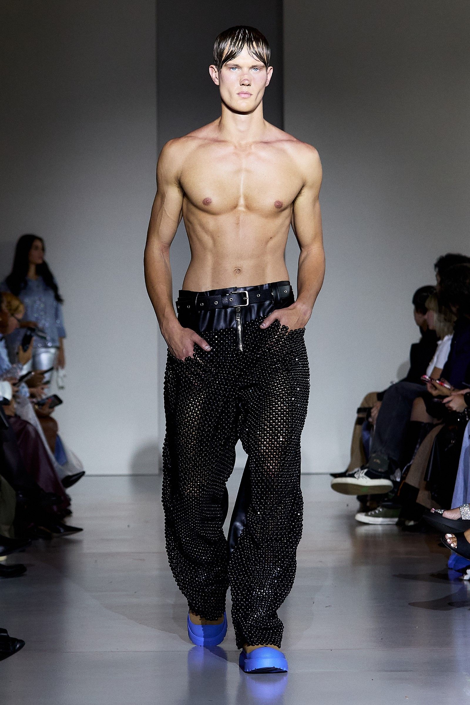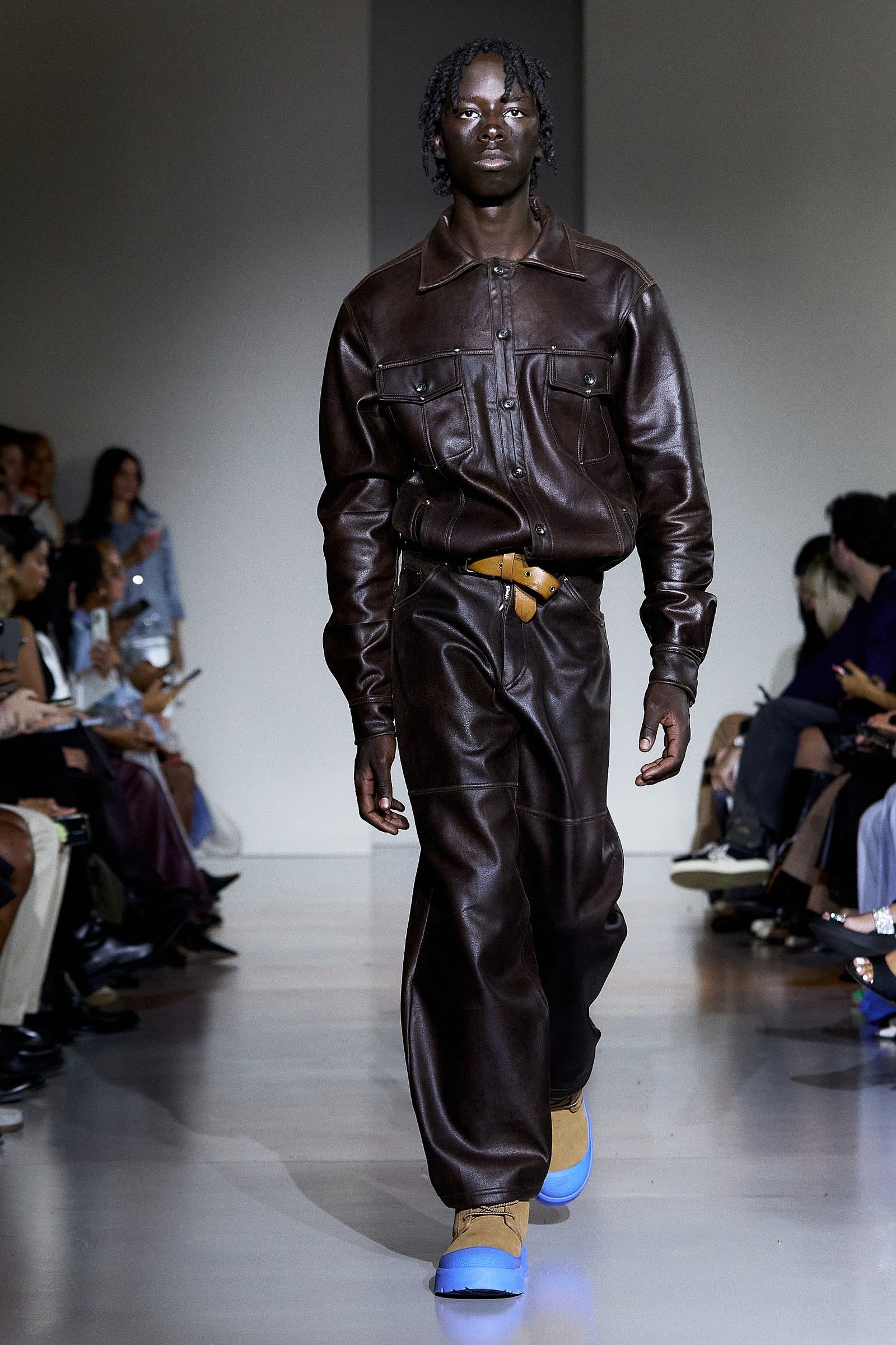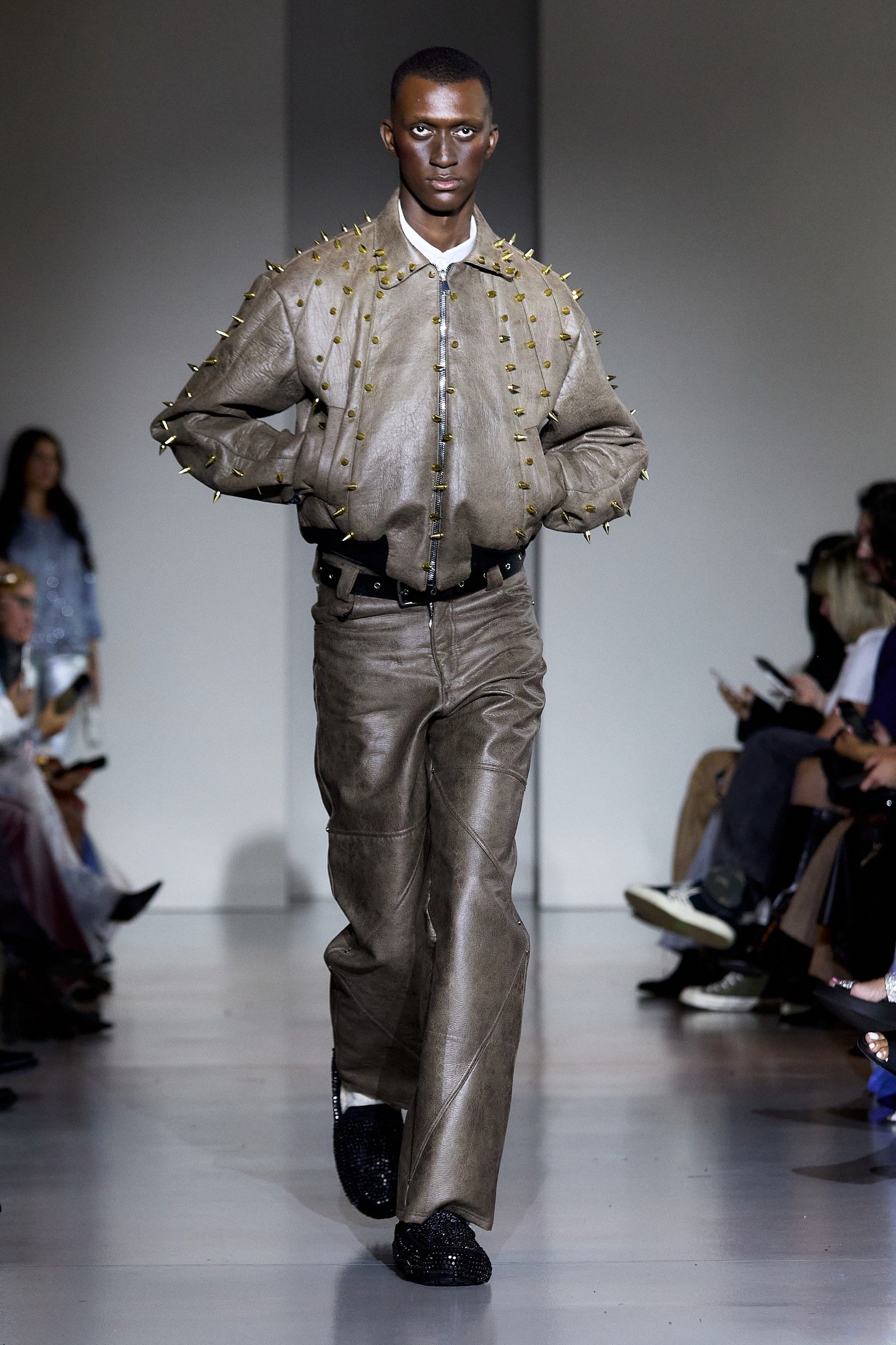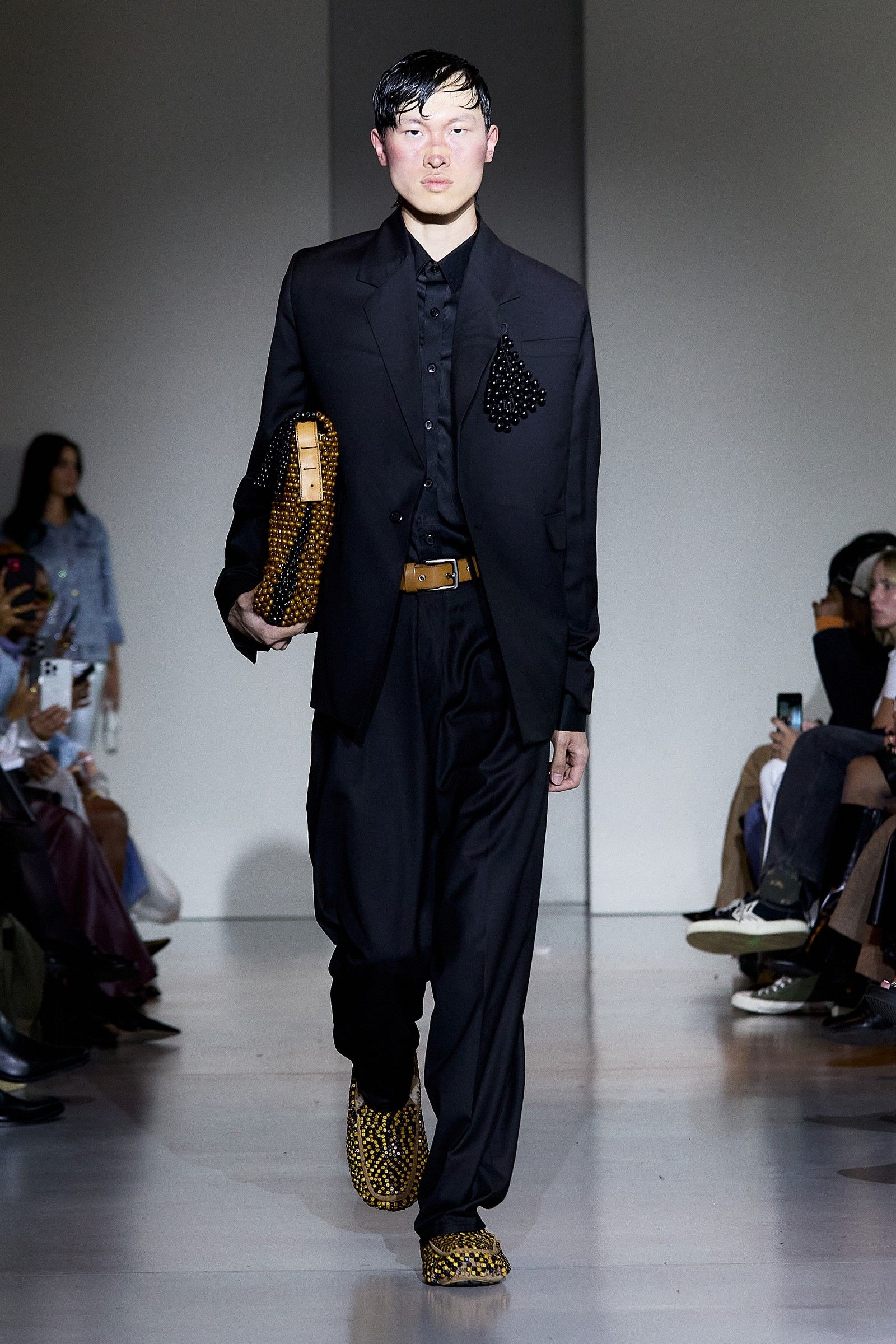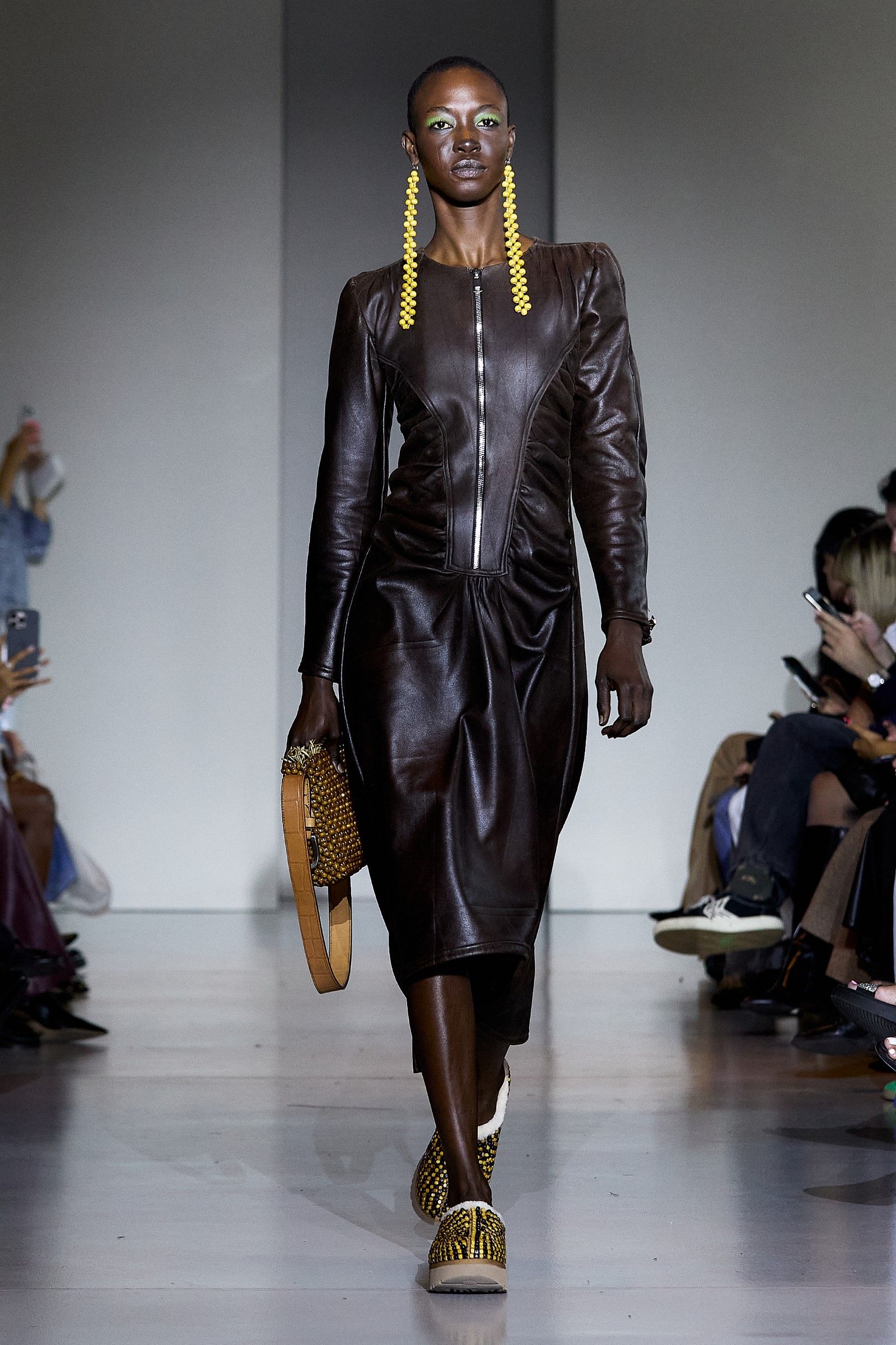In addition to the co-branded UGG clogs, which are available in numerous other variations, including one where tobacco-colored suede is paired with a vibrant blue synthetic sole, beads were one of the fundamental elements of the collection. Their use played a crucial role in expressing the idea of intersectionality that James has always aimed to bring into fashion: "For me, intersectionality is an ongoing conversation. And that's the conversation we're constantly having." James has always explored ways to reconcile Western aesthetics with the rich heritage of Nigerian textile culture (the brand’s production is based in Lagos), which is expressed through the use of prints, woven leather, knitwear, and specific fabrics typical of certain regions. "The key style was the beads this season. We did a lot of beading, creating party dresses but also more serious and simple ones." James selected beads from different parts of Africa, with particular attention to sustainability: "The beads are Nigerian, actually a mixture between Nigerian and Senegalese. It was very important that we got them from different aspects of Africa, and in Senegal, they’re sustainably produced." Some of the pieces, he notes, were in production since February, demonstrating the care and time invested in each look. The result is a fashion that is "very clean, but with a little bit of drama. Drama is life."