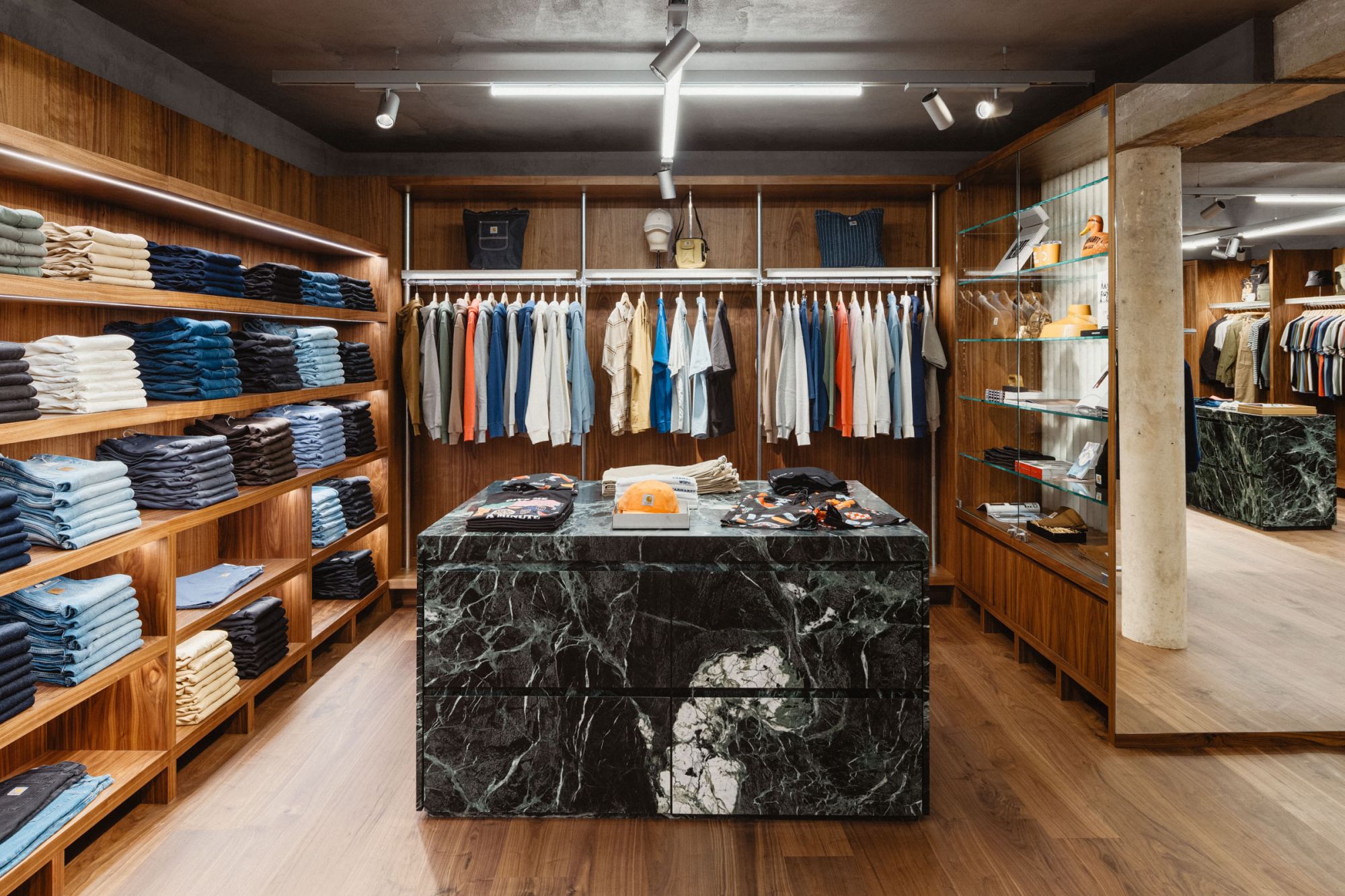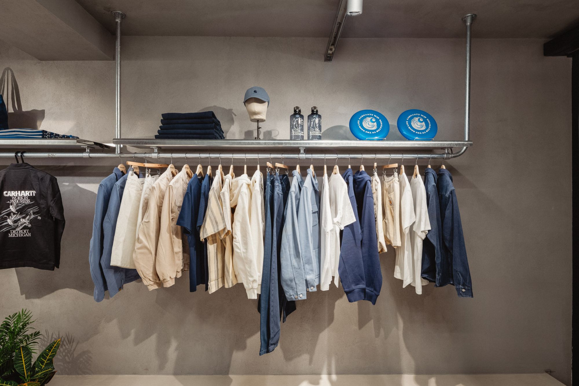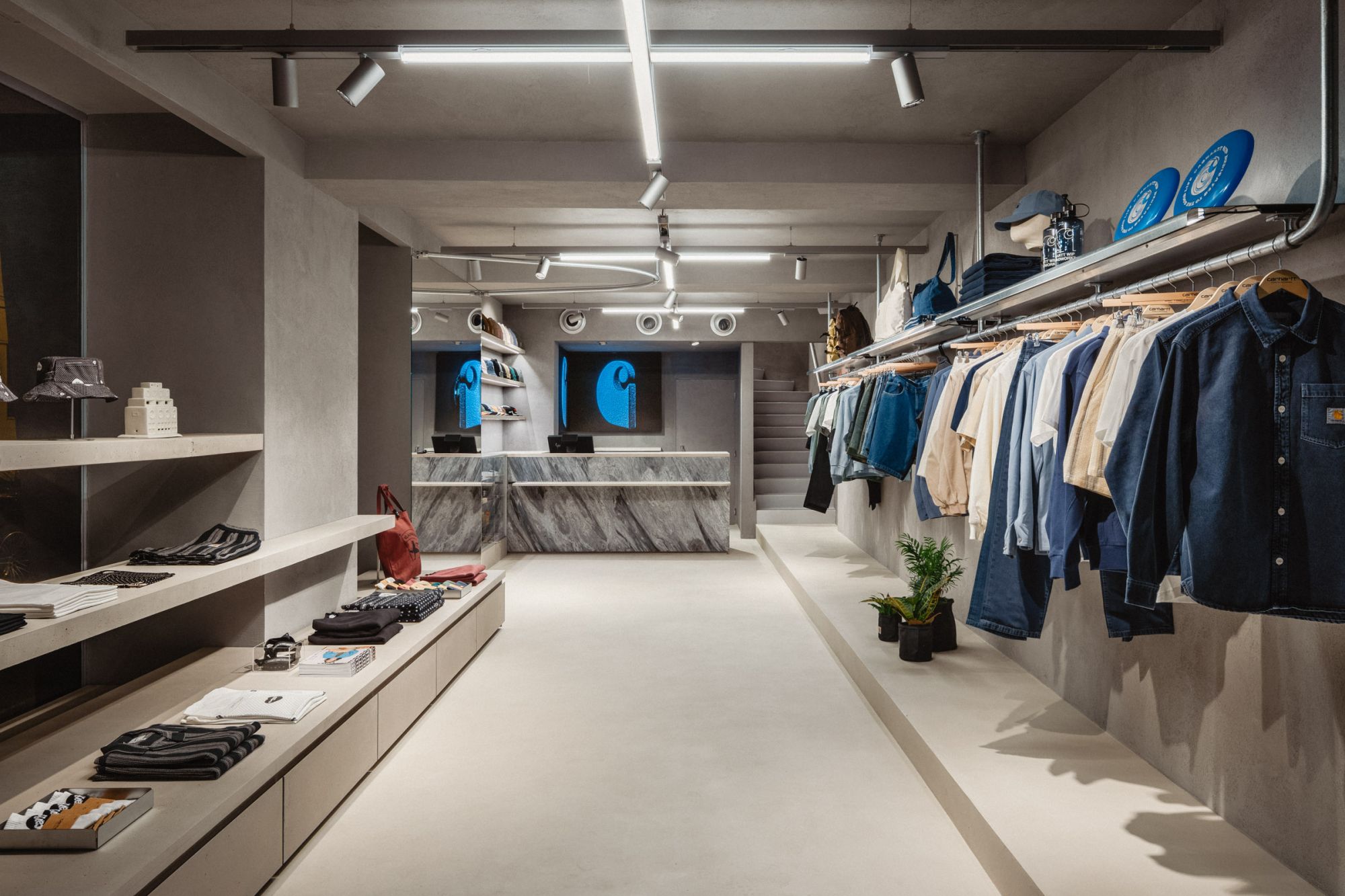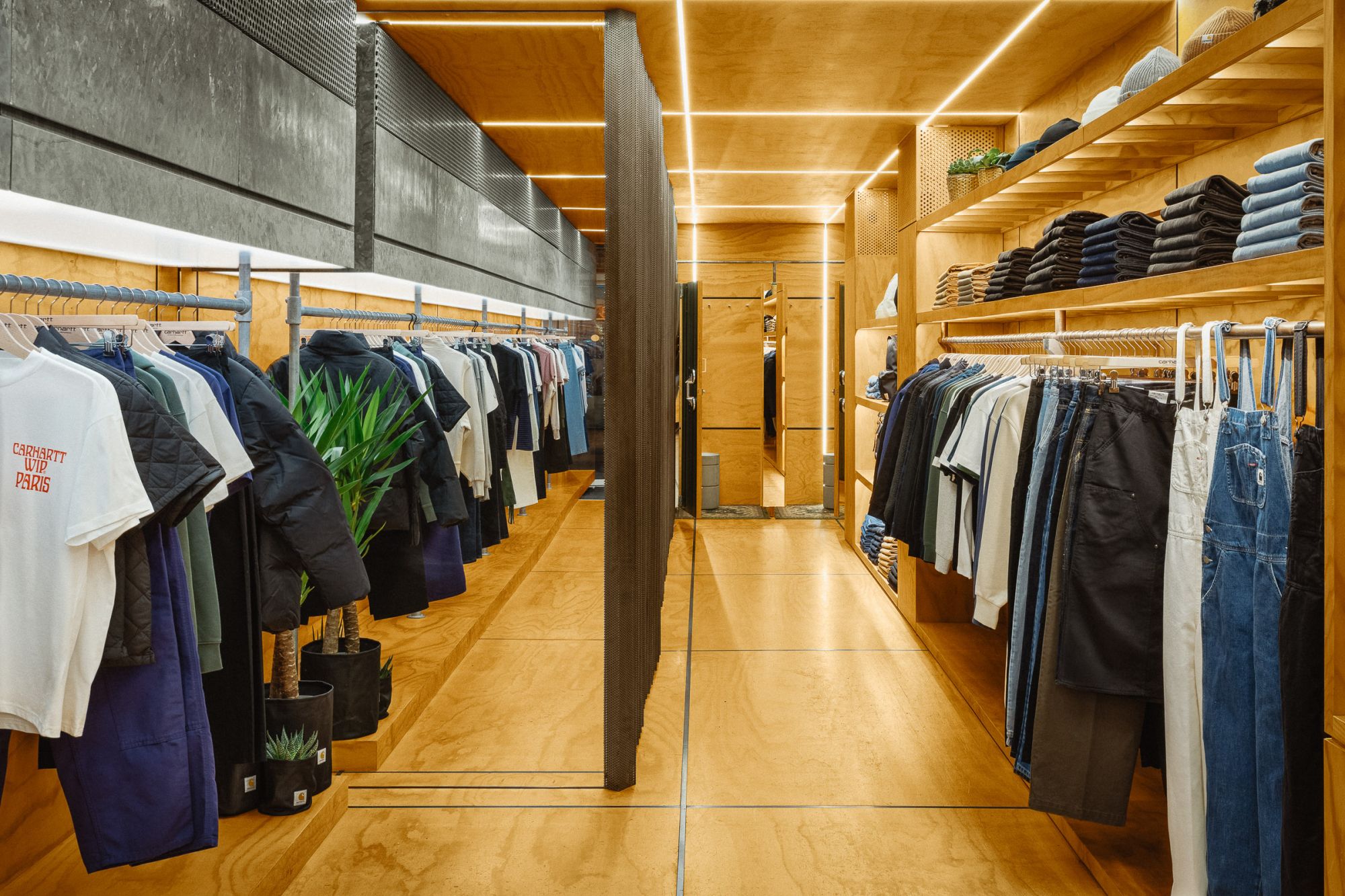 Twenty years ago, Carhartt WIP opened its first French store on the east side of Rue Saint-Honoré, contributing to the already vibrant energy of the neighborhood. Today, the brand strengthens its historic connection with the area by opening a second adjacent store. Designed by Salomee Faeh and Milanese architect studio Andrea Caputo, the new store is located at 72 Rue Saint-Honoré and currently houses the men’s collection, seamlessly integrating into the existing architecture while adding a touch of modernity. The space pays tribute to the city’s rich architectural heritage, where natural wood furniture is contrasted by industrial details such as concrete surfaces and galvanized steel rails.