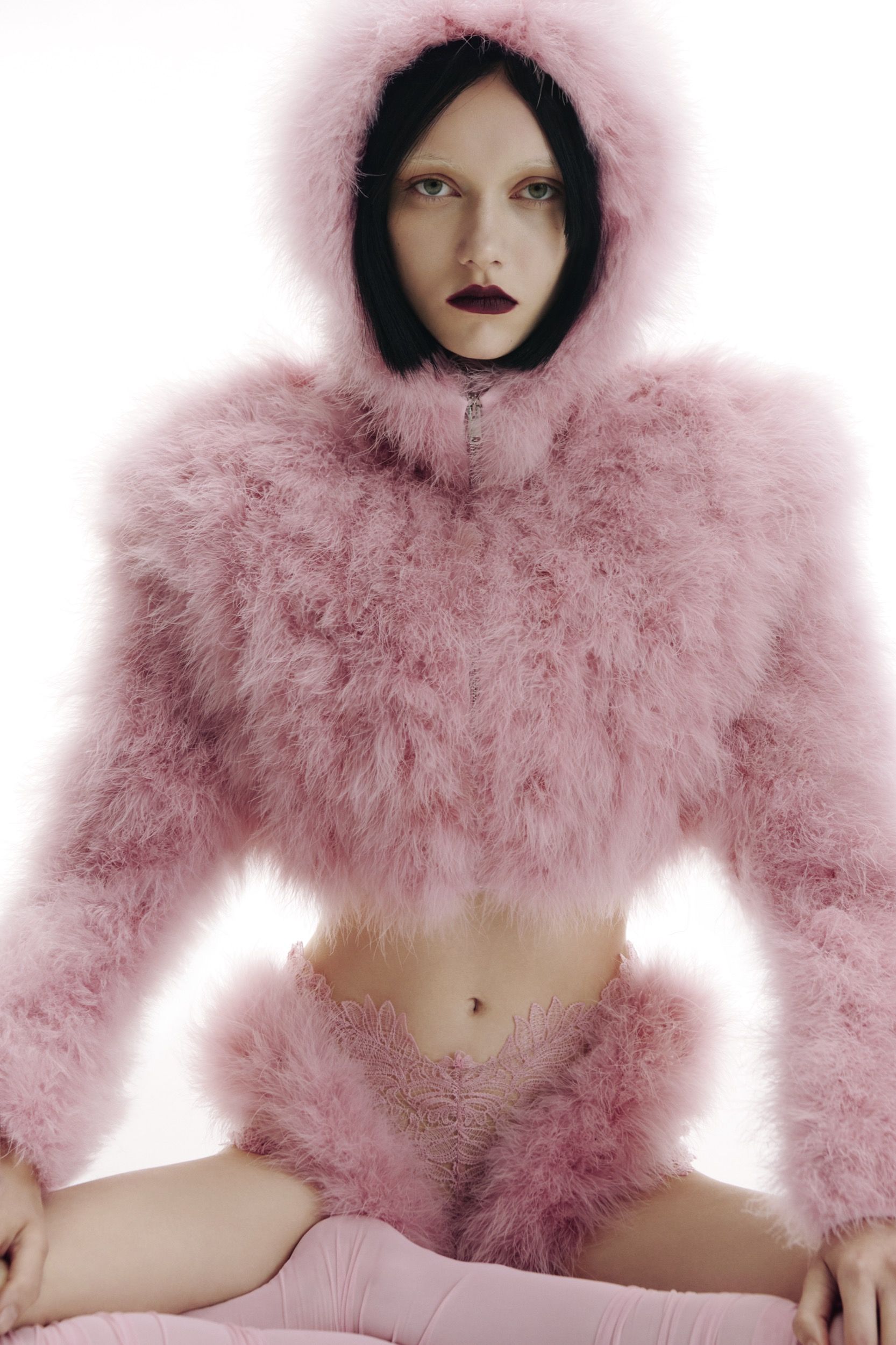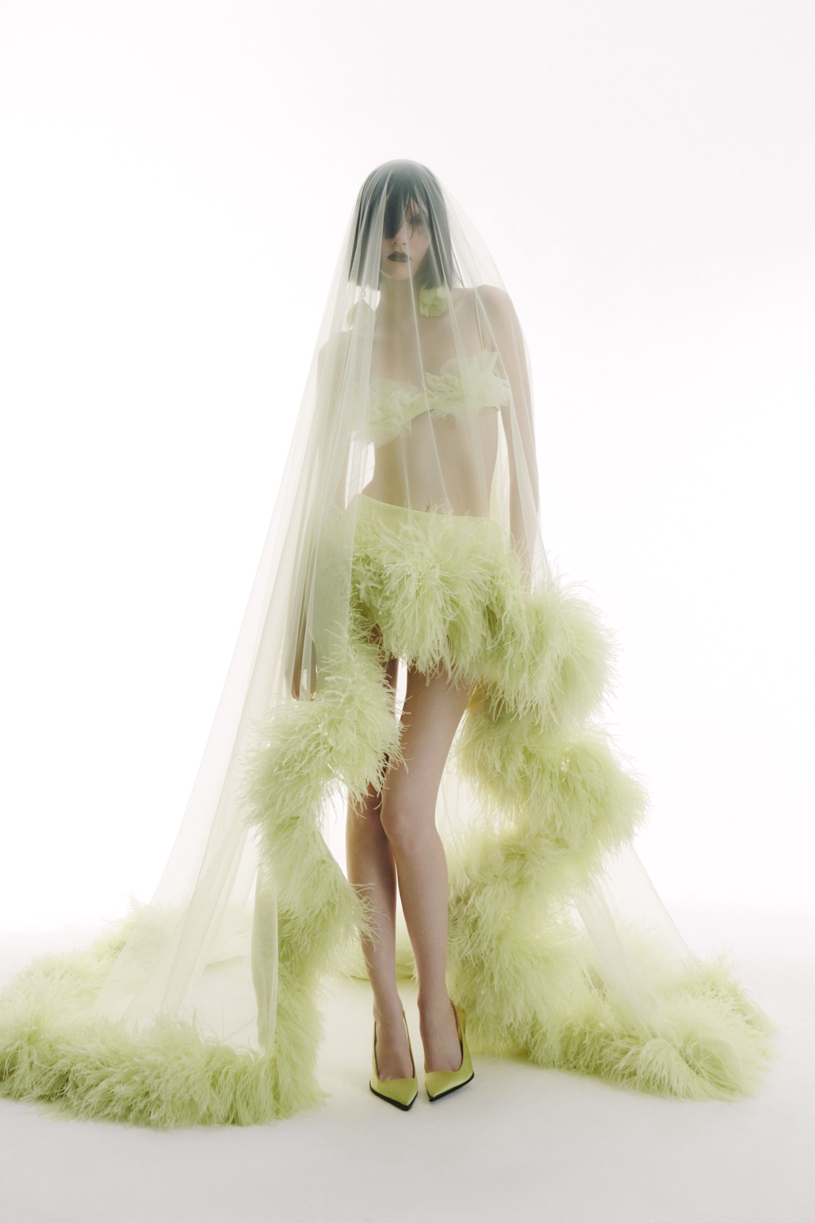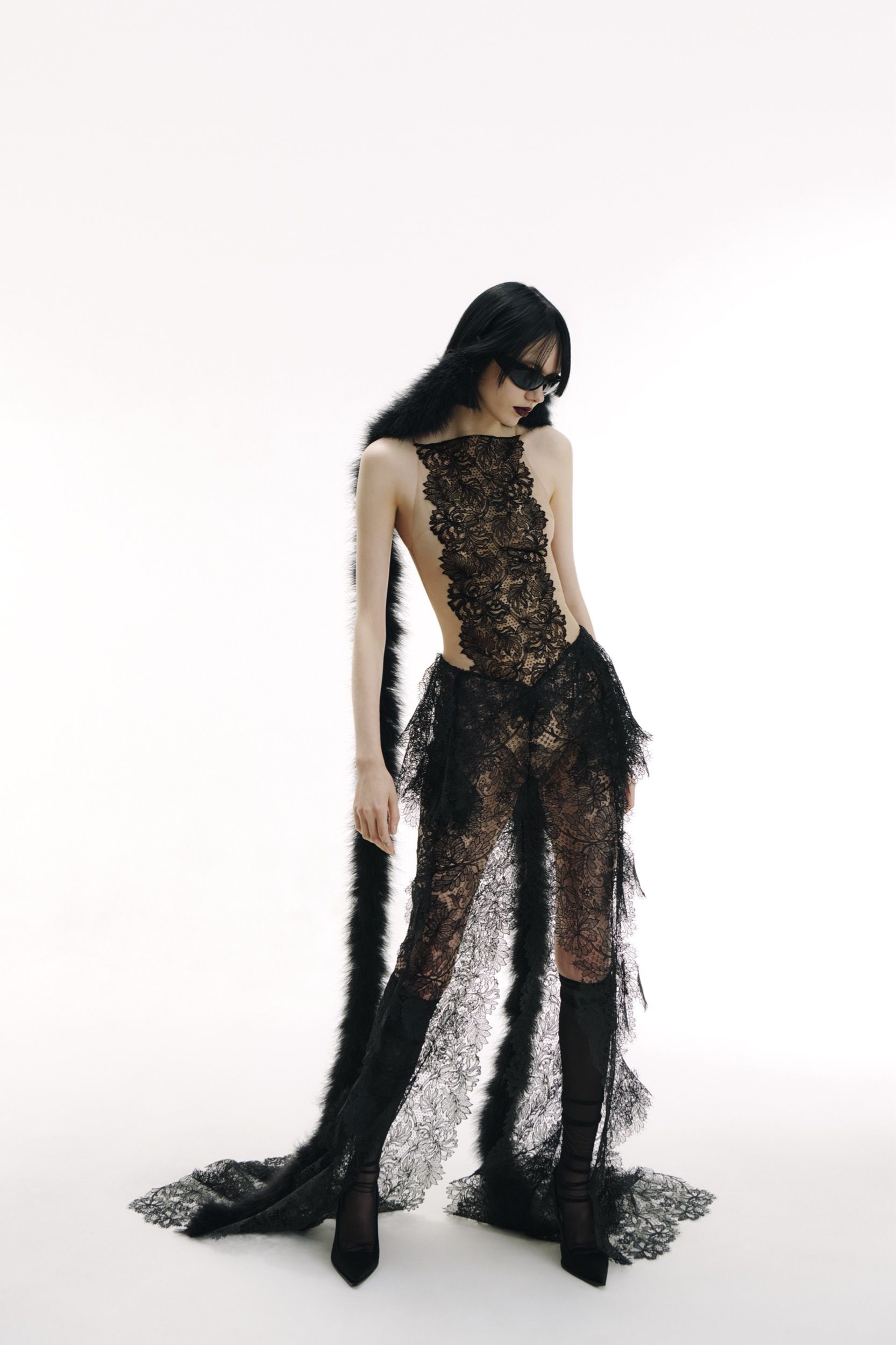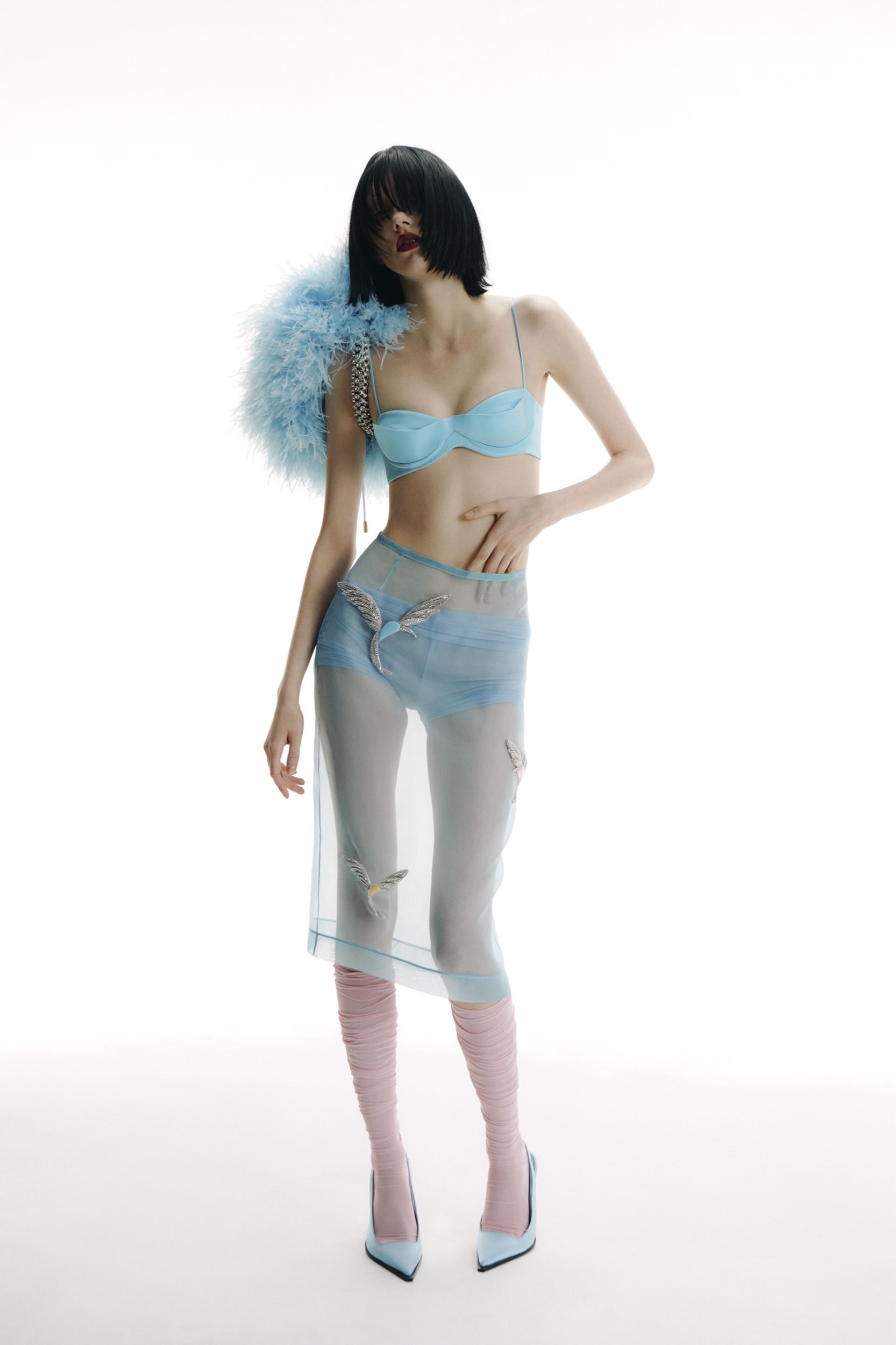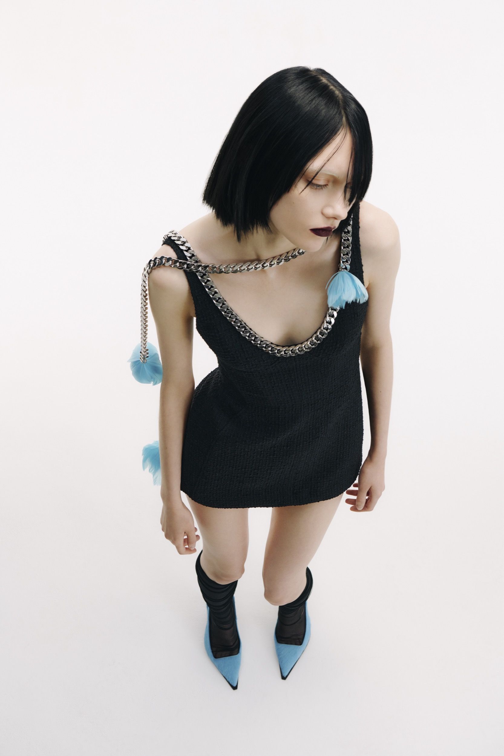 Particularly prominent are the hummingbirds and swallows. The hummingbirds infuse the collection with a sense of joy, inspiring the designs with their boundless energy and graceful, agile flight. Meanwhile, the swallows, renowned for their lasting pair bonds, symbolize love and romance. Both inspire a deeply feminine collection. Alongside the designer's signature graphic black, a palette of sorbet pastels takes center stage. Lace and soft net silk form dramatic yet romantic dresses. Jersey ensembles focus on comfort, while feathered sleeveless sweatshirts add a touch of opulence. Playful softness is further emphasized by the addition of lace veils and tulle ruffle bustiers. «I wanted the collection to be somehow super fragile and sensual, but at the same time strong and naïve. Playing with contrasts, yes, but in the most fragile and sensitive way possible, and then to contrast all this with my comfort zone, with darker colors and more graphic silhouettes. And I think, in the final balance, it really works», Koma comments. Crystallized hummingbirds flutter throughout the collection, perching on the hips and necklines of sheer sequin mini dresses, while hand-embroidered swallows suspend liquid jersey over the décolleté. Bold elements of metal chains are softened with flowers made from single feather petals, appearing as trims and earrings. Knitwear emerges in the form of sparkling crystal-encrusted dresses and twin sets, embroidered with elongated glass sequins and metal straws.