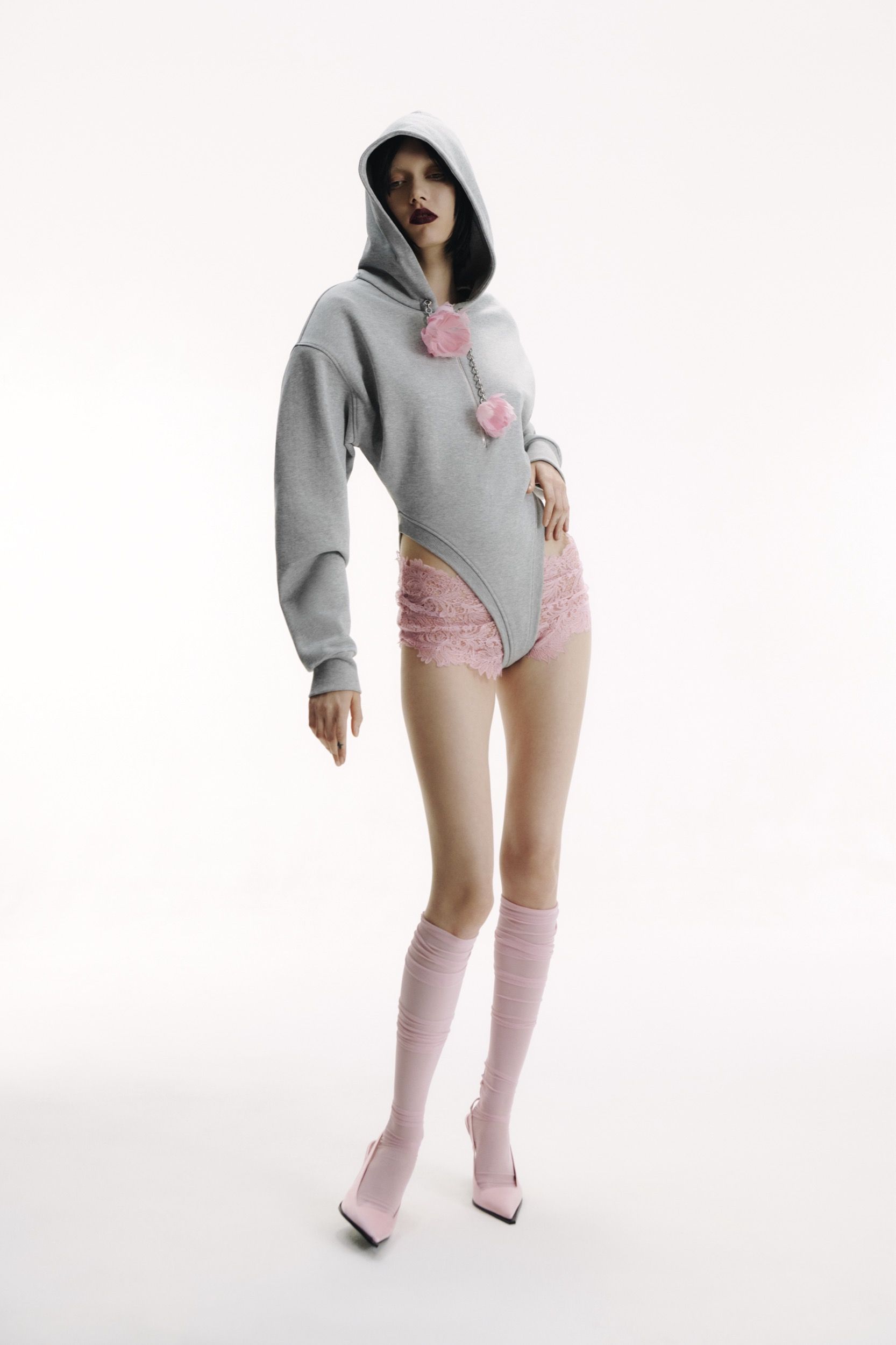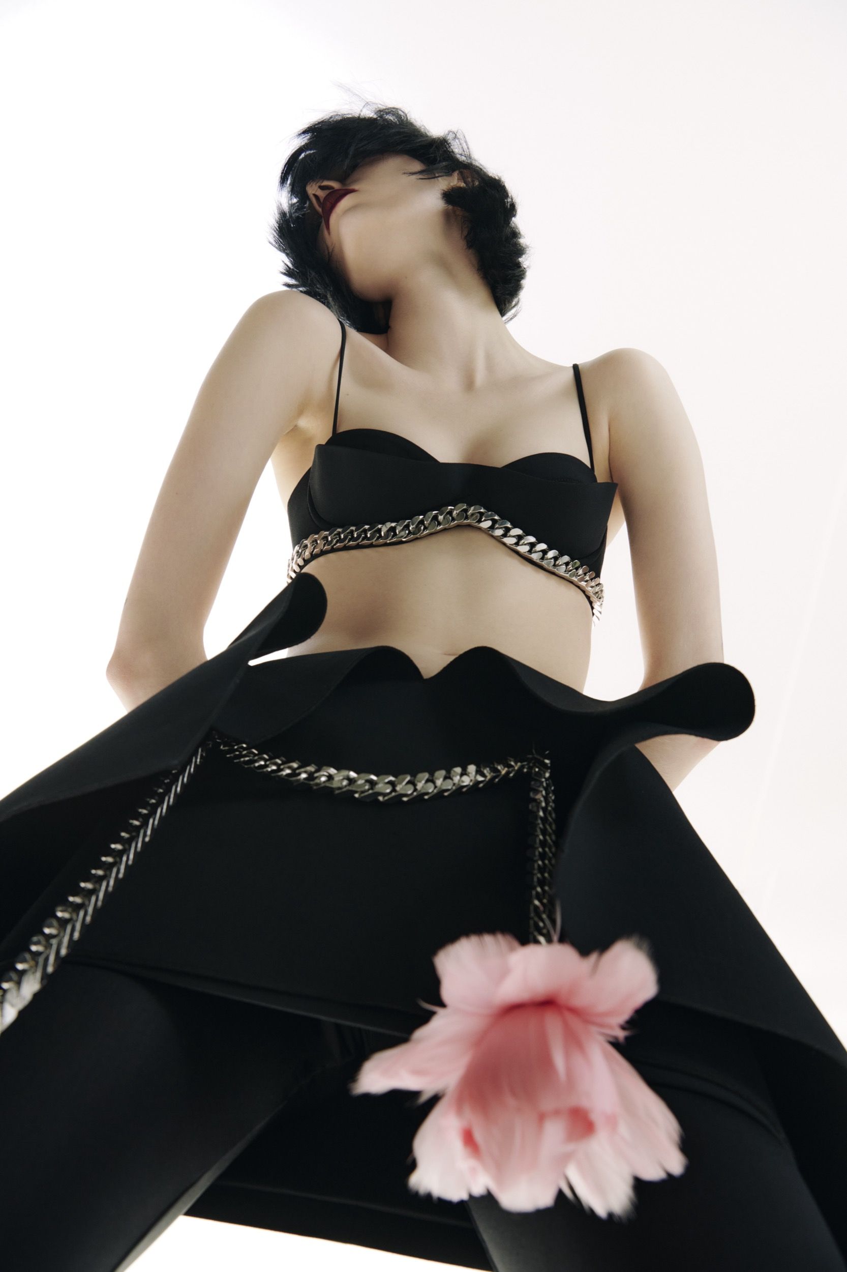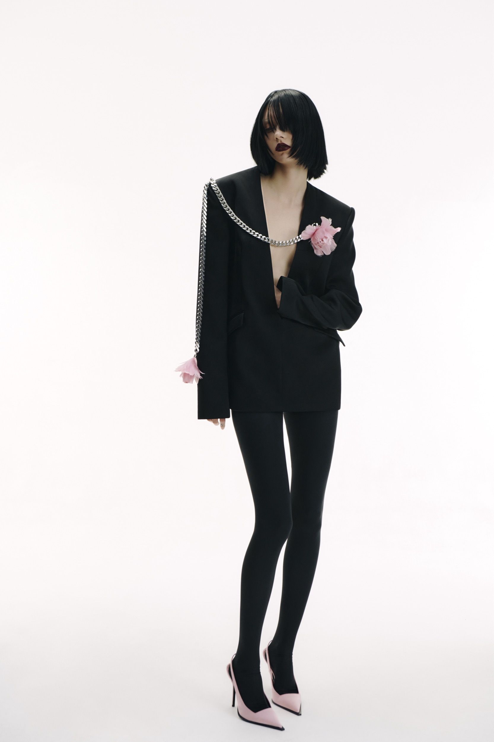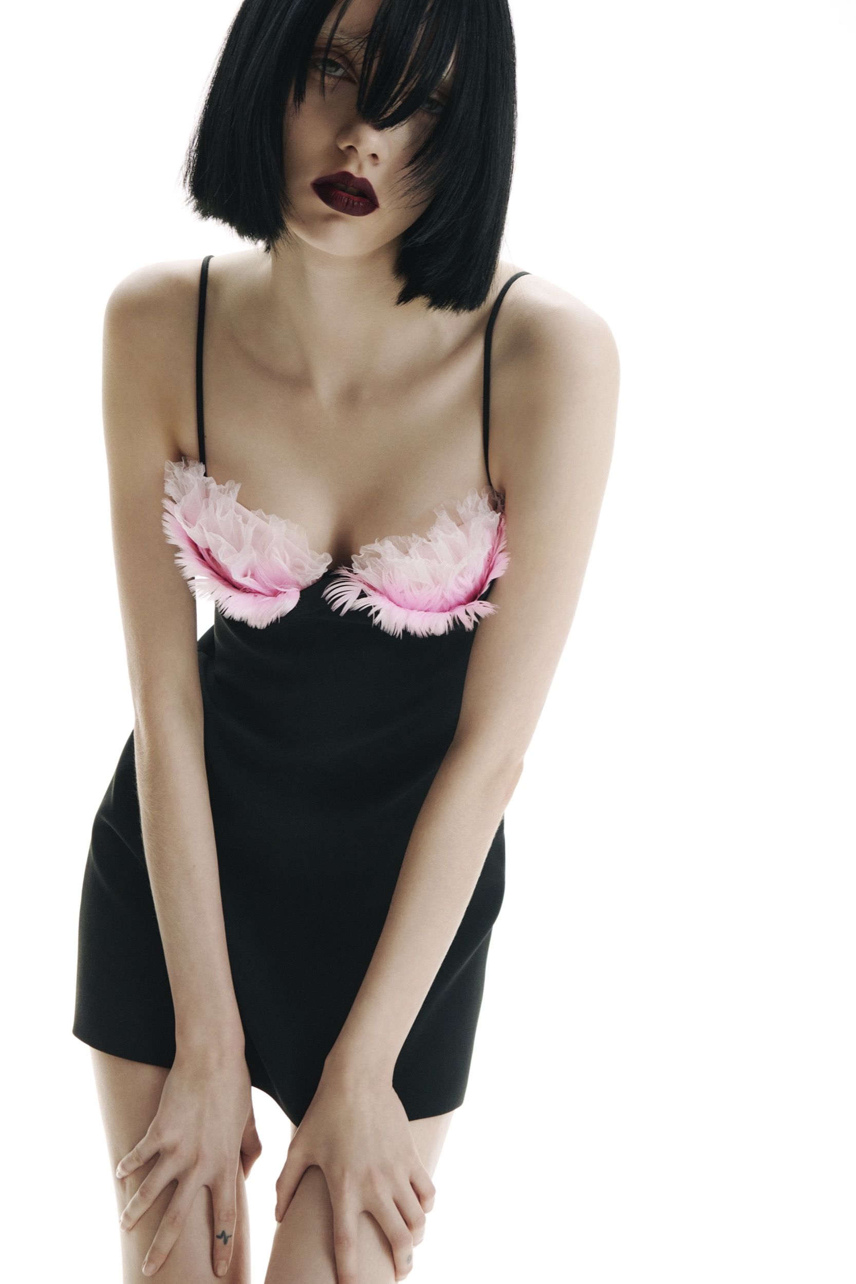 Particularly prominent are the hummingbirds and swallows. The hummingbirds infuse the collection with a sense of joy, inspiring the designs with their boundless energy and graceful, agile flight. Meanwhile, the swallows, renowned for their lasting pair bonds, symbolize love and romance. Both inspire a deeply feminine collection. Alongside the designer's signature graphic black, a palette of sorbet pastels takes center stage. Lace and soft net silk form dramatic yet romantic dresses. Jersey ensembles focus on comfort, while feathered sleeveless sweatshirts add a touch of opulence. Playful softness is further emphasized by the addition of lace veils and tulle ruffle bustiers. «I wanted the collection to be somehow super fragile and sensual, but at the same time strong and naïve. Playing with contrasts, yes, but in the most fragile and sensitive way possible, and then to contrast all this with my comfort zone, with darker colors and more graphic silhouettes. And I think, in the final balance, it really works», Koma comments. Crystallized hummingbirds flutter throughout the collection, perching on the hips and necklines of sheer sequin mini dresses, while hand-embroidered swallows suspend liquid jersey over the décolleté. Bold elements of metal chains are softened with flowers made from single feather petals, appearing as trims and earrings. Knitwear emerges in the form of sparkling crystal-encrusted dresses and twin sets, embroidered with elongated glass sequins and metal straws.