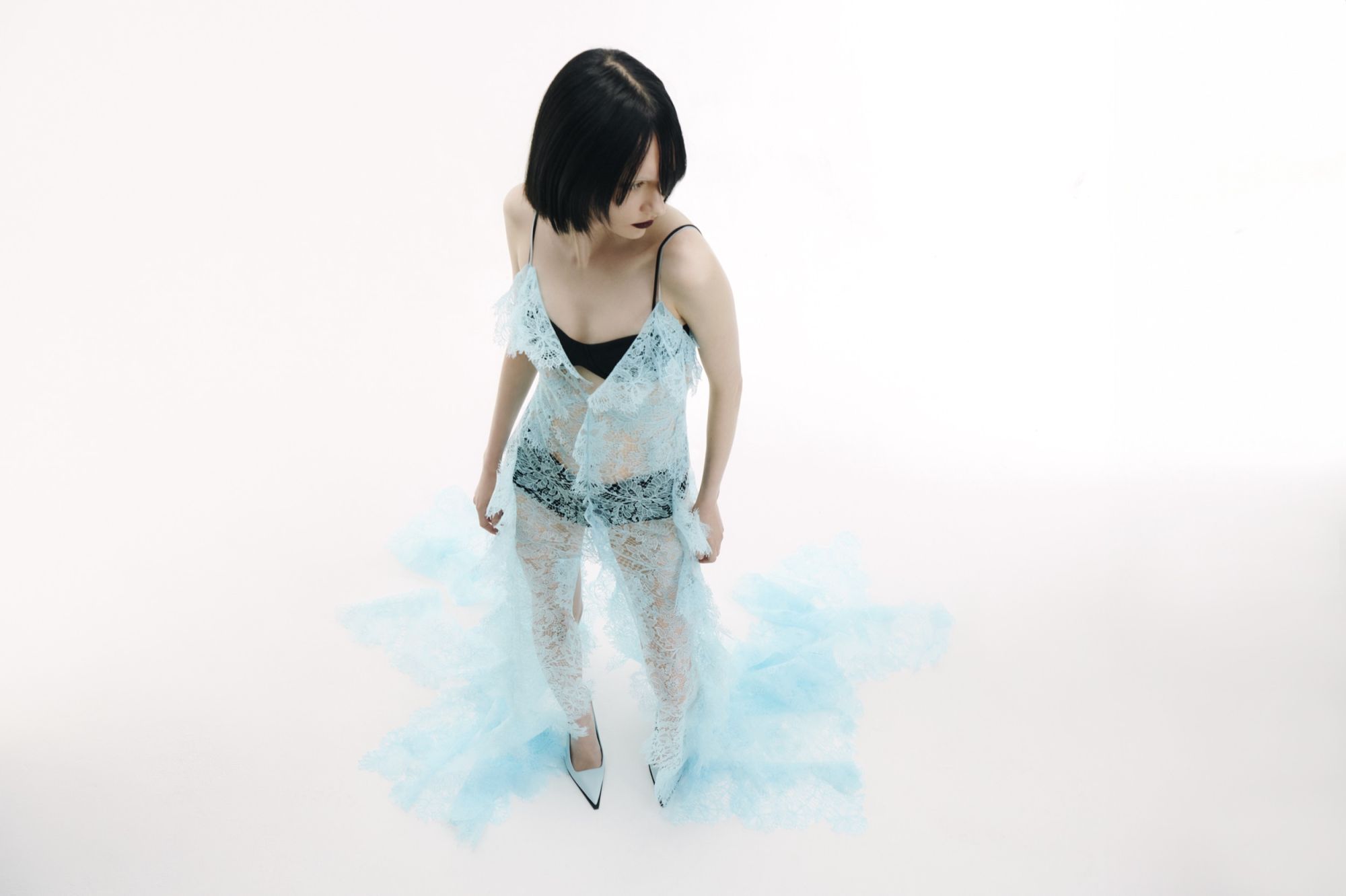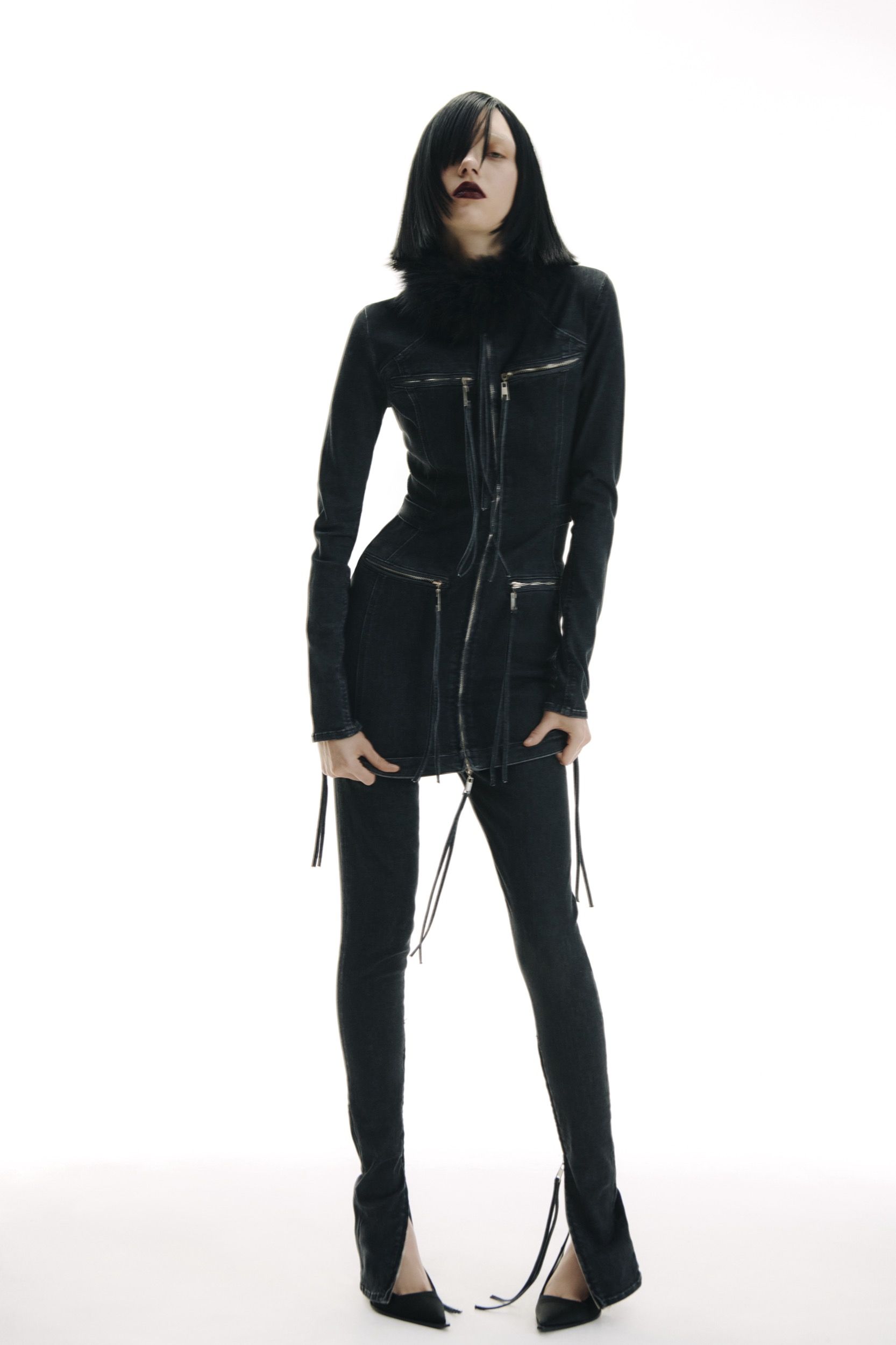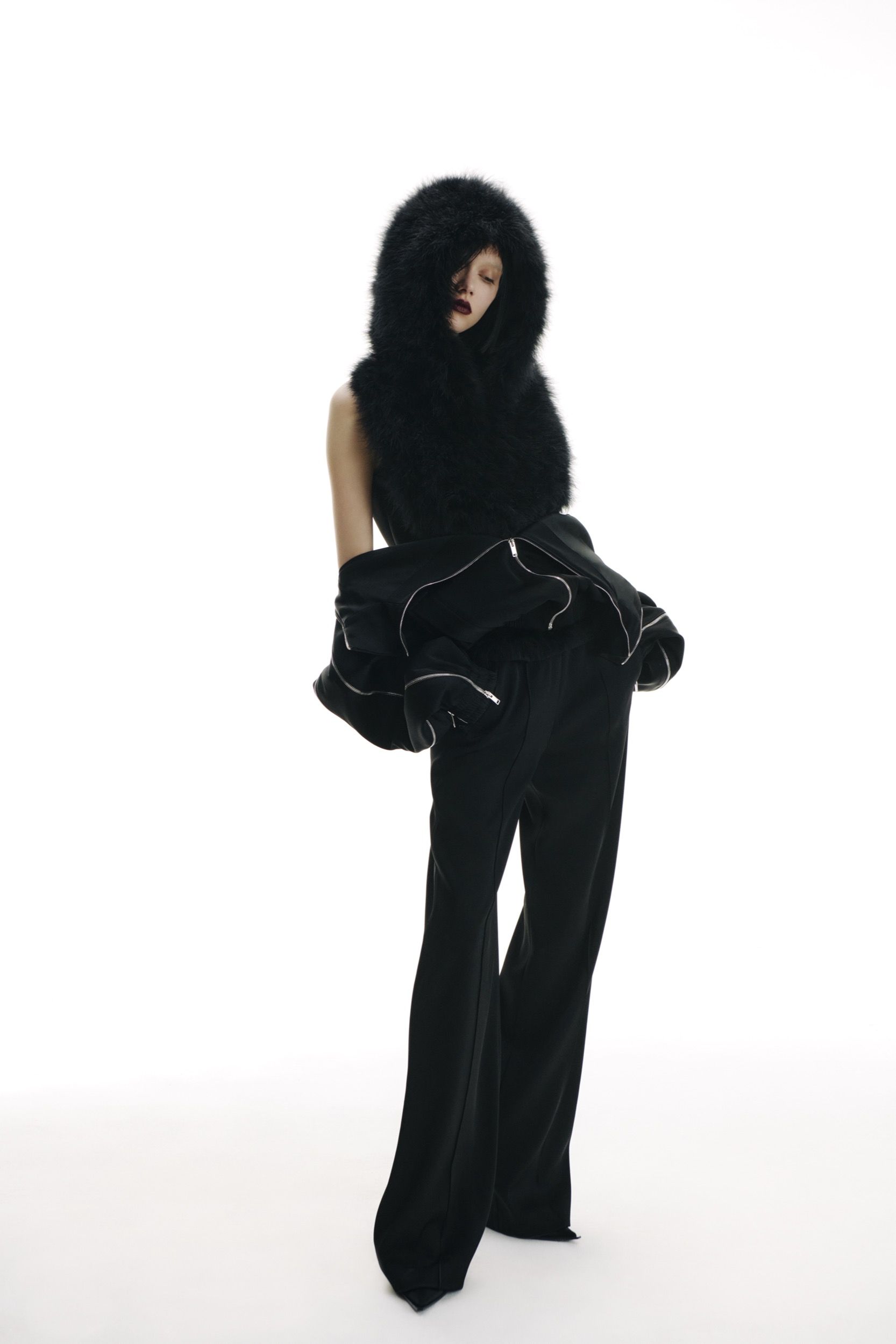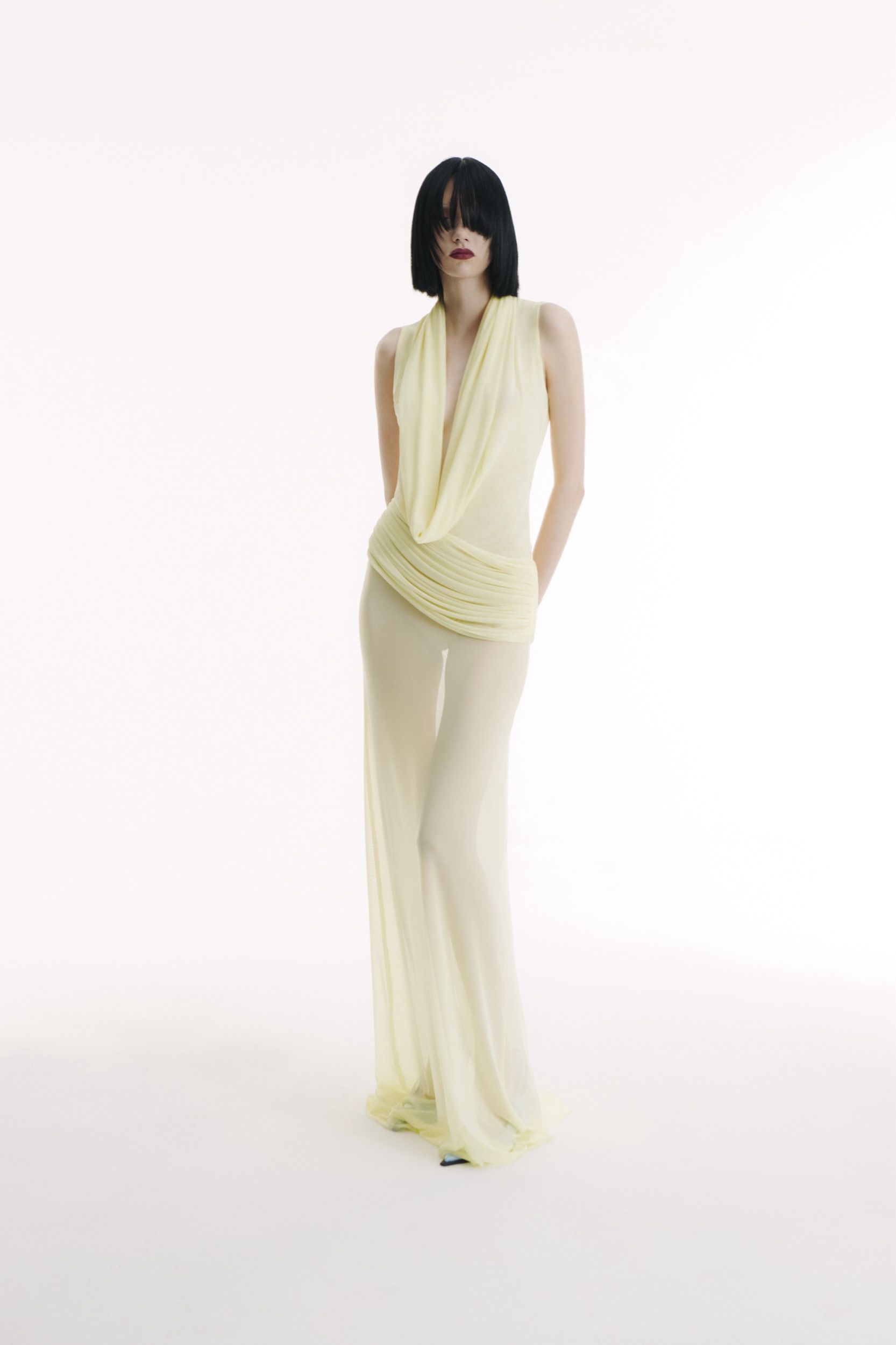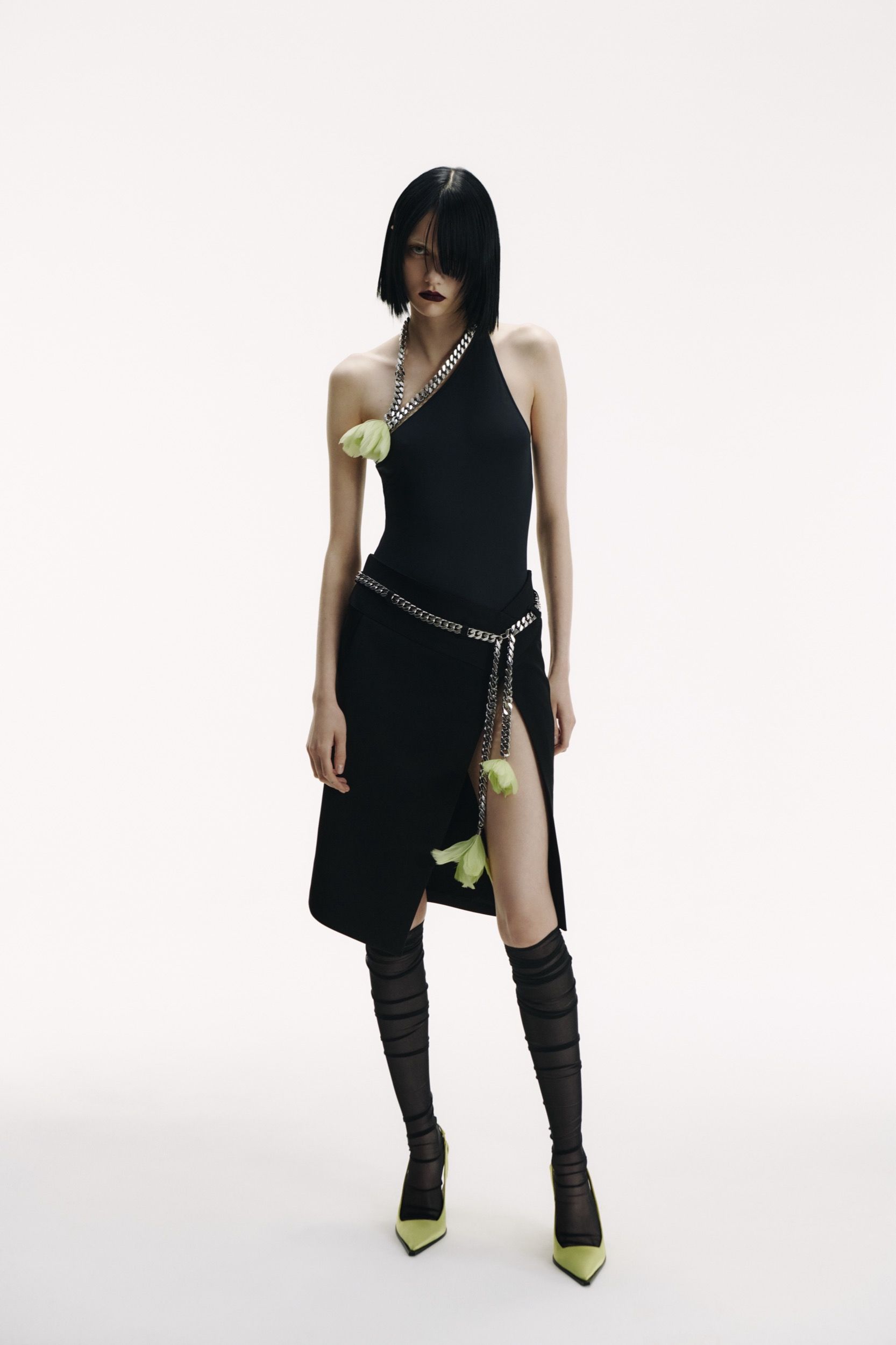 Particularly prominent are the hummingbirds and swallows. The hummingbirds infuse the collection with a sense of joy, inspiring the designs with their boundless energy and graceful, agile flight. Meanwhile, the swallows, renowned for their lasting pair bonds, symbolize love and romance. Both inspire a deeply feminine collection. Alongside the designer's signature graphic black, a palette of sorbet pastels takes center stage. Lace and soft net silk form dramatic yet romantic dresses. Jersey ensembles focus on comfort, while feathered sleeveless sweatshirts add a touch of opulence. Playful softness is further emphasized by the addition of lace veils and tulle ruffle bustiers. «I wanted the collection to be somehow super fragile and sensual, but at the same time strong and naïve. Playing with contrasts, yes, but in the most fragile and sensitive way possible, and then to contrast all this with my comfort zone, with darker colors and more graphic silhouettes. And I think, in the final balance, it really works», Koma comments. Crystallized hummingbirds flutter throughout the collection, perching on the hips and necklines of sheer sequin mini dresses, while hand-embroidered swallows suspend liquid jersey over the décolleté. Bold elements of metal chains are softened with flowers made from single feather petals, appearing as trims and earrings. Knitwear emerges in the form of sparkling crystal-encrusted dresses and twin sets, embroidered with elongated glass sequins and metal straws.