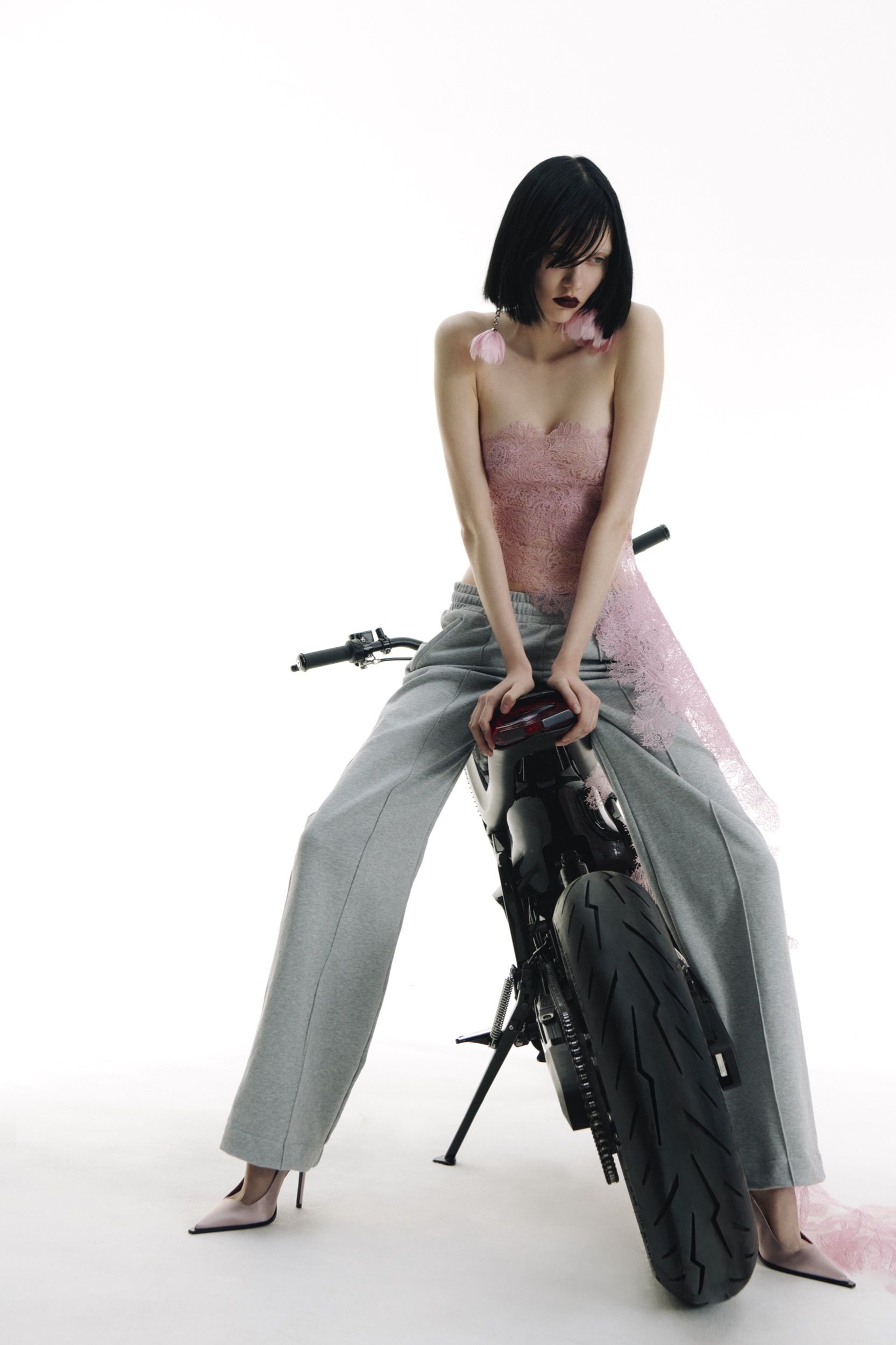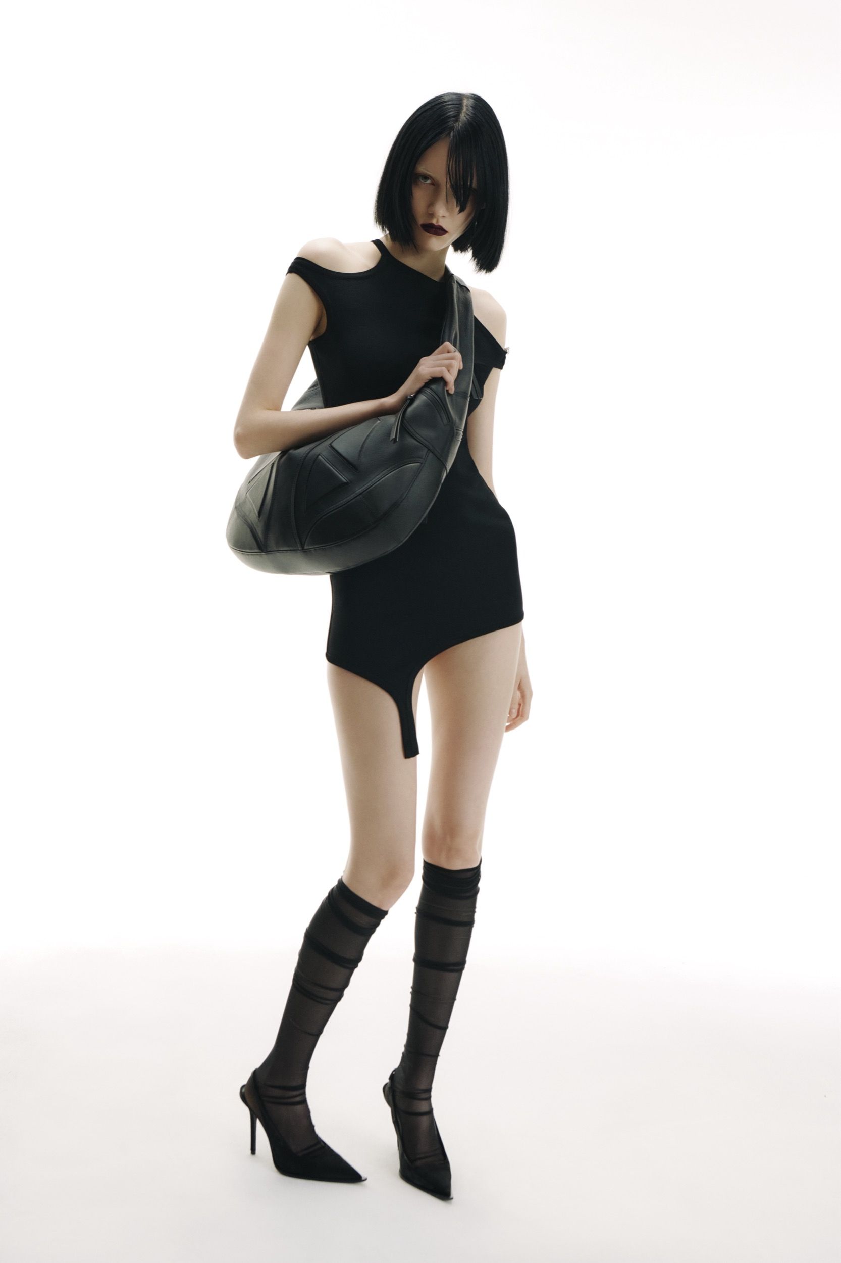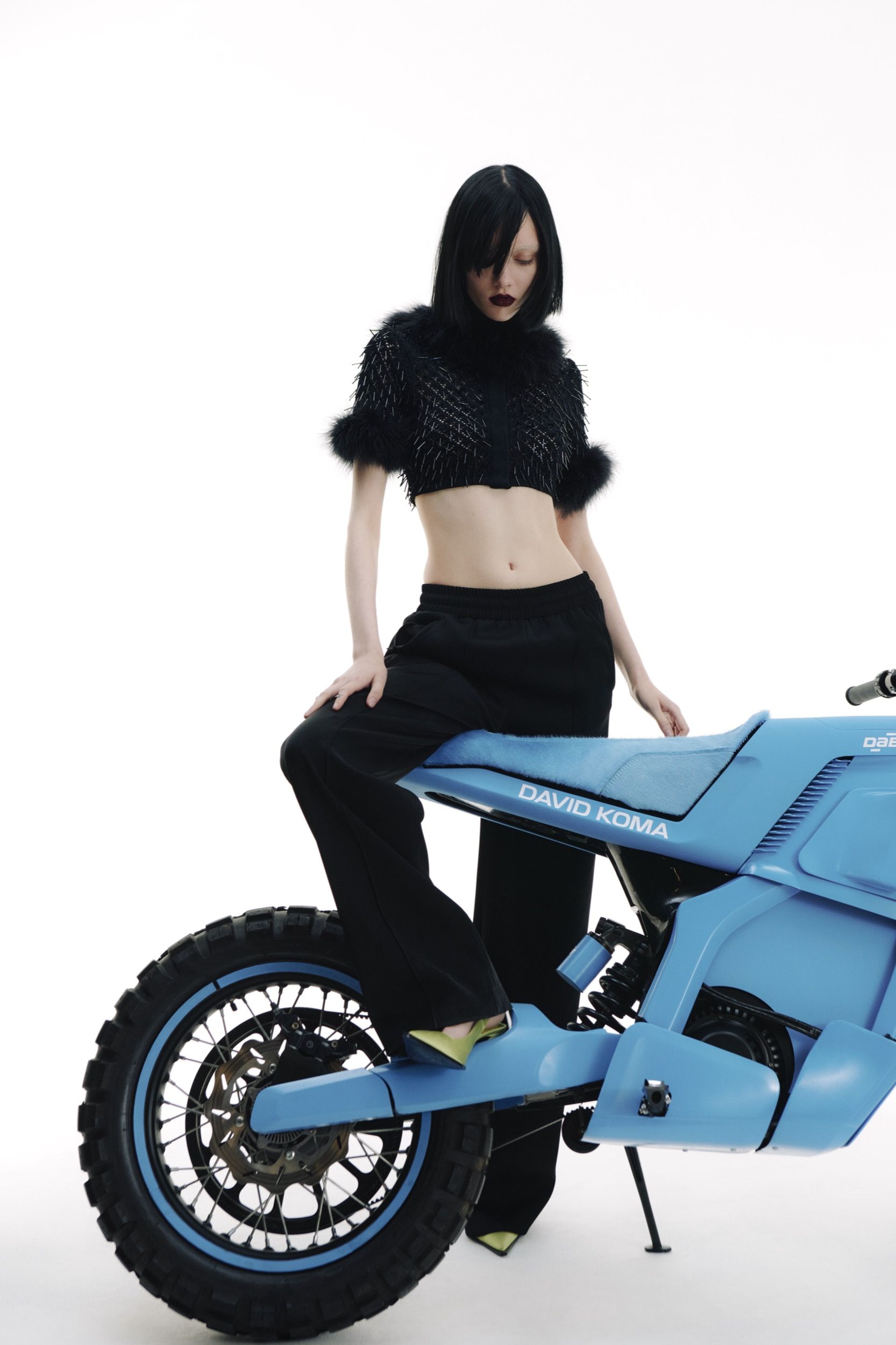 In homage to the season’s natural theme, David Koma introduces a special collaboration with electric motorcycle brand DAB Motors, focused on sustainable transportation, featuring three exclusive color variants of the motorcycle. Inspired by the brand's iconic padded biker jacket, David Koma also launched a new bag model, The Racer made of matte calfskin or textured pony leather, available in three sizes. A collaboration Koma describes as "spontaneous" because «at the same time we were launching the Racer bags, inspired by my love for motocross, and then with the birds and speed and all this concept, I thought: ‘Oh, it would be interesting to collaborate with them because, you know, I really love this sport.’ And then, because they were beautiful bikes, but they were e-bikes, I thought conceptually it made a lot of sense, and I did it. And then, either unconsciously or consciously, I feel like I made the right choice.»