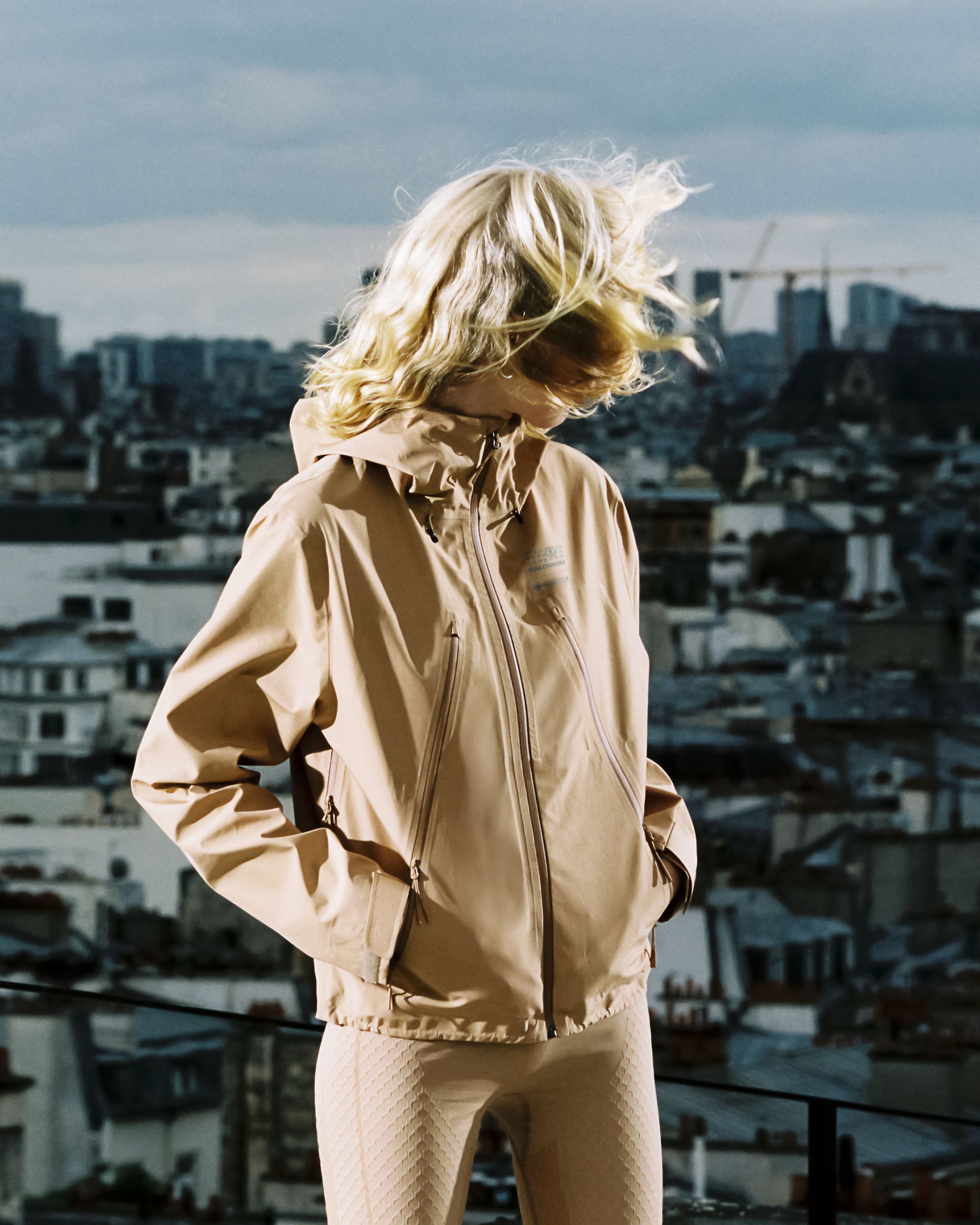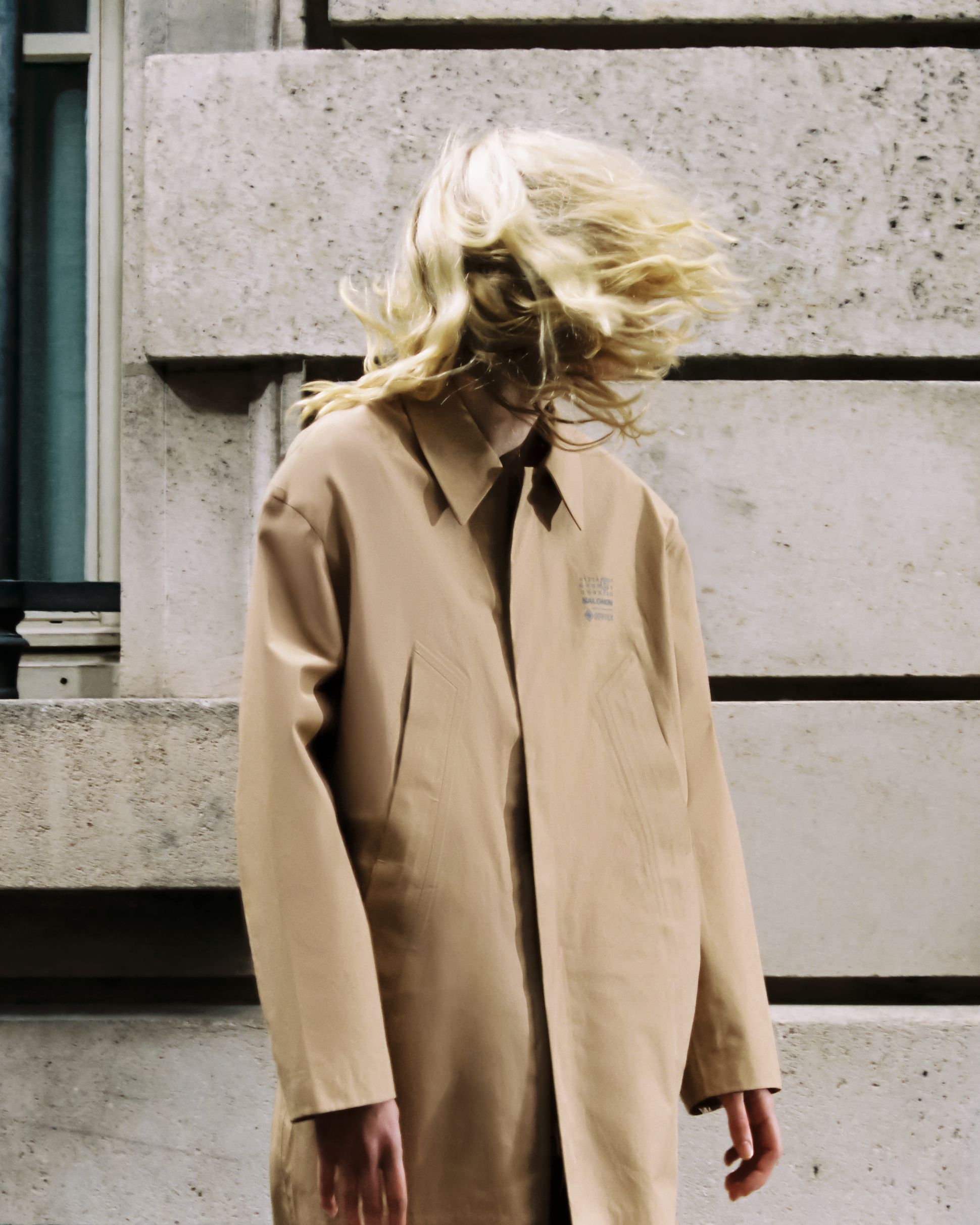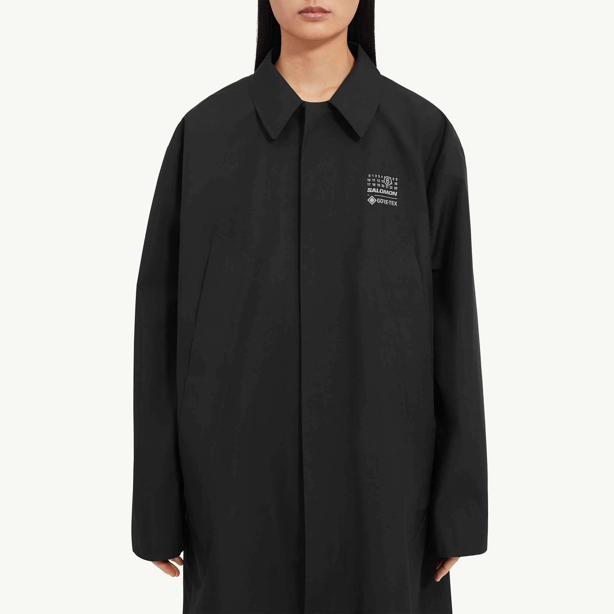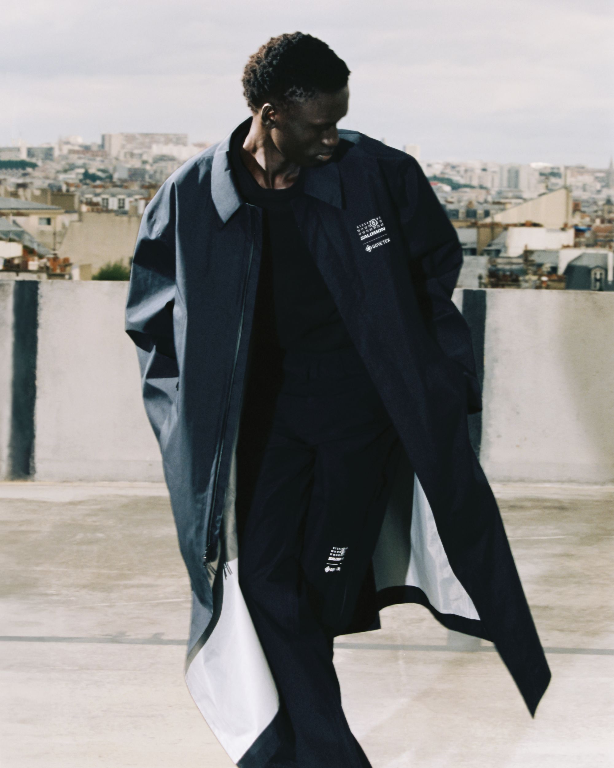 It embodies the signature style of MM6 Maison Margiela paired with Salomon’s cutting-edge activewear technology and innovative manufacturing processes. Rendered in the Maison’s iconic nude shade, this acts as a backdrop for black and white accents on oversized formal pants and shirts in the collection. The volumes range from fitted and anatomical—with seamless, stretch-technology leggings and long-sleeve crew neck tops—to simple and expansive, featuring basic trench coats, five-pocket straight-leg pants, zip-up windbreakers, and oversized button-up shirts, all crafted in breathable, waterproof Gore-Tex fabric.