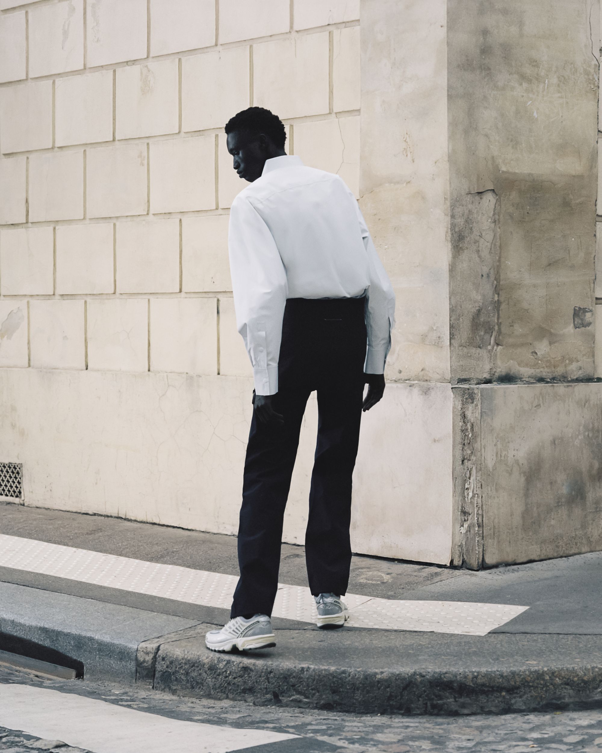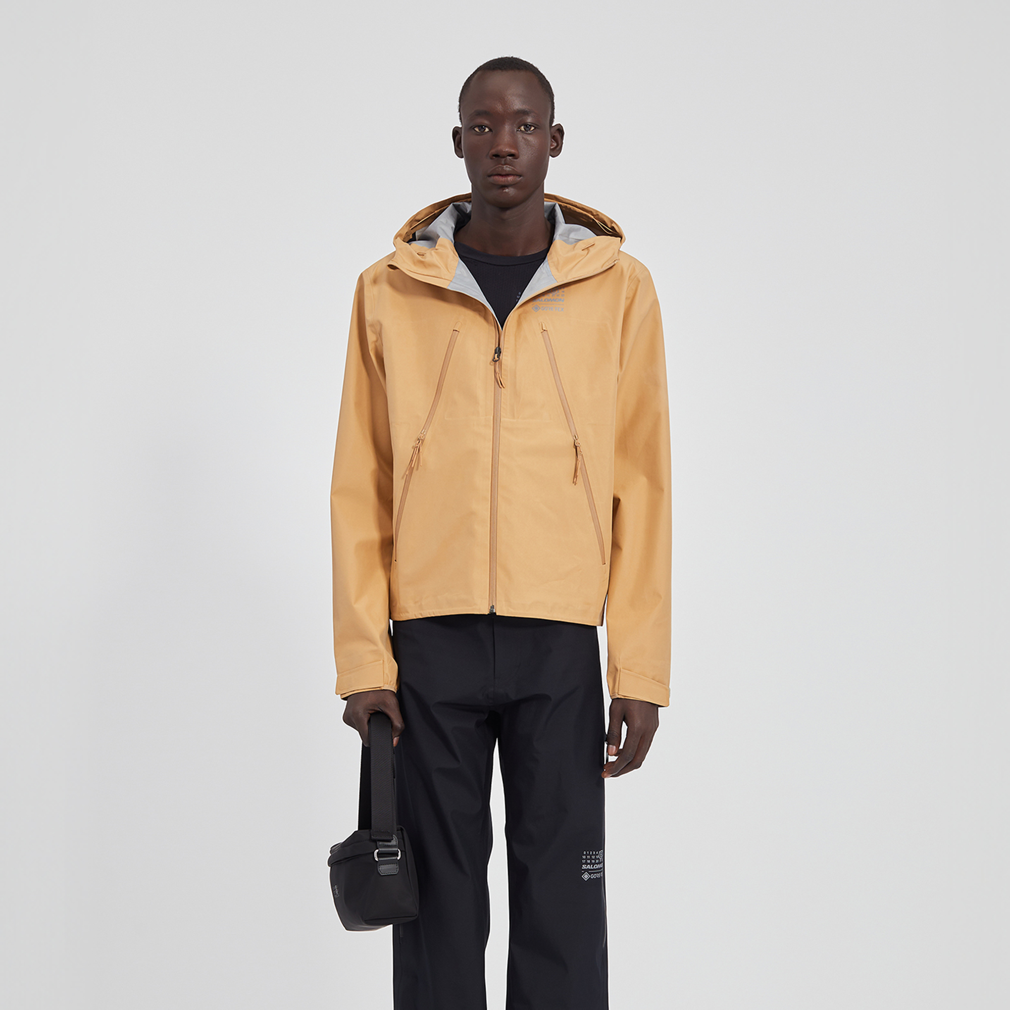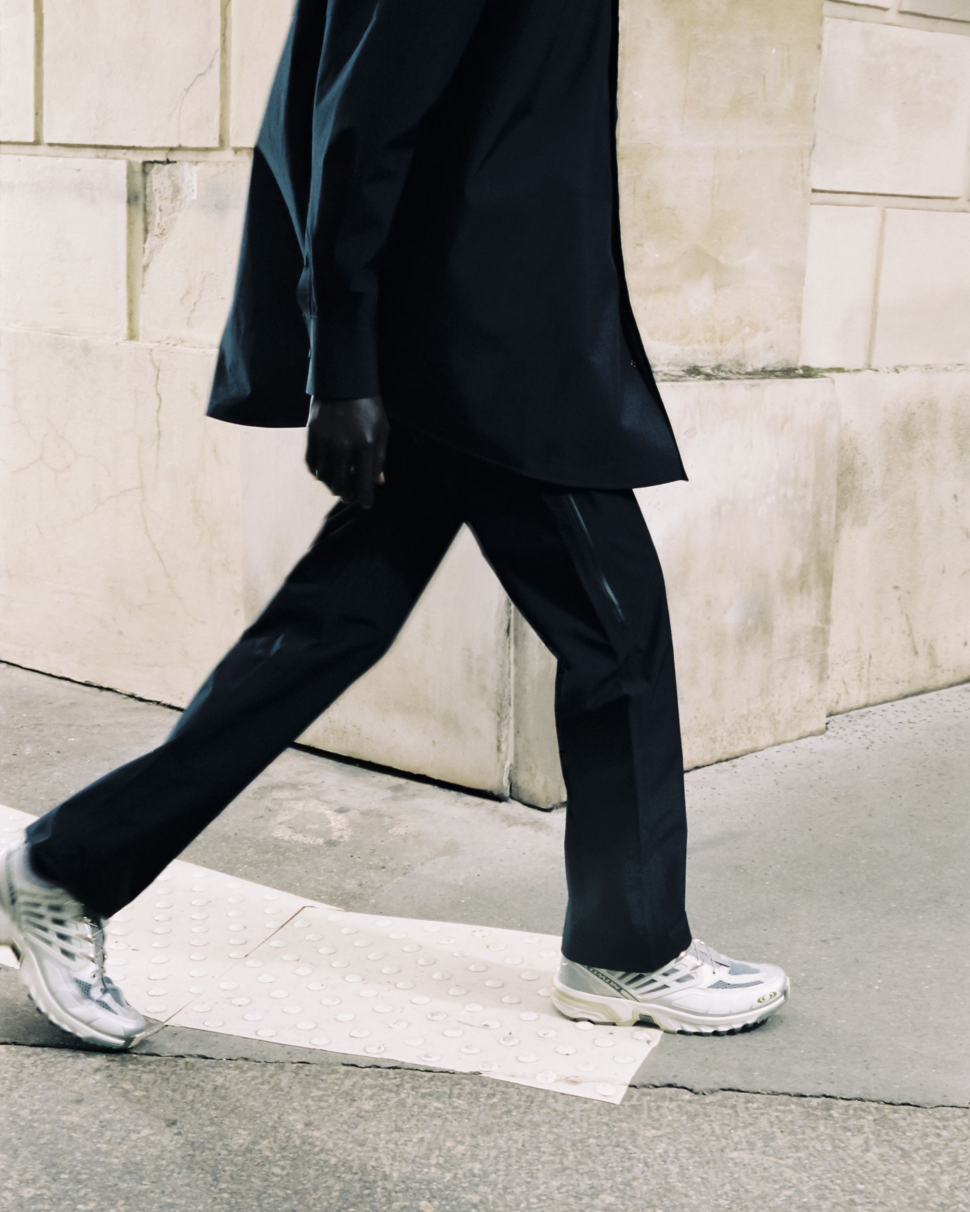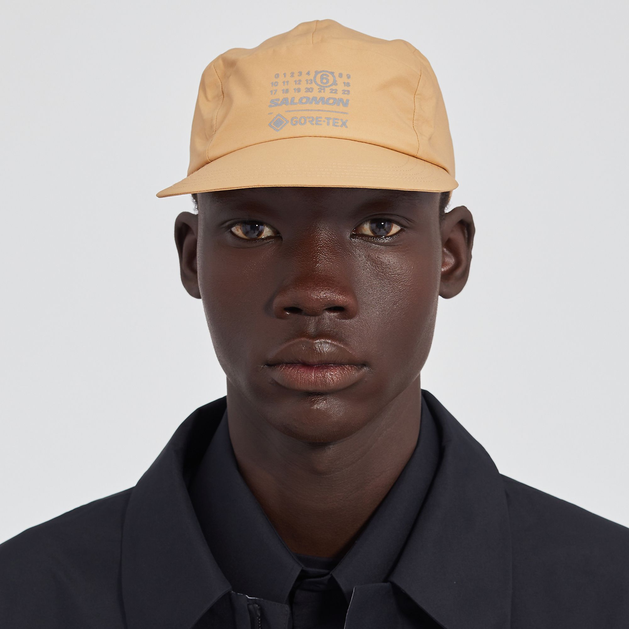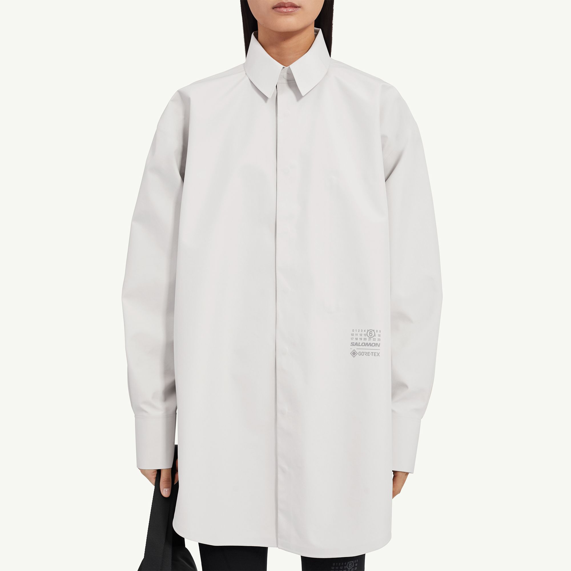 It embodies the signature style of MM6 Maison Margiela paired with Salomon’s cutting-edge activewear technology and innovative manufacturing processes. Rendered in the Maison’s iconic nude shade, this acts as a backdrop for black and white accents on oversized formal pants and shirts in the collection. The volumes range from fitted and anatomical—with seamless, stretch-technology leggings and long-sleeve crew neck tops—to simple and expansive, featuring basic trench coats, five-pocket straight-leg pants, zip-up windbreakers, and oversized button-up shirts, all crafted in breathable, waterproof Gore-Tex fabric.