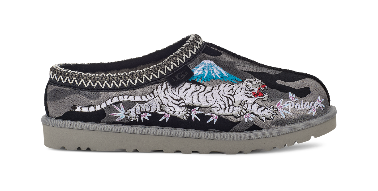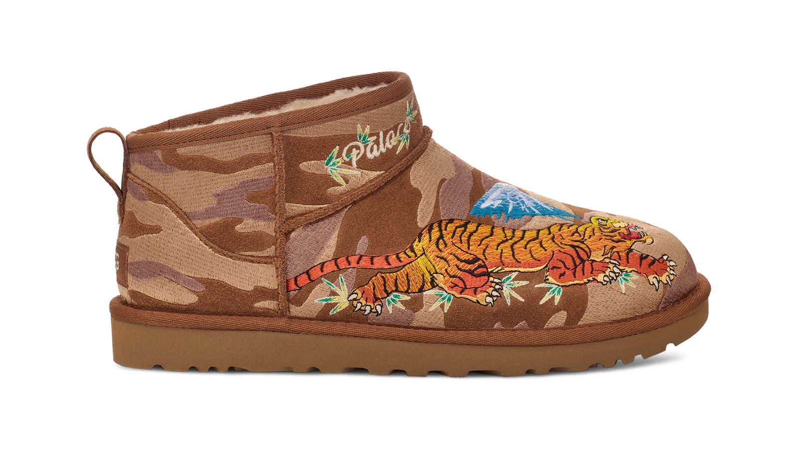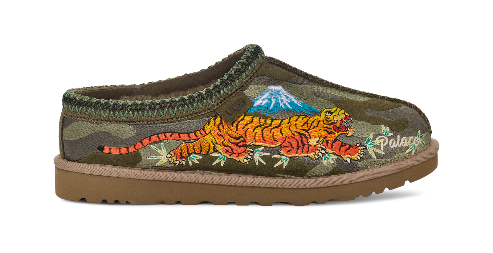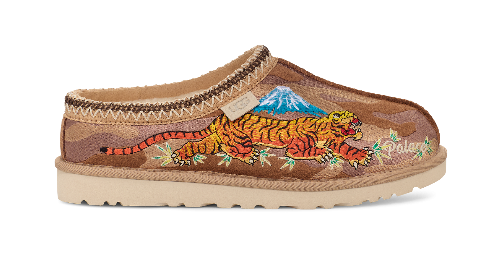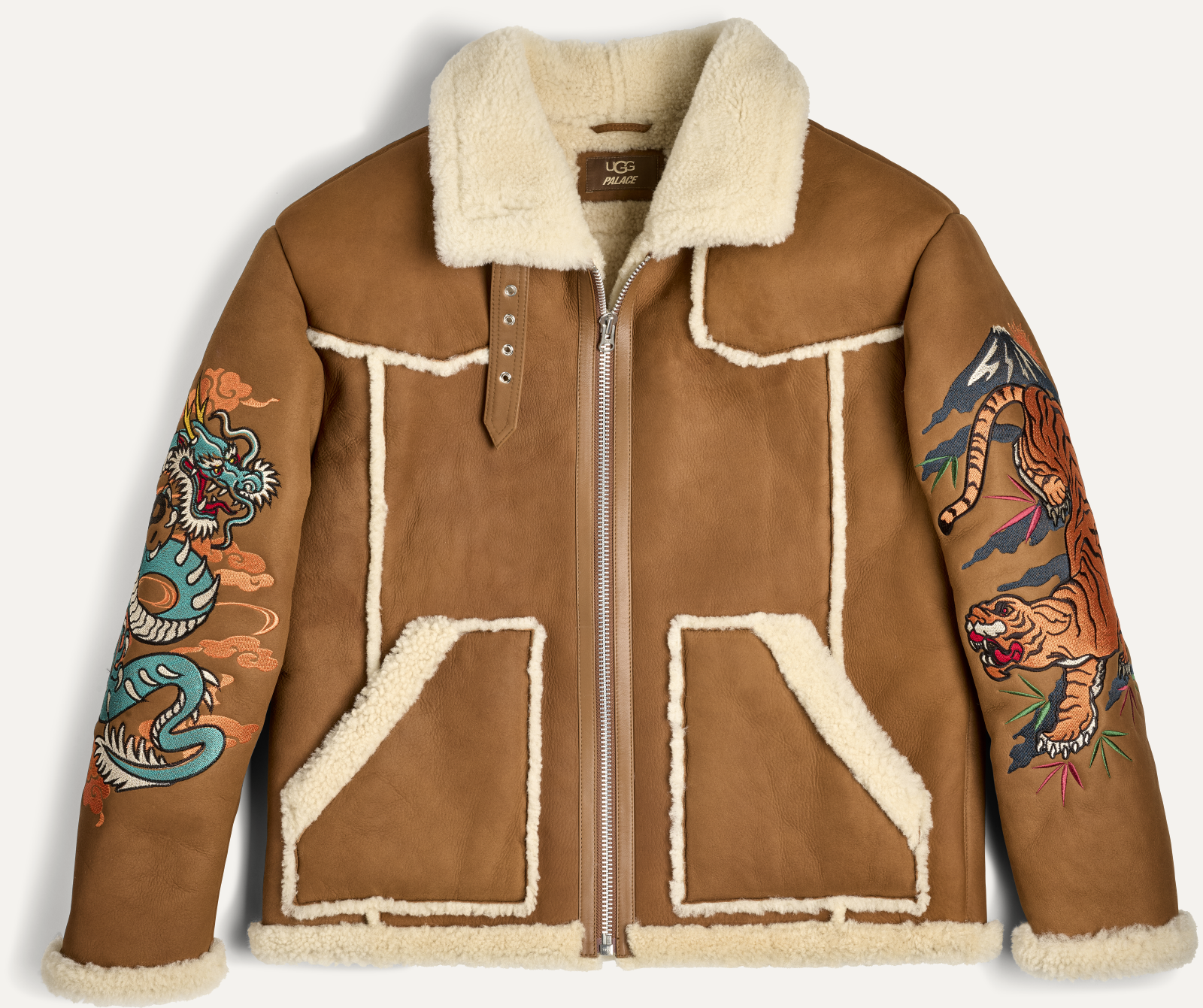 Available from December 6, the collection reinterprets some of UGG's iconic models, including the Tasman mule and, for the first time, the Classic Ultra Mini. These pieces are transformed with intricate multi-layered embroidery, bringing cultural concepts to life in a wearable and innovative way. The collection also includes a brand-new piece, the UGG Palace Jacket, made of soft suede with shearling lining. The jacket stands out for its embroidered sleeve details, exposed shearling edges, and Palace’s intertwined “P” logo on the back, making it a highlight of the line. Completing the collection are the bucket hat and tote bag, practical and refined accessories that express the unmistakable style of this collaboration.
