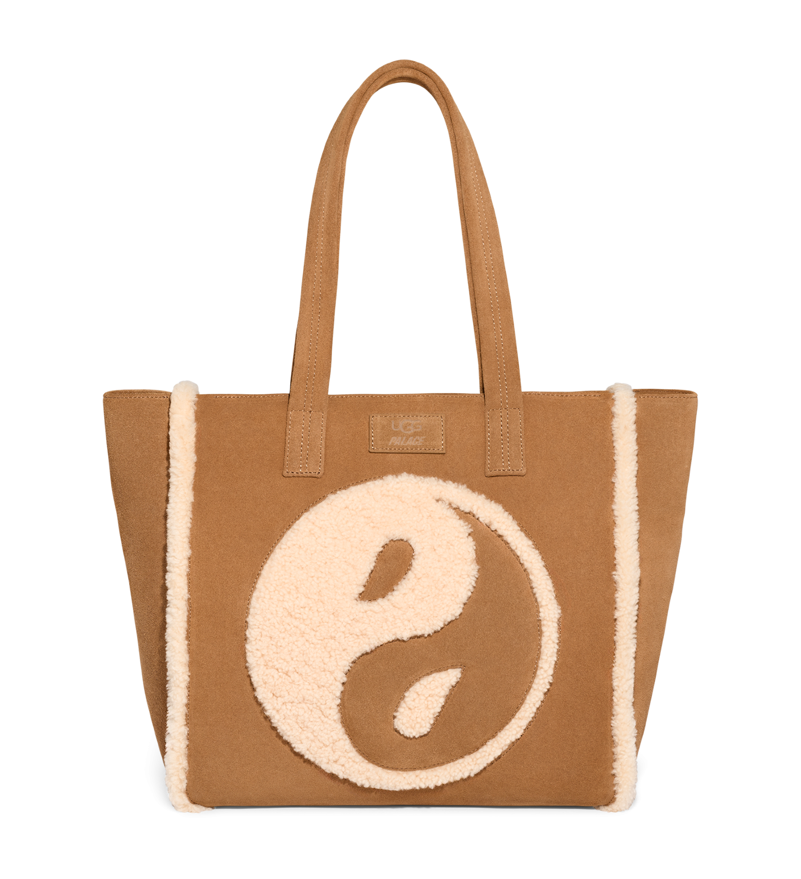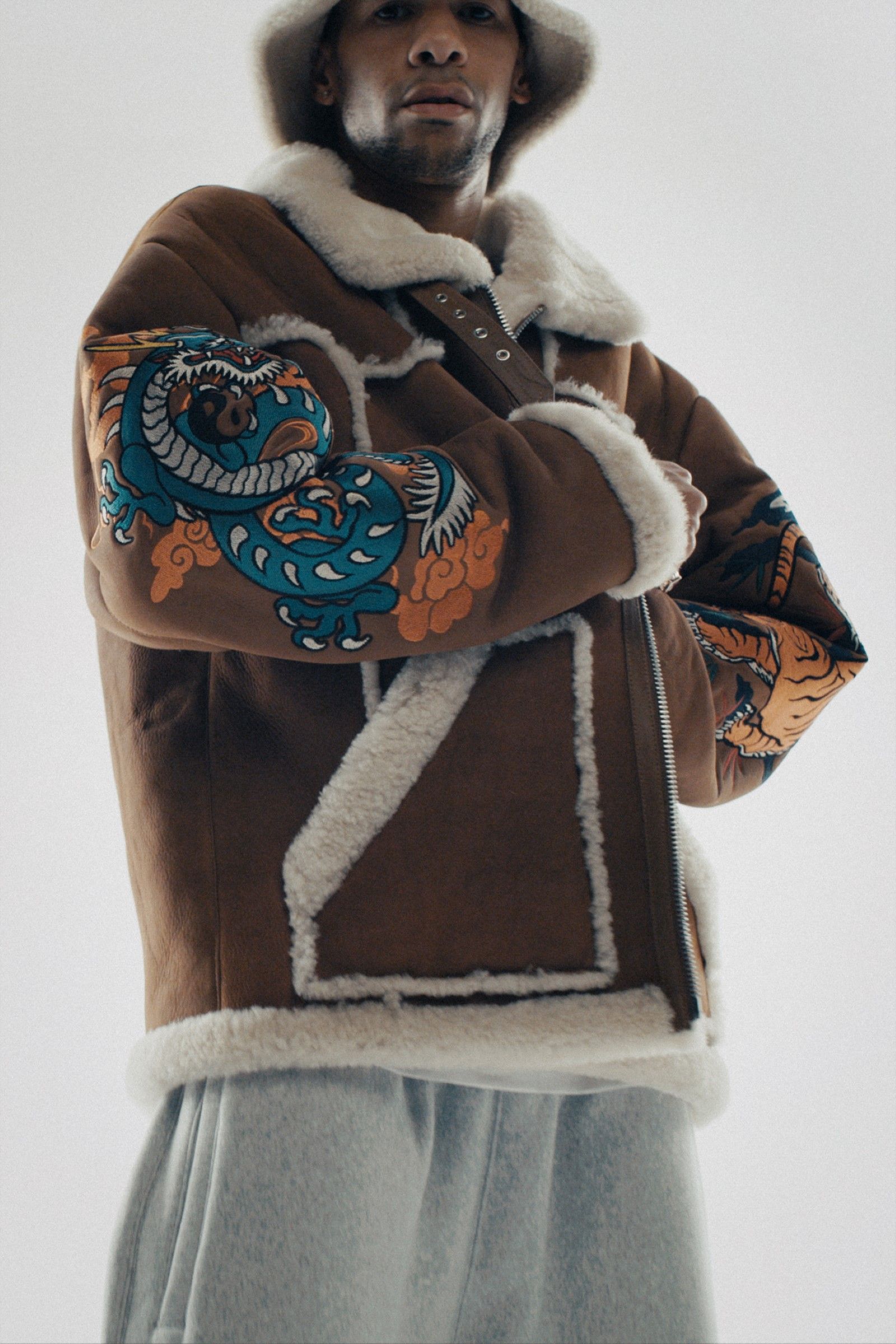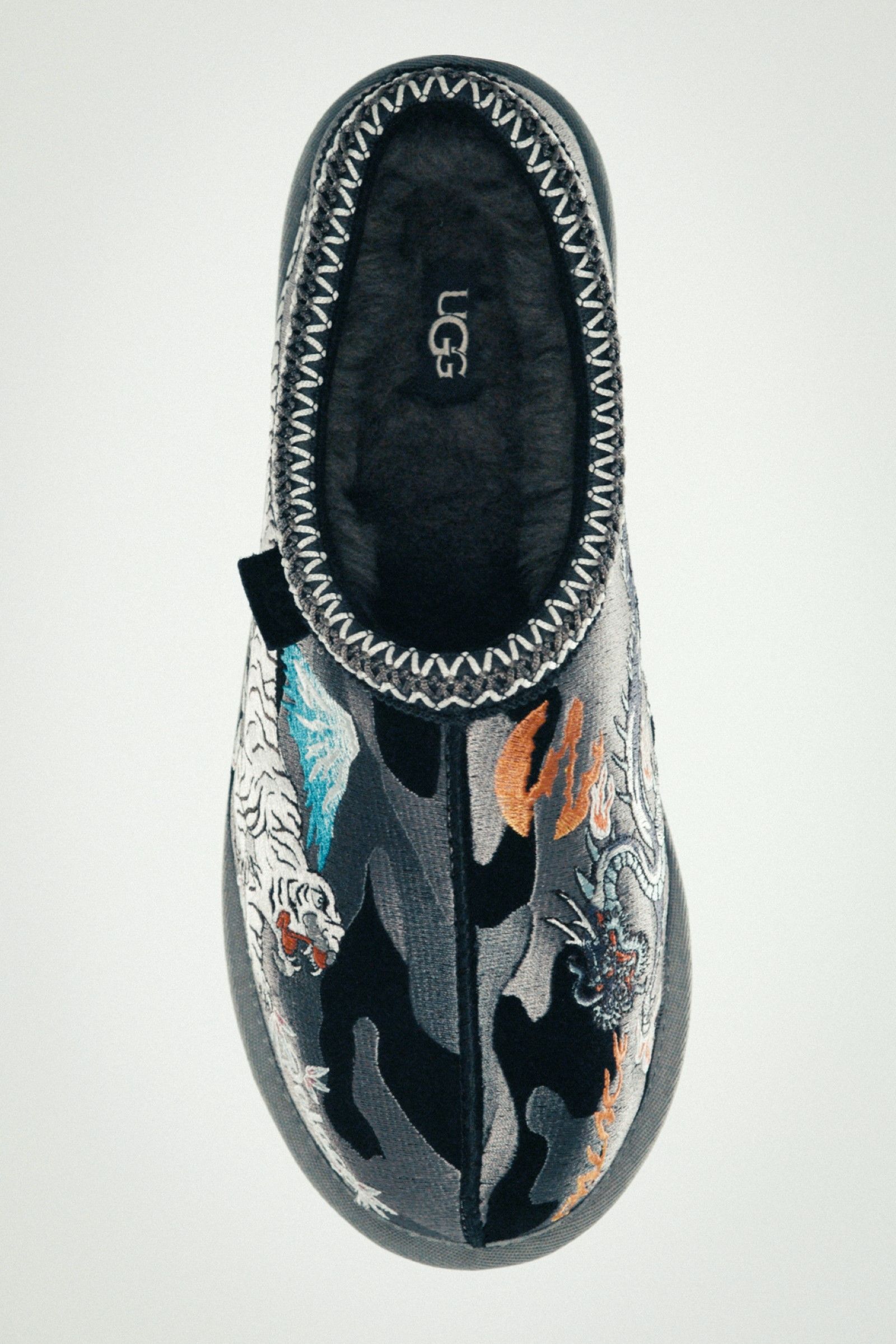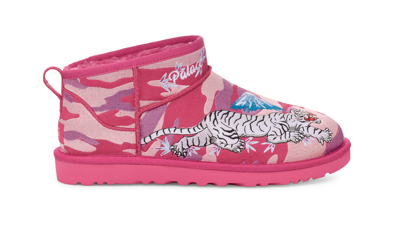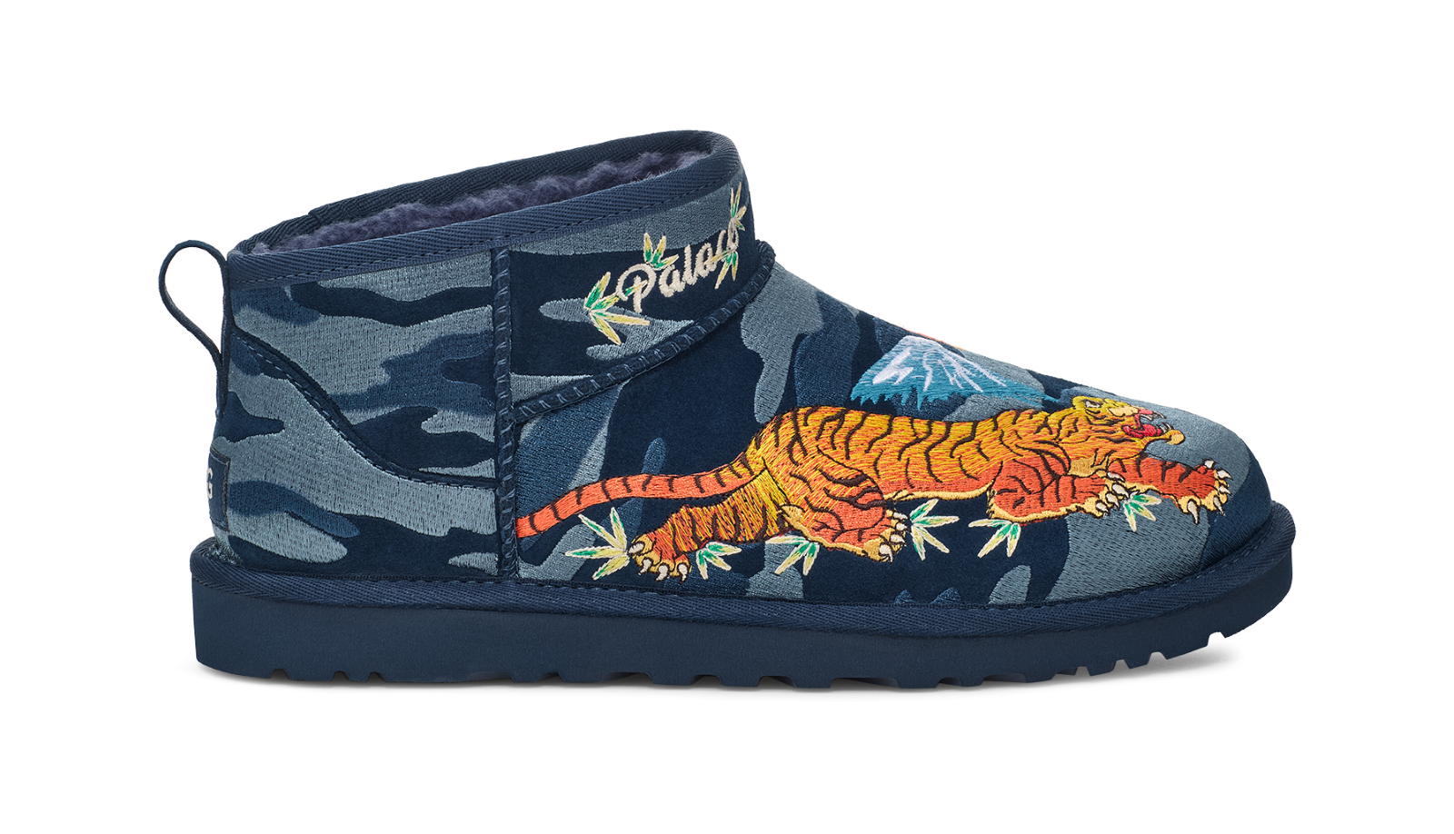 Available from December 6, the collection reinterprets some of UGG's iconic models, including the Tasman mule and, for the first time, the Classic Ultra Mini. These pieces are transformed with intricate multi-layered embroidery, bringing cultural concepts to life in a wearable and innovative way. The collection also includes a brand-new piece, the UGG Palace Jacket, made of soft suede with shearling lining. The jacket stands out for its embroidered sleeve details, exposed shearling edges, and Palace’s intertwined “P” logo on the back, making it a highlight of the line. Completing the collection are the bucket hat and tote bag, practical and refined accessories that express the unmistakable style of this collaboration.