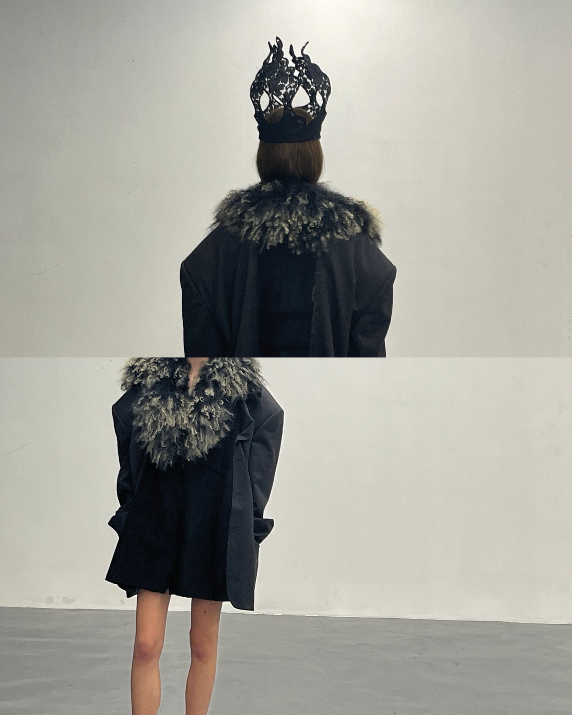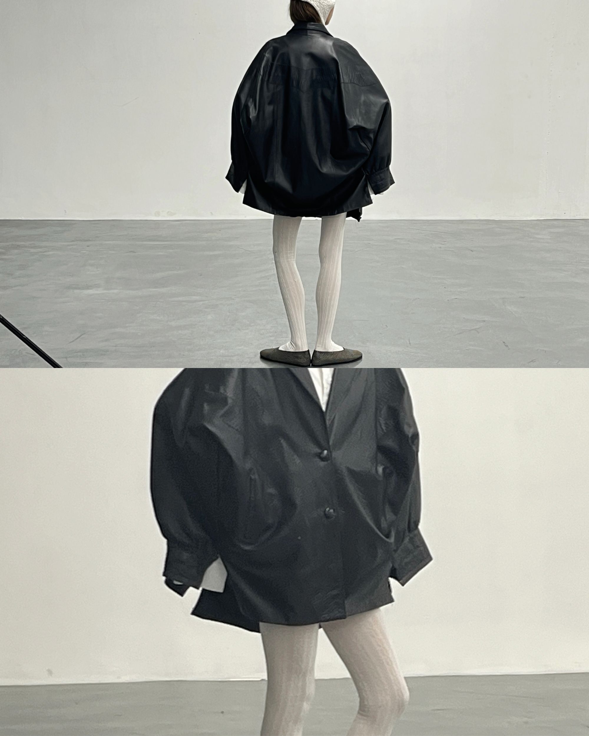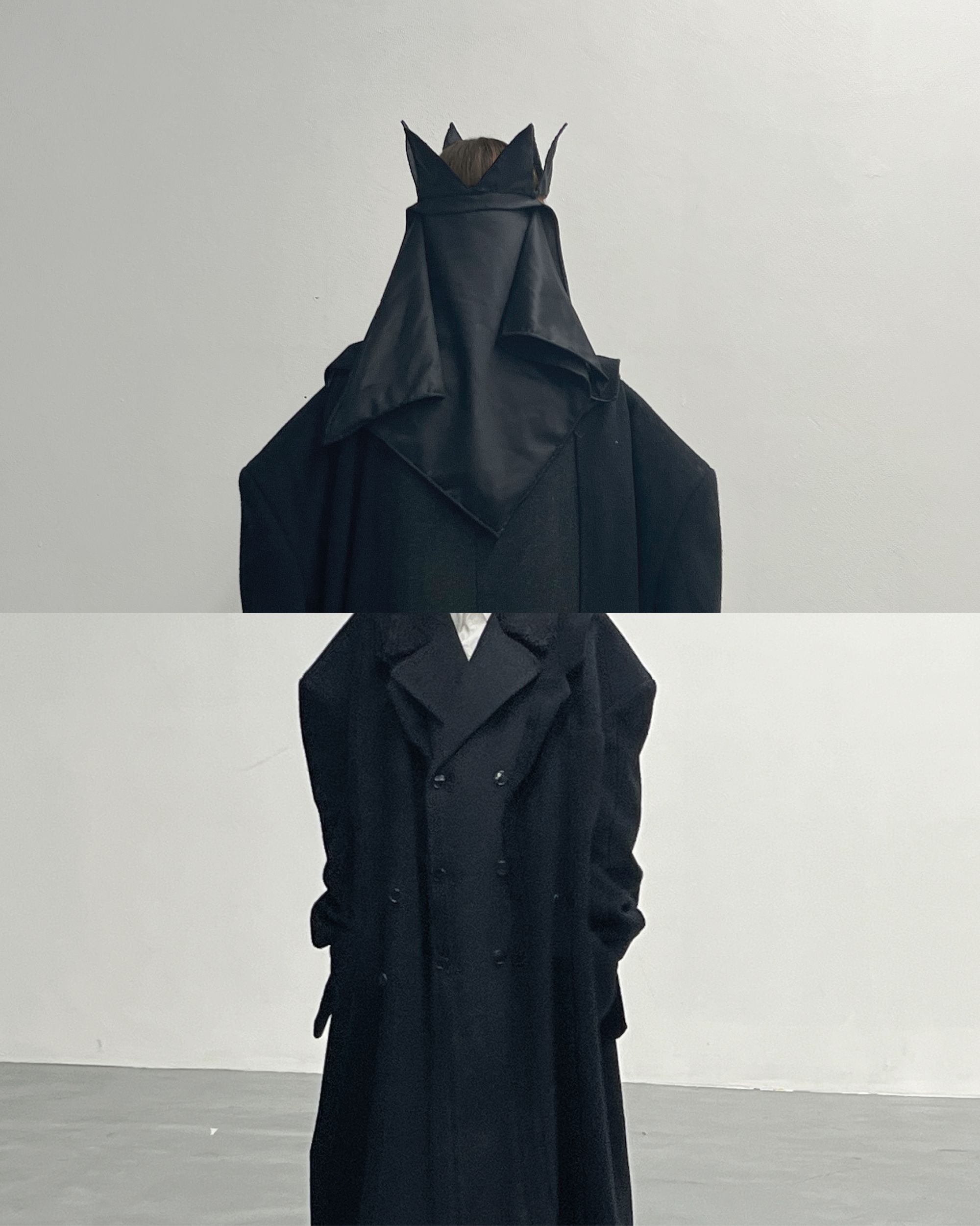 Dover Street Market Paris is transformed, for the occasion, into an imaginary farmhouse, a space capable of embracing the sweet and bitter memories evoked by the collection. The spaces are divided into evocative sections: le coin magique, la maison, la place, nature, and hay. The garments presented explore cocoon-like shapes where sleeves lose their original function, deconstructed and almost erased. They are not cages that limit movement but rather enveloping shells under which to rest. A nod to the festive days of farmers in the Po Valley, when, for a few hours, arms could relax, reaching out to a bowl of polenta or a glass of Lambrusco. The collection includes coats, shearling pieces, leather cloaks, shirts, and nightgowns. Each piece is unique. A special series of hats was created in collaboration with Bergamasque artist Patrizia Benedetta Fratus, daughter of the protagonist of the film L’Albero degli Zoccoli.