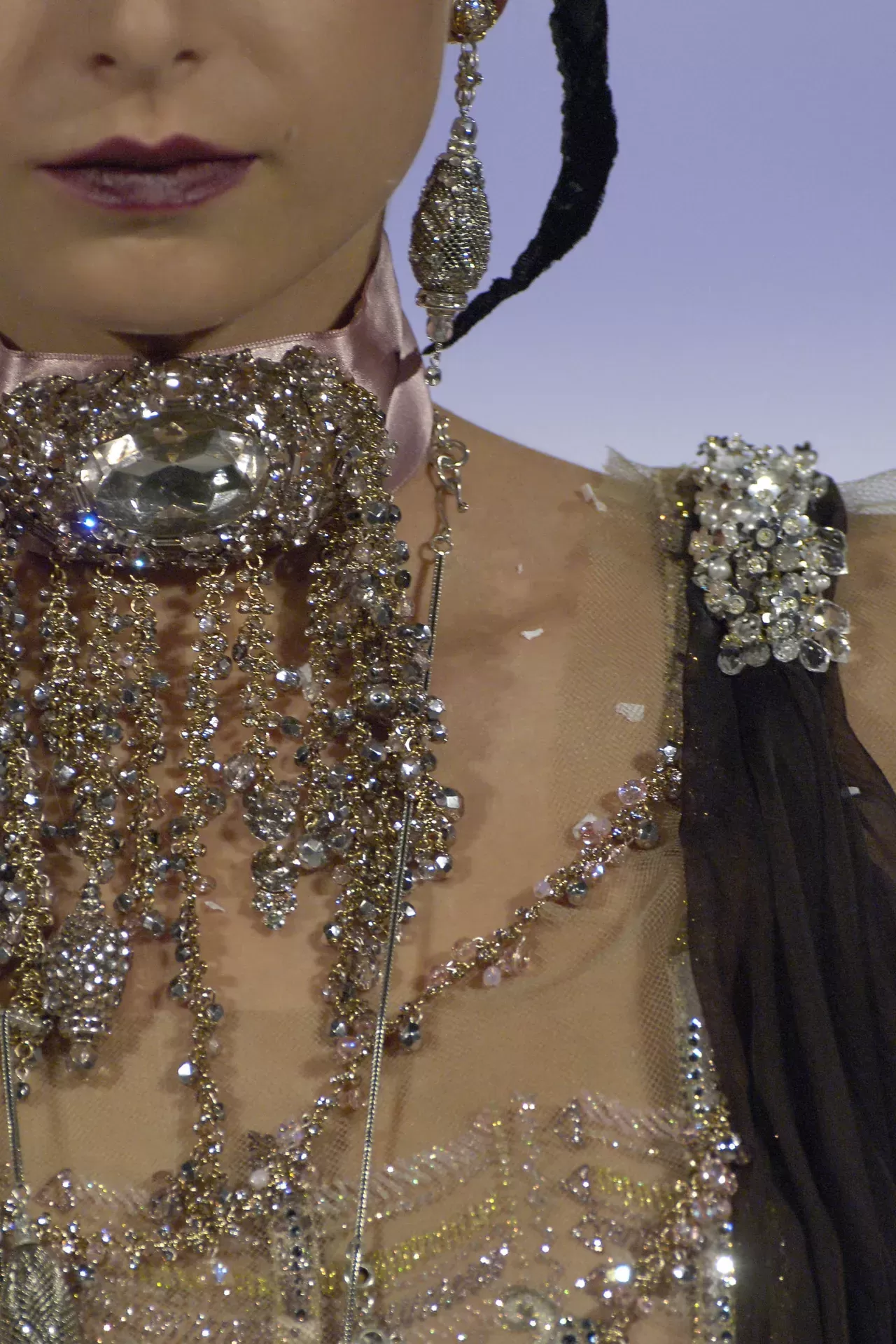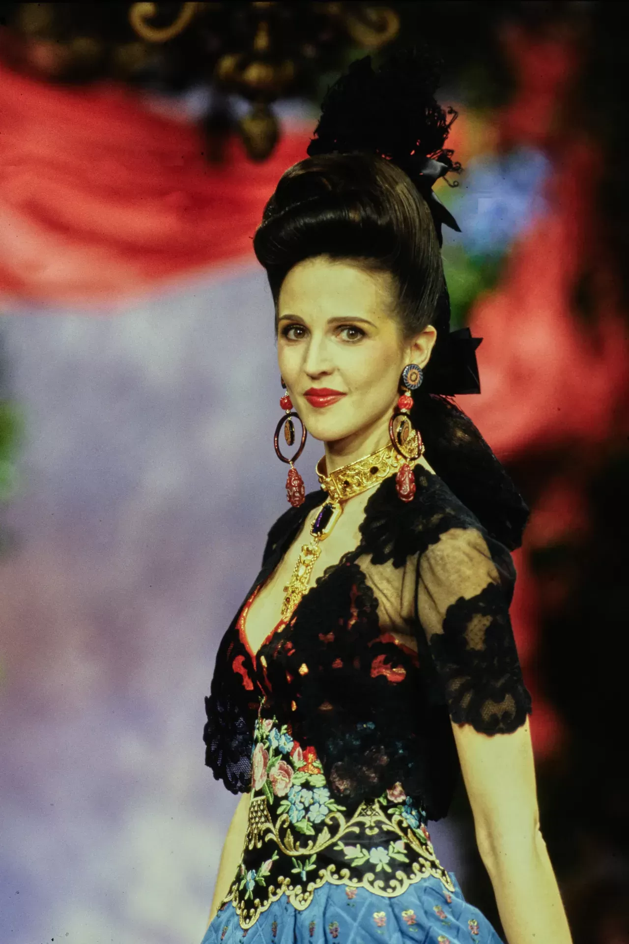 If Christian Lacroix's name still resonates more than a decade after his last collection, it is also thanks to the attention to jewelry and accessories that became his signature. The opulence of hats, necklaces, gloves, belts, never apologizing for too much ornamentation: a testament to Lacroix’s belief that "more is more beautiful." Jewelry is integral to the brand’s DNA, with the first collection launched in 1989, just one year after ready-to-wear. The line between accessories and clothing is blurred at Lacroix: embroidery, pearls, and crosses sewn directly onto dresses... The textile and jewelry become one, shaping the very definition of the Lacroix look, which spares no effort in its myriad of accessories.