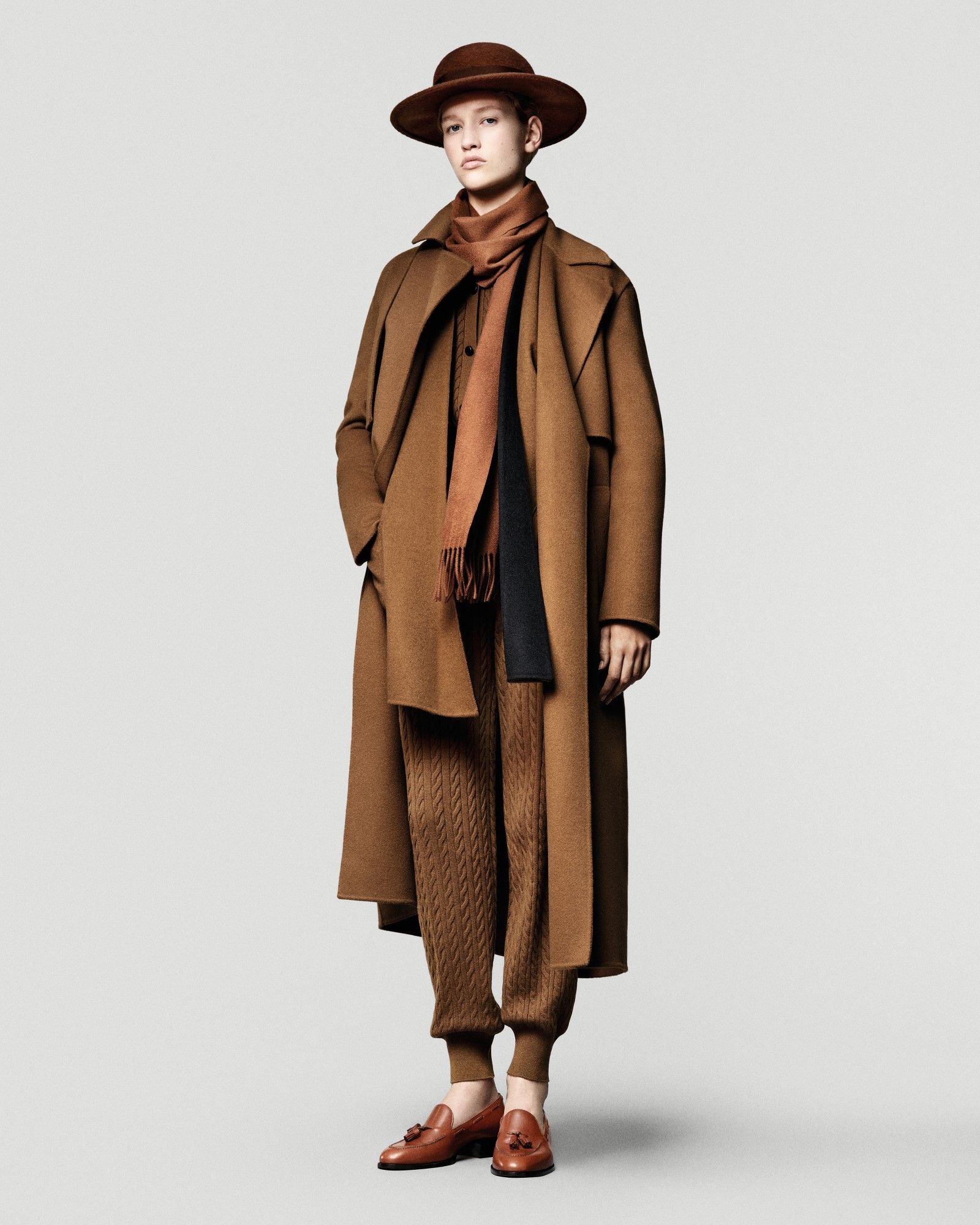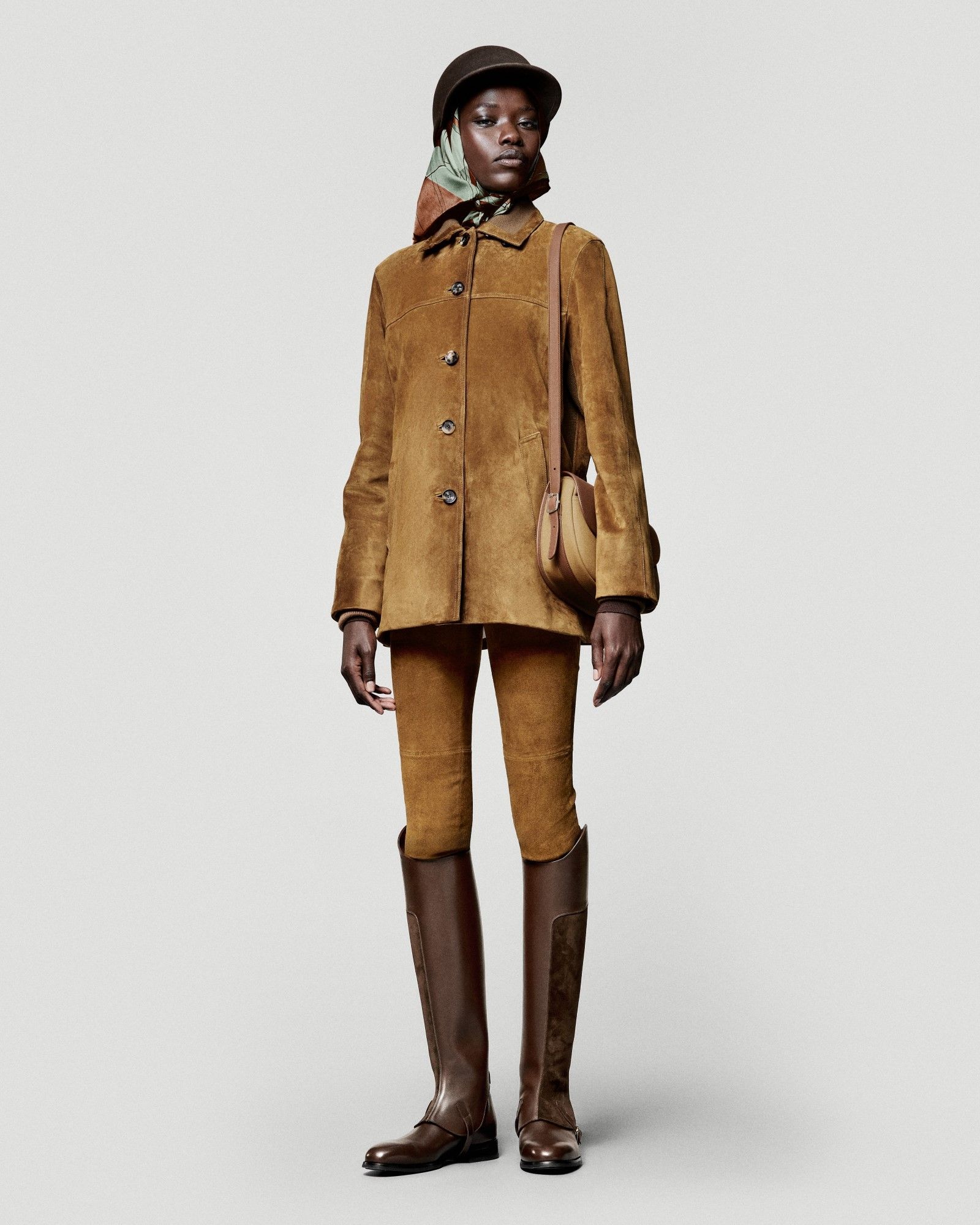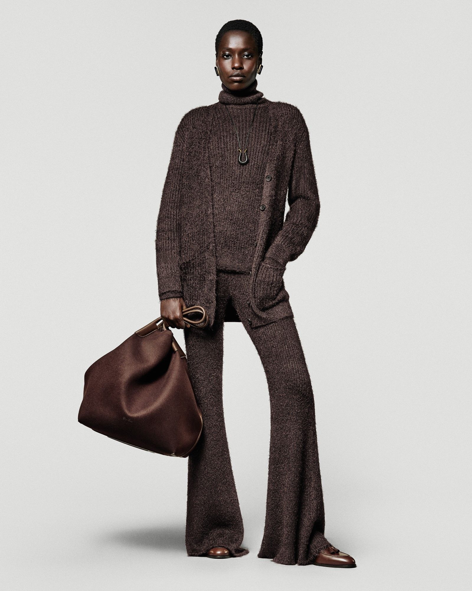 The men’s line follows the same geographical and conceptual journey. The garments, both soft and structured, emphasize practicality without compromising elegance. Relaxed-fit trousers are designed to be tucked into equestrian boots, while the iconic Maremma jacket in cotton-cashmere returns as a standout piece in several looks. Quilted jackets and parkas embrace the collection’s outdoor spirit, while formalwear takes on a softer approach with double-breasted suits and oversized overcoats. Natural tones range from Haze Melange green to Espresso and Fondue Fudge. In the evening, the collection becomes more refined with black Spagna capes and classic tuxedo ensembles. Accessories, from foldable bags to new versions of the Loom Bag in Nubuck Zibeline, highlight the collection’s versatility and craftsmanship with their effortlessly poetic appeal.