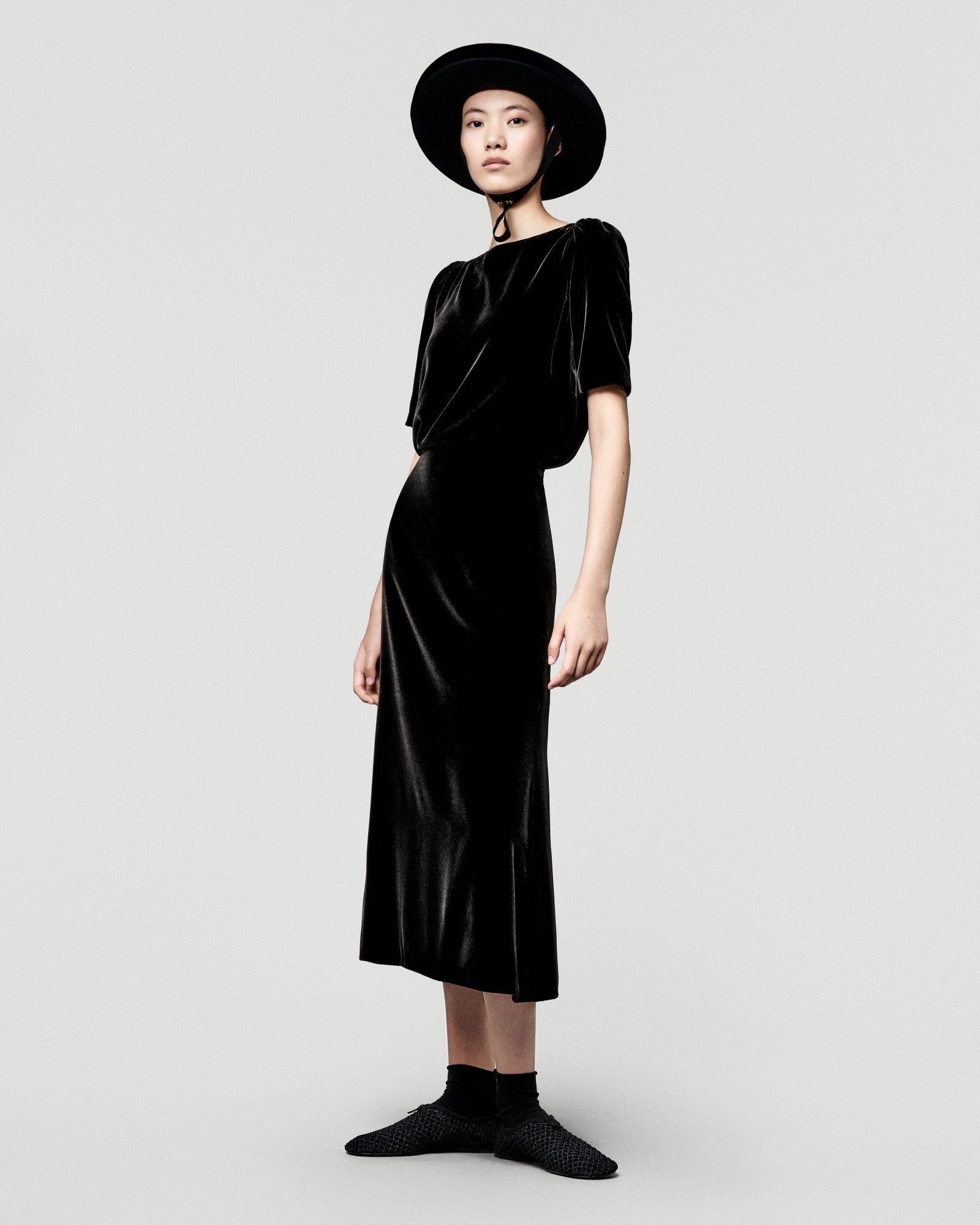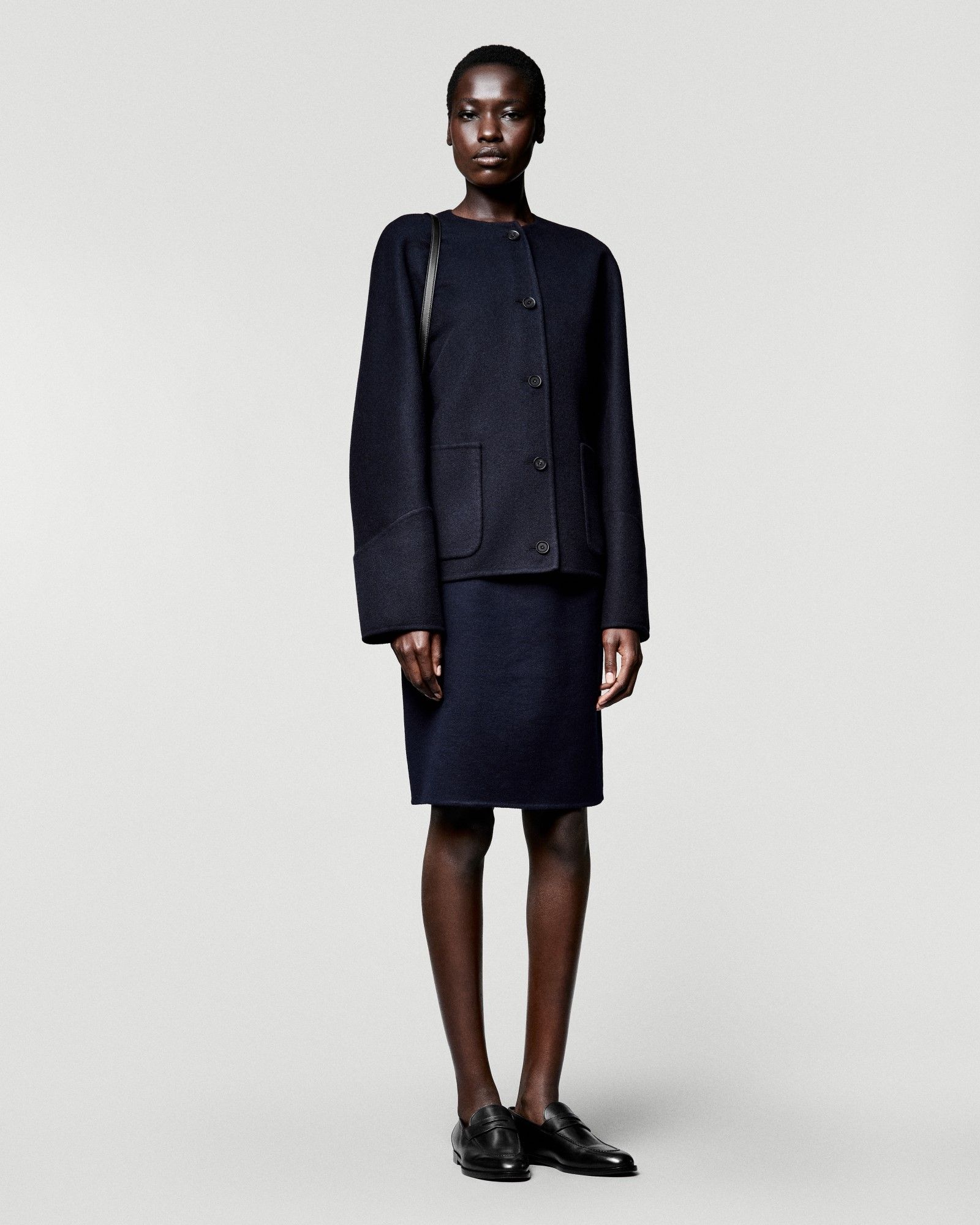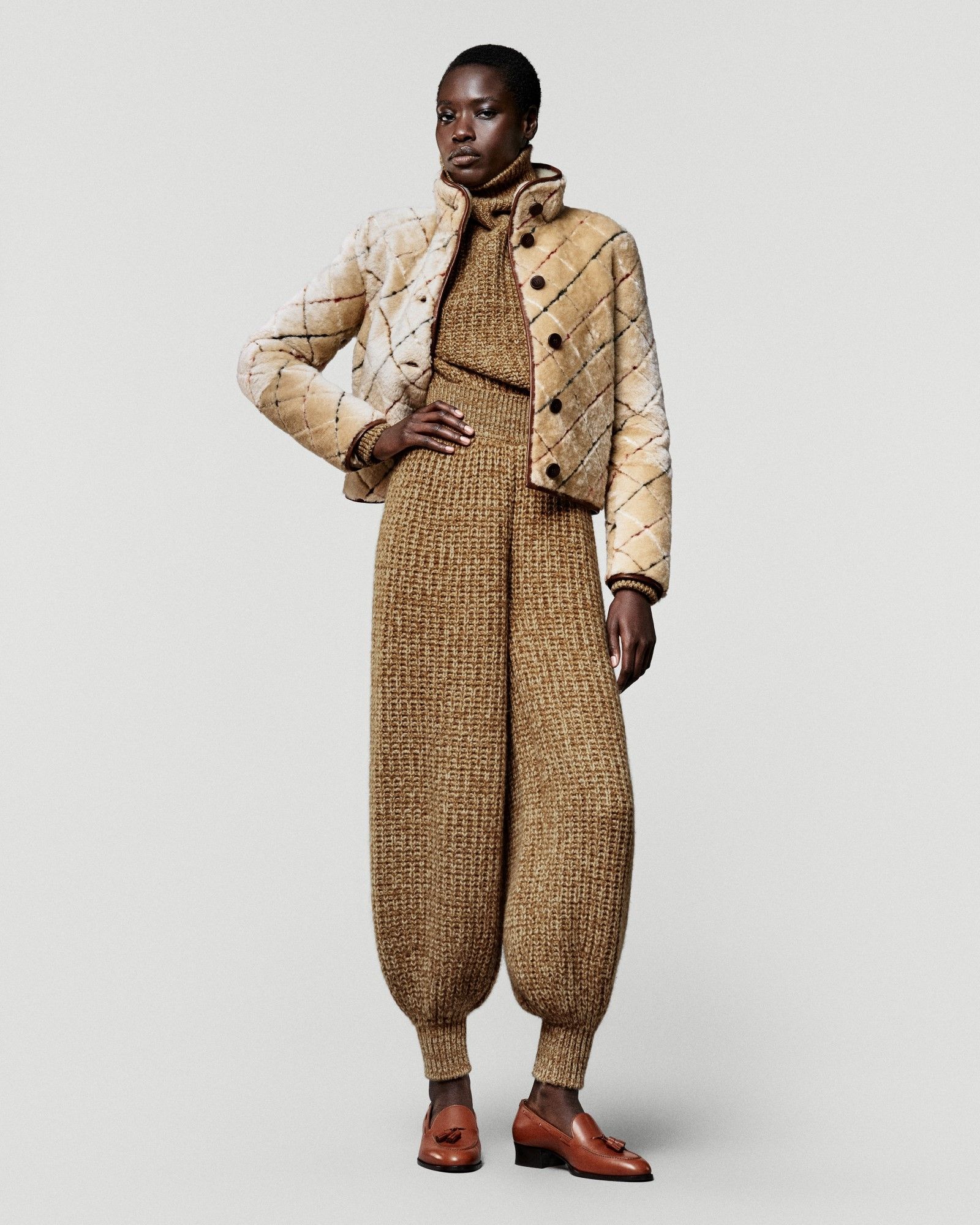 The men’s line follows the same geographical and conceptual journey. The garments, both soft and structured, emphasize practicality without compromising elegance. Relaxed-fit trousers are designed to be tucked into equestrian boots, while the iconic Maremma jacket in cotton-cashmere returns as a standout piece in several looks. Quilted jackets and parkas embrace the collection’s outdoor spirit, while formalwear takes on a softer approach with double-breasted suits and oversized overcoats. Natural tones range from Haze Melange green to Espresso and Fondue Fudge. In the evening, the collection becomes more refined with black Spagna capes and classic tuxedo ensembles. Accessories, from foldable bags to new versions of the Loom Bag in Nubuck Zibeline, highlight the collection’s versatility and craftsmanship with their effortlessly poetic appeal.