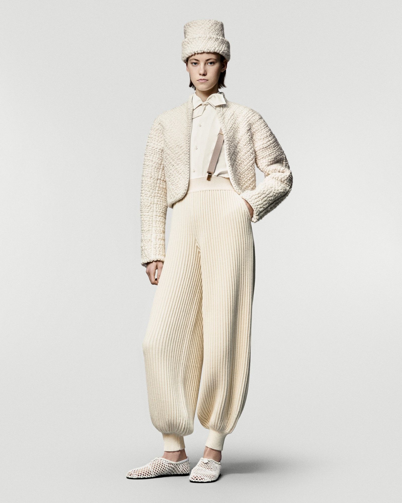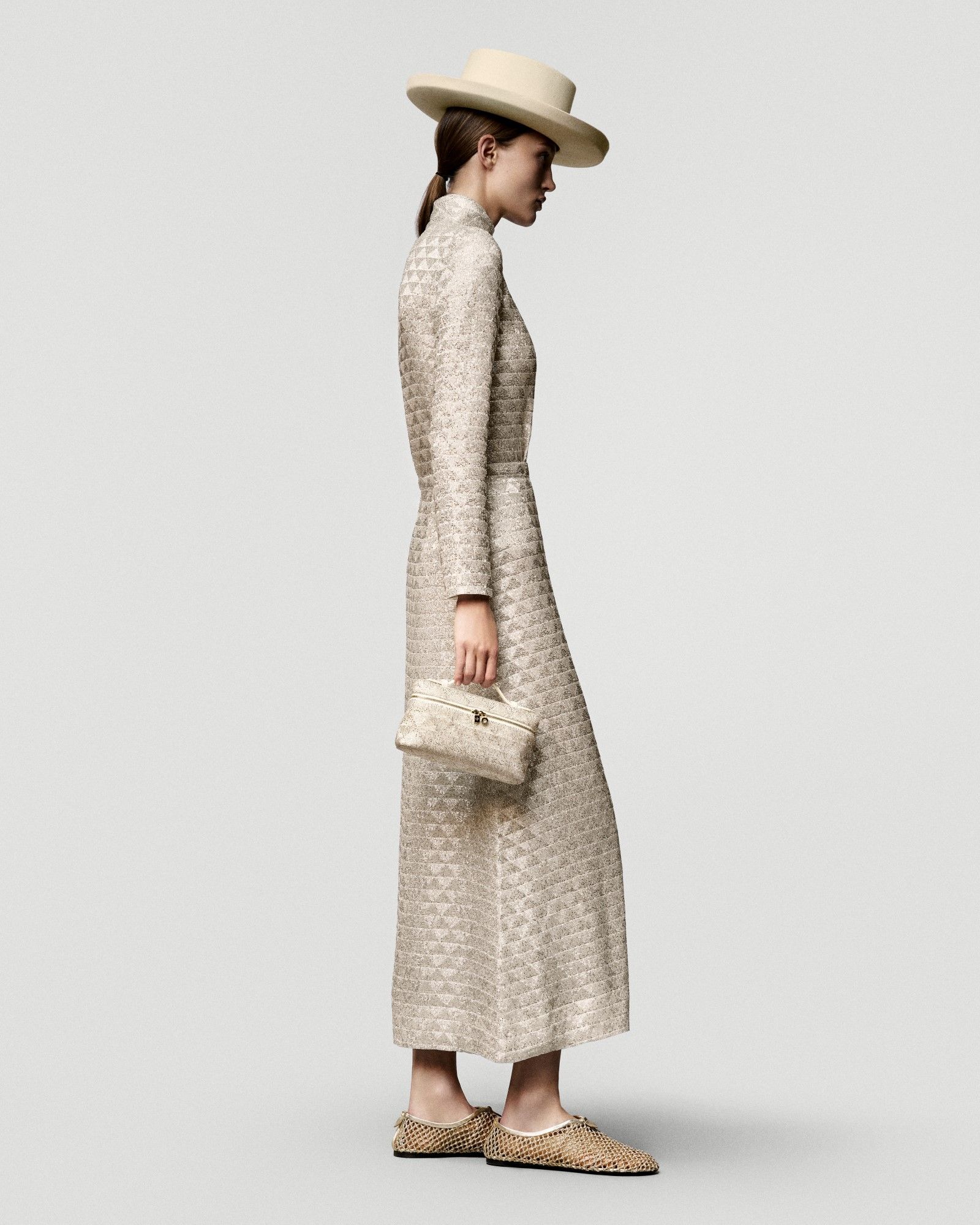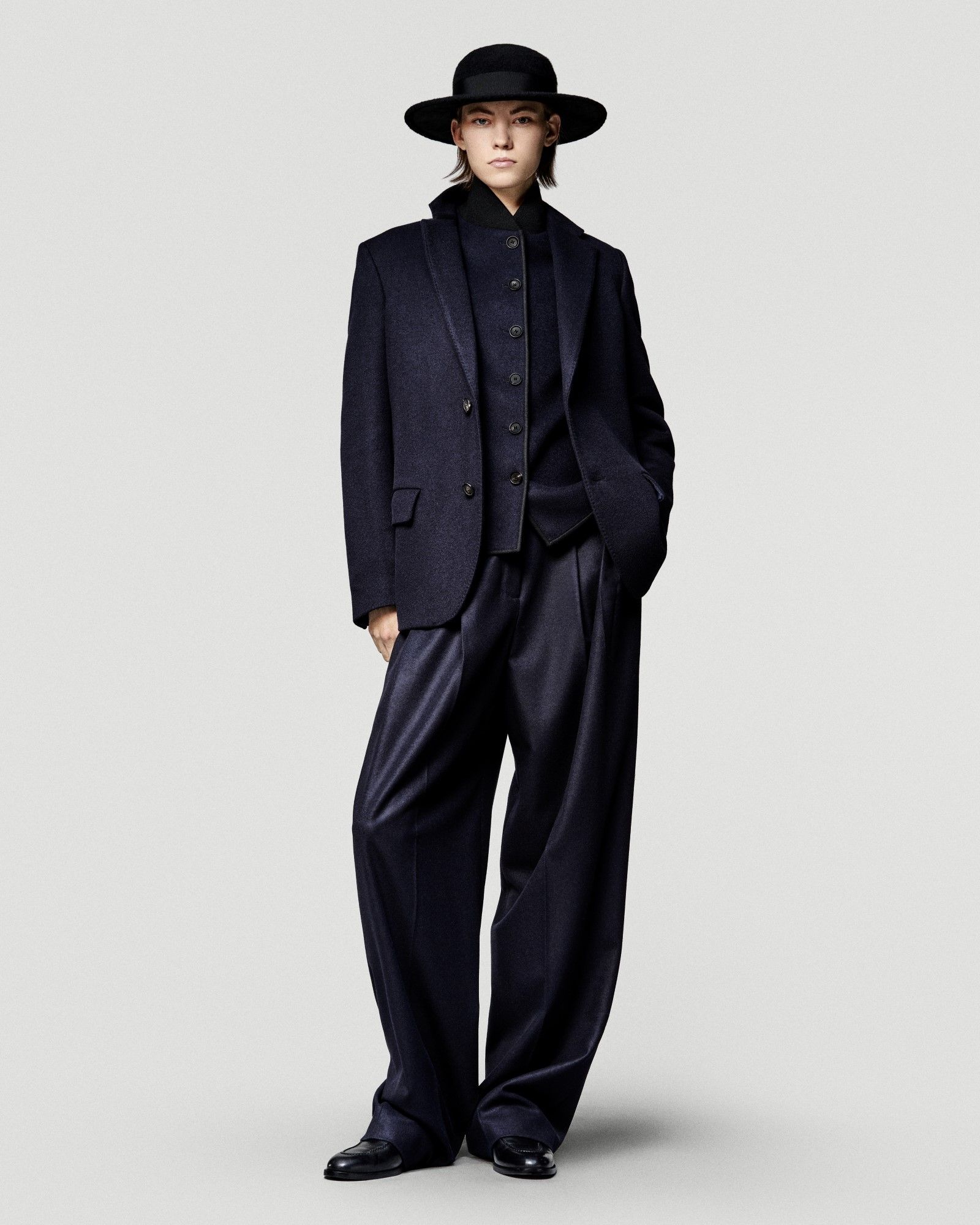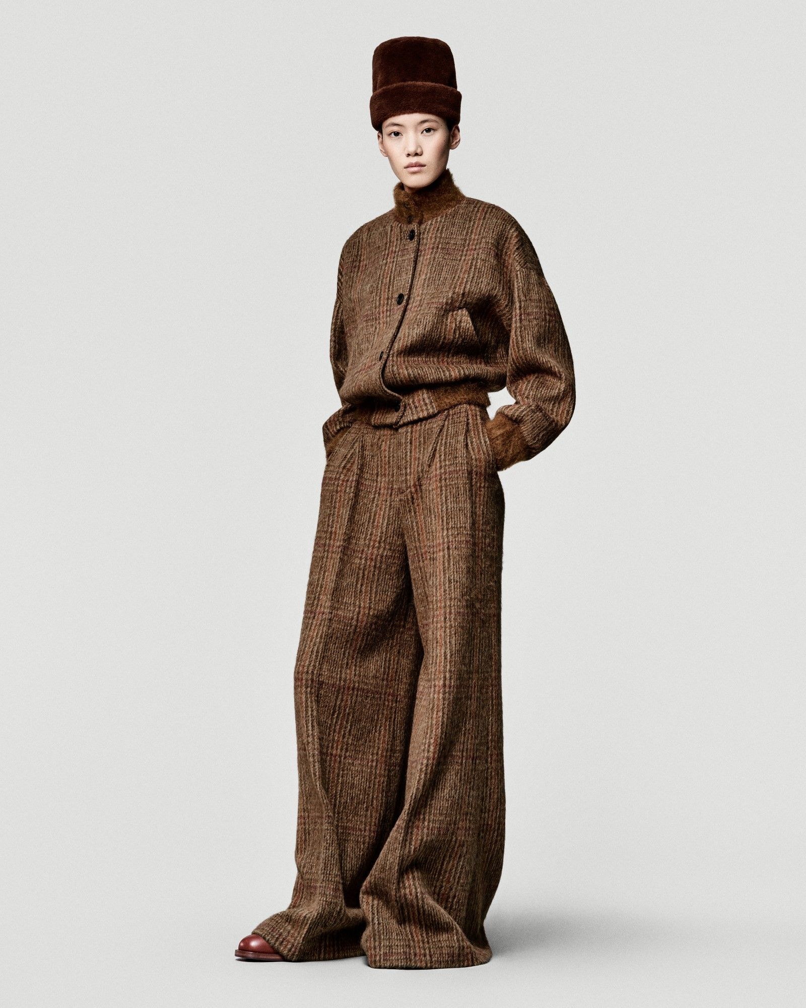 This season’s women’s collection is infused with a cosmopolitan spirit that spans Argentina, the Scottish Highlands, and the vast landscapes of Australia and New Zealand. Each piece tells a story of returning to the roots, with silhouettes that embrace the body’s movement and functional details inspired by equestrian traditions. Skirt-pants pay homage to Argentine heritage, while fabrics—ranging from bouclé to Merino wool, silk, and cashmere—are dyed in natural tones that highlight Loro Piana’s intricate dyeing techniques: dark brandy, vintage brown, creamy vanilla, vicuña, and navy blue. The iconic Spagna jacket is reimagined in a cropped version and as a pencil coat. Layered outfits play with ombré effects, while eveningwear channels the elegance of the opera with satin silk and jacquard in classic black and white. Accessories complete the look with soft bags like the new Extra Bag L23 and the Needle Bag, inspired by knitting needle cases, alongside equestrian boots crafted in collaboration with Le Chameau.